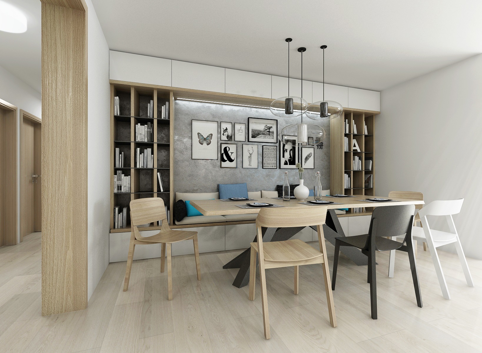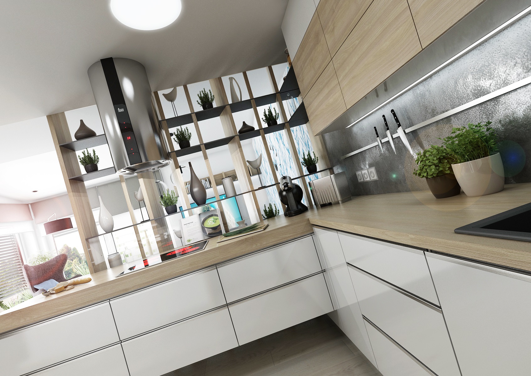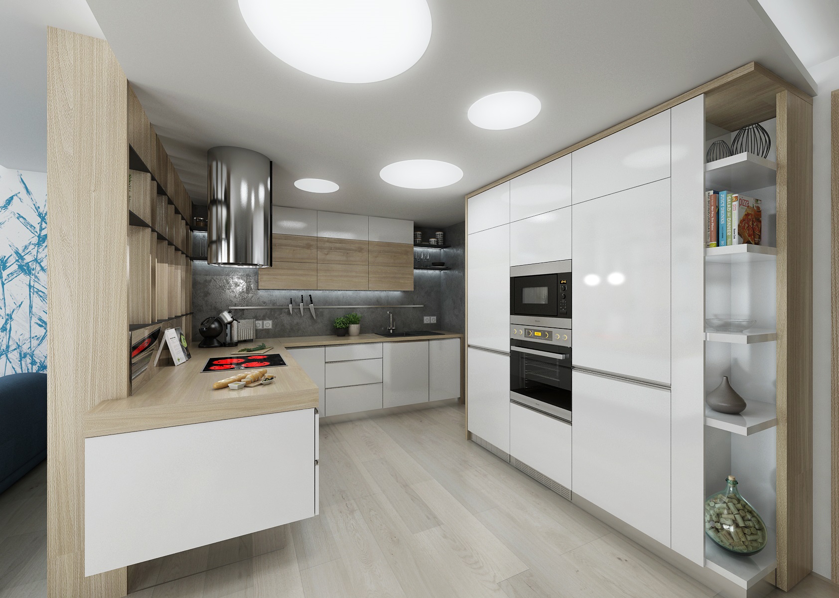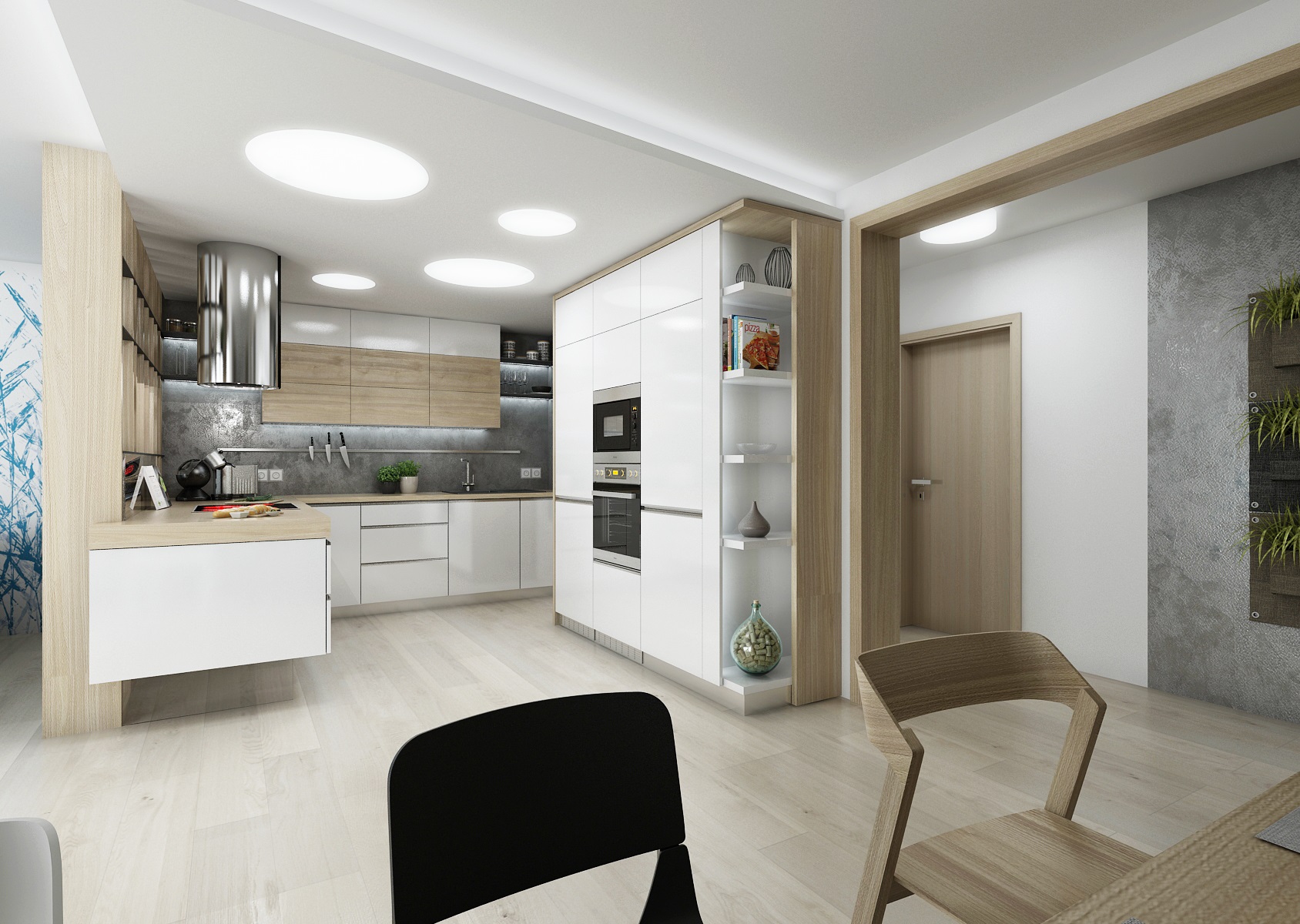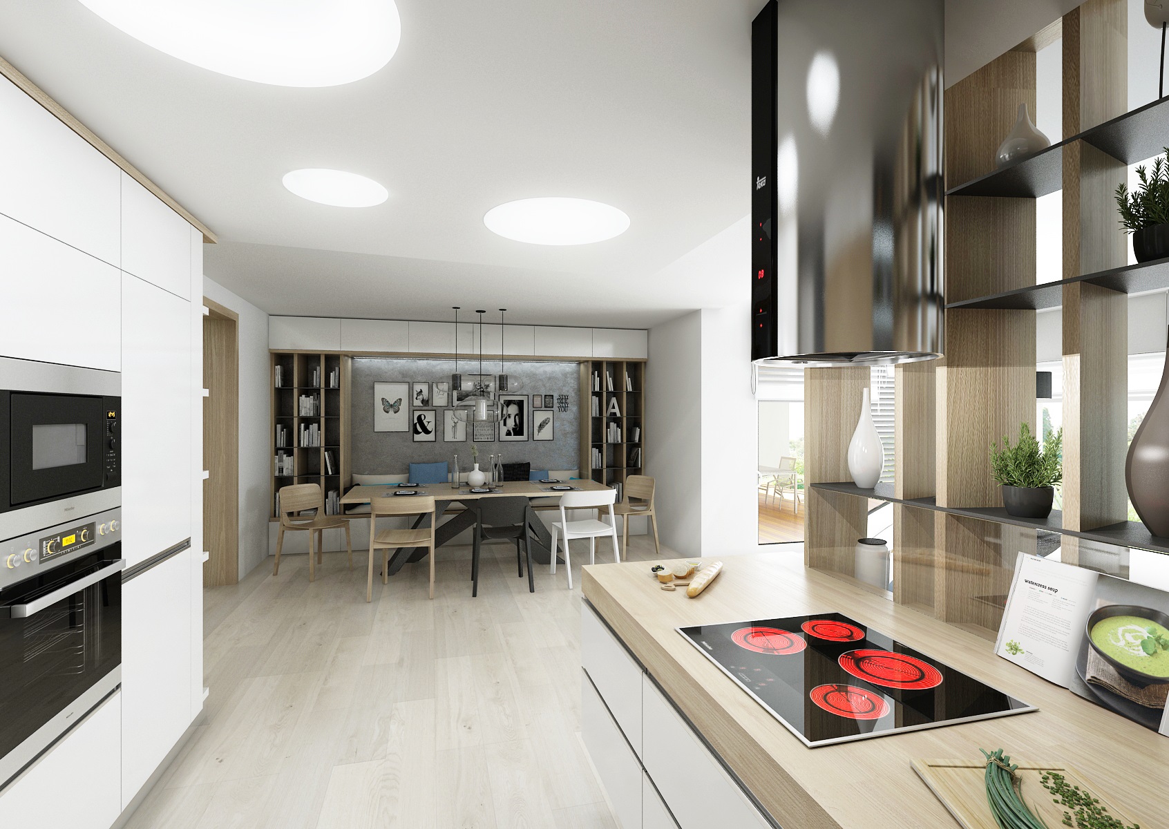 obývací části oddělena policovým systémem/knihovnou, která je přístupna z obou stran. Jde o dekorativní a praktický prvek, který zatraktivní místnost. Na polici je zavěšena do prostoru vybíhající část kuchyňské linky s varnou deskou, která díky použití skleněné podnože vypadá vzdušněji. Prostor kuchyně vymezuje i snížený strop. Design police se opakuje na provedení vestavné skříně s lavicí u jídelního stolu.