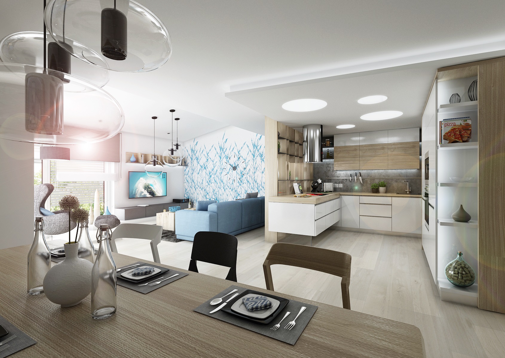 Společný prostor obývacího pokoje, kuchyně a jídelny
