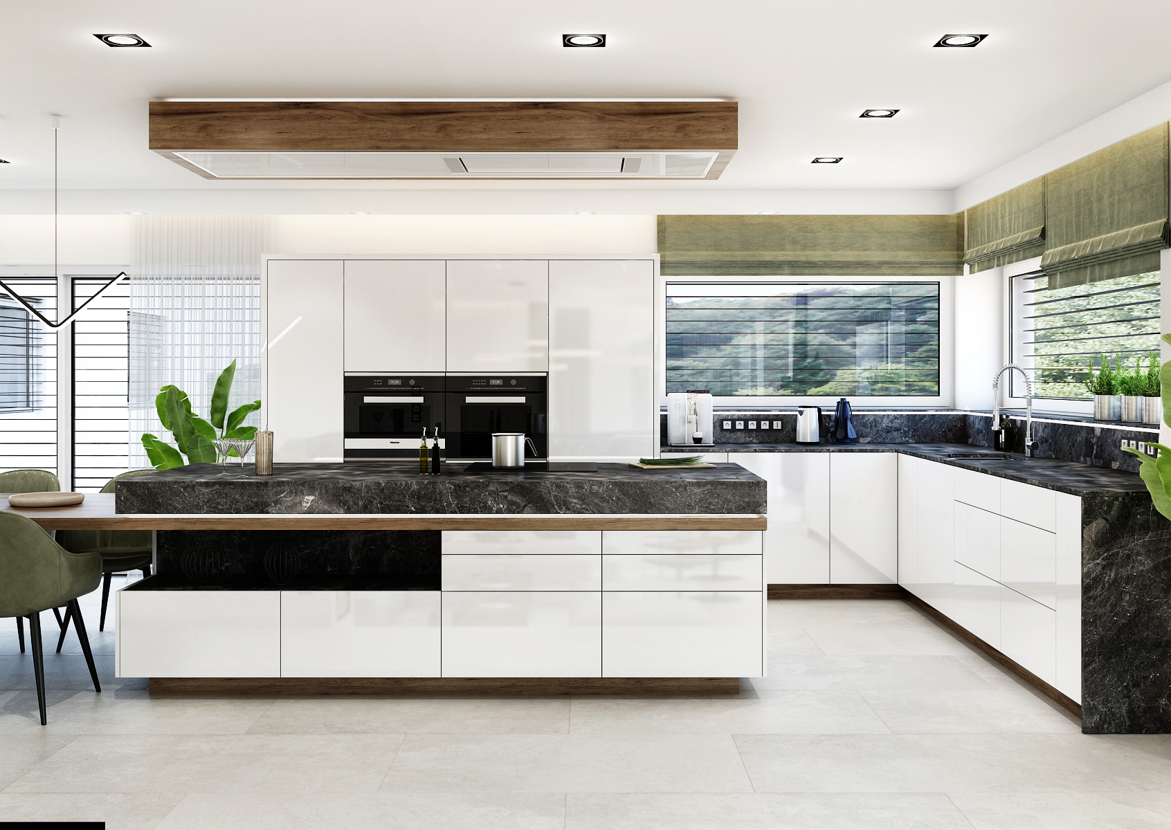 Kuchyně do tvaru L je v kombnaci polomatné bílé v podobě skříněk a černé kamenné pracovní desky.