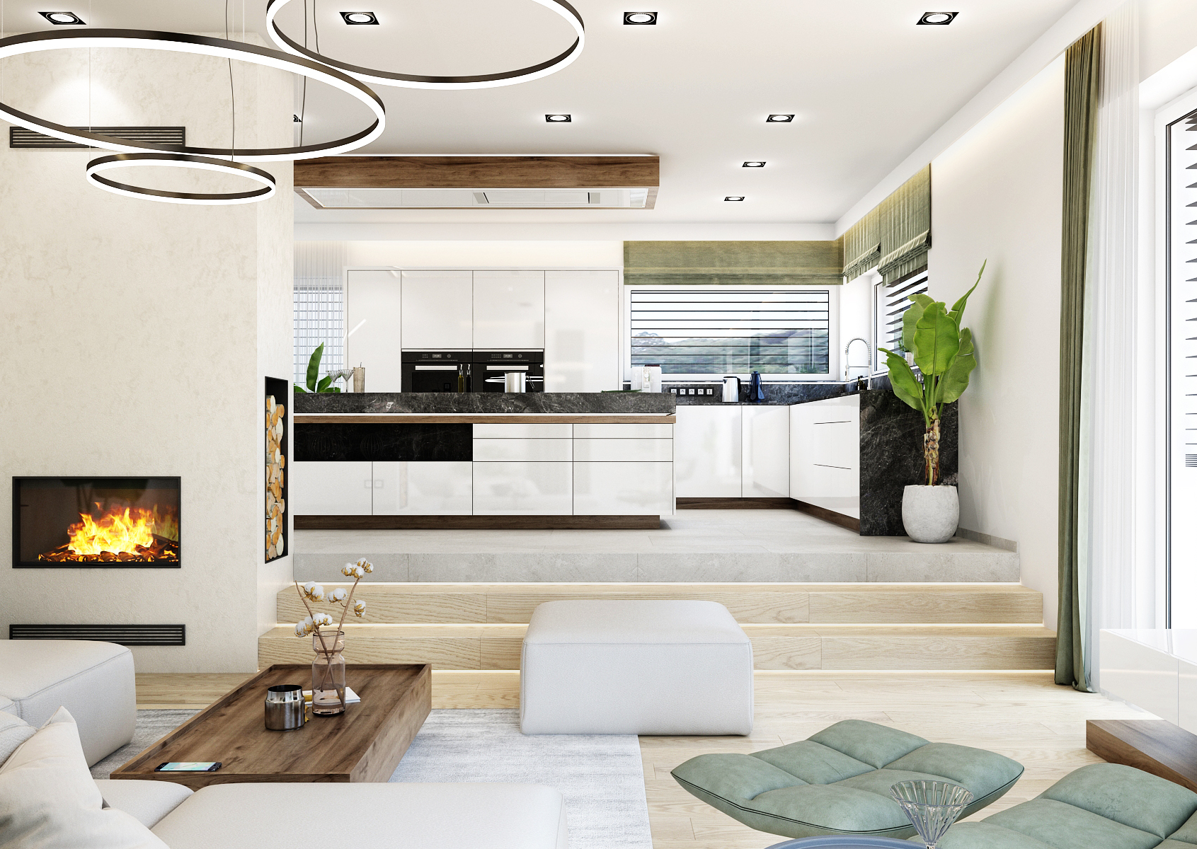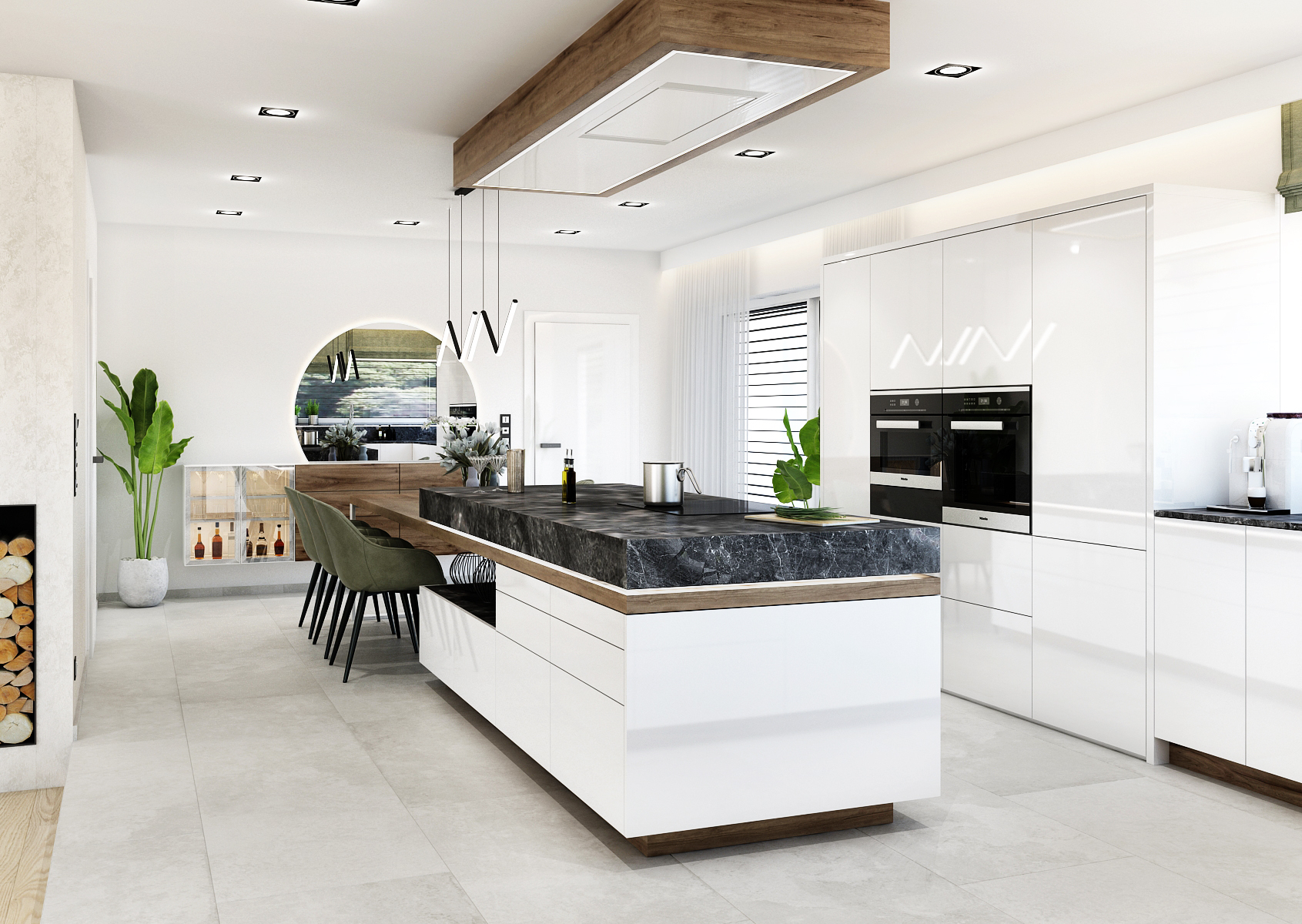 Základní pracovní prostor s vestavěnými spotřebiči doplňuje dlouhý kuchyňský ostrůvek s varnou deskou a stropní digestoří. Kuchyňský ostrůvek rovněž nabízí spoustu úložného místa, ať už v podobě prostoru pro odkládání věcí, nebo šuplíků a skříněk. Ostrůvek slouží zároveň i jako jídelní stůl díky zasazené ořechové desce.