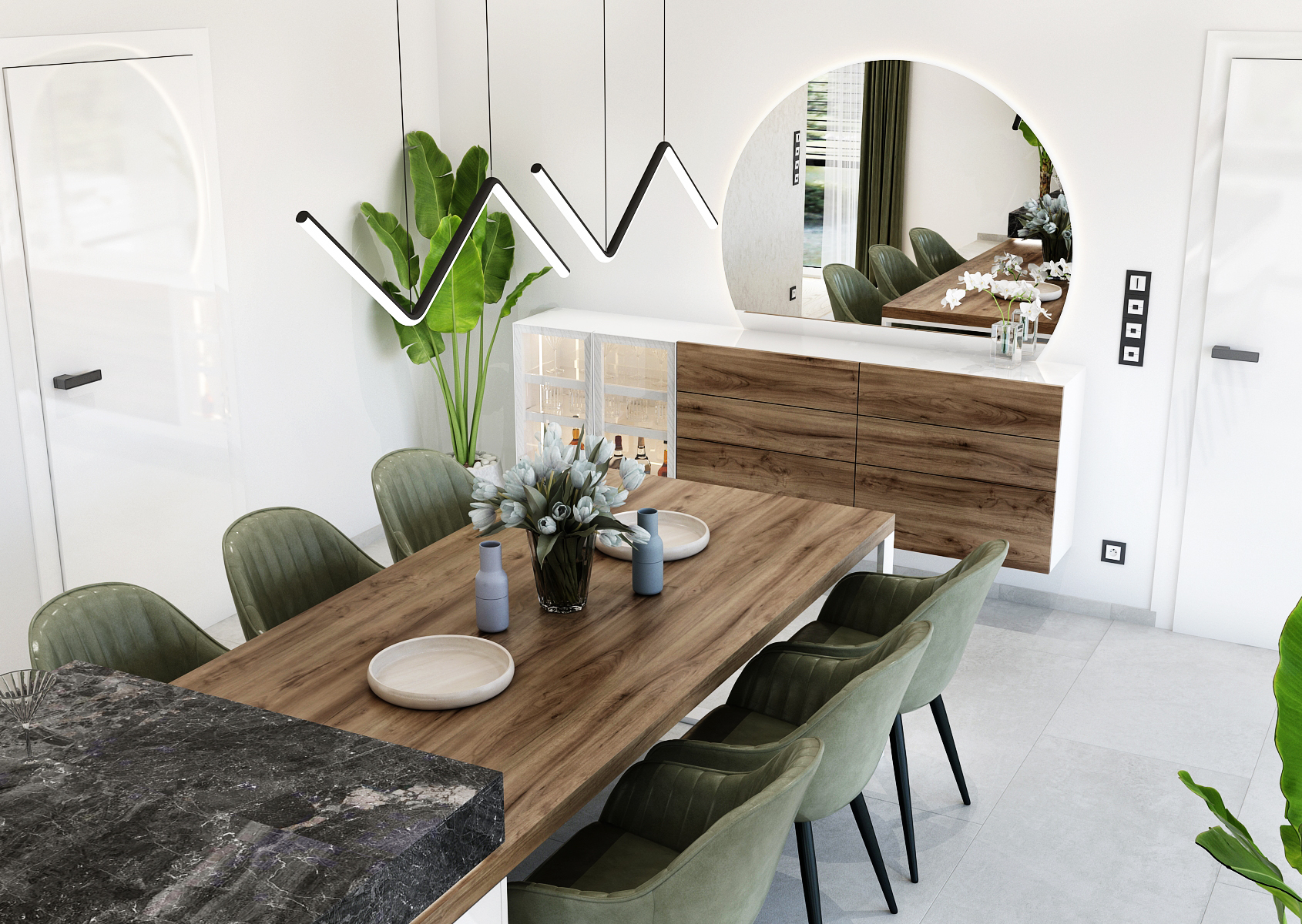 Část za jídelním stolm, který je doplněn o zelená čalouněná jídelní křesílka, je doplněna o komodu s prosklenou vitrínou s podsvícením na prémiový alkohol. Kruhové zrcadlo prostor opticky zvětšuje.