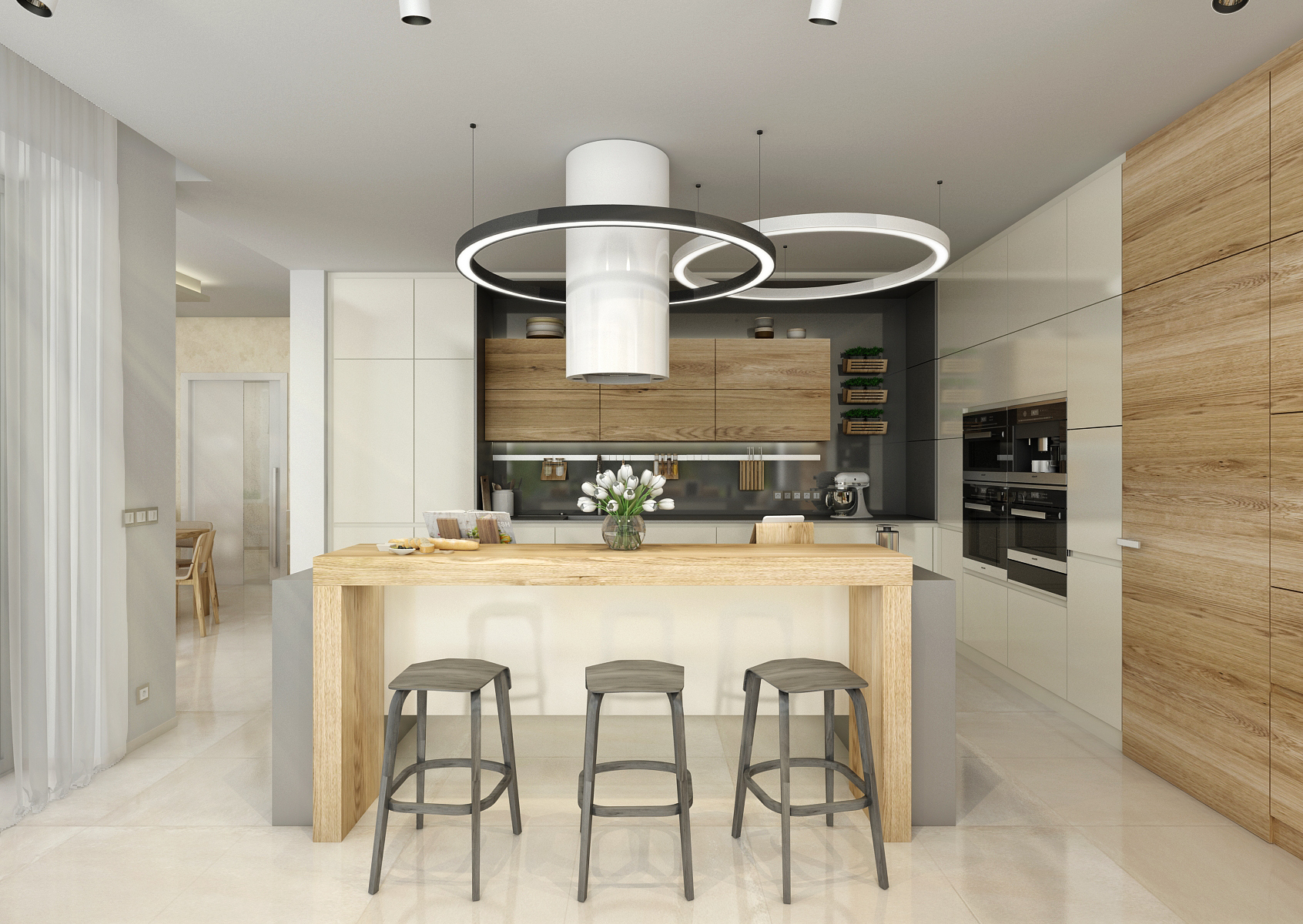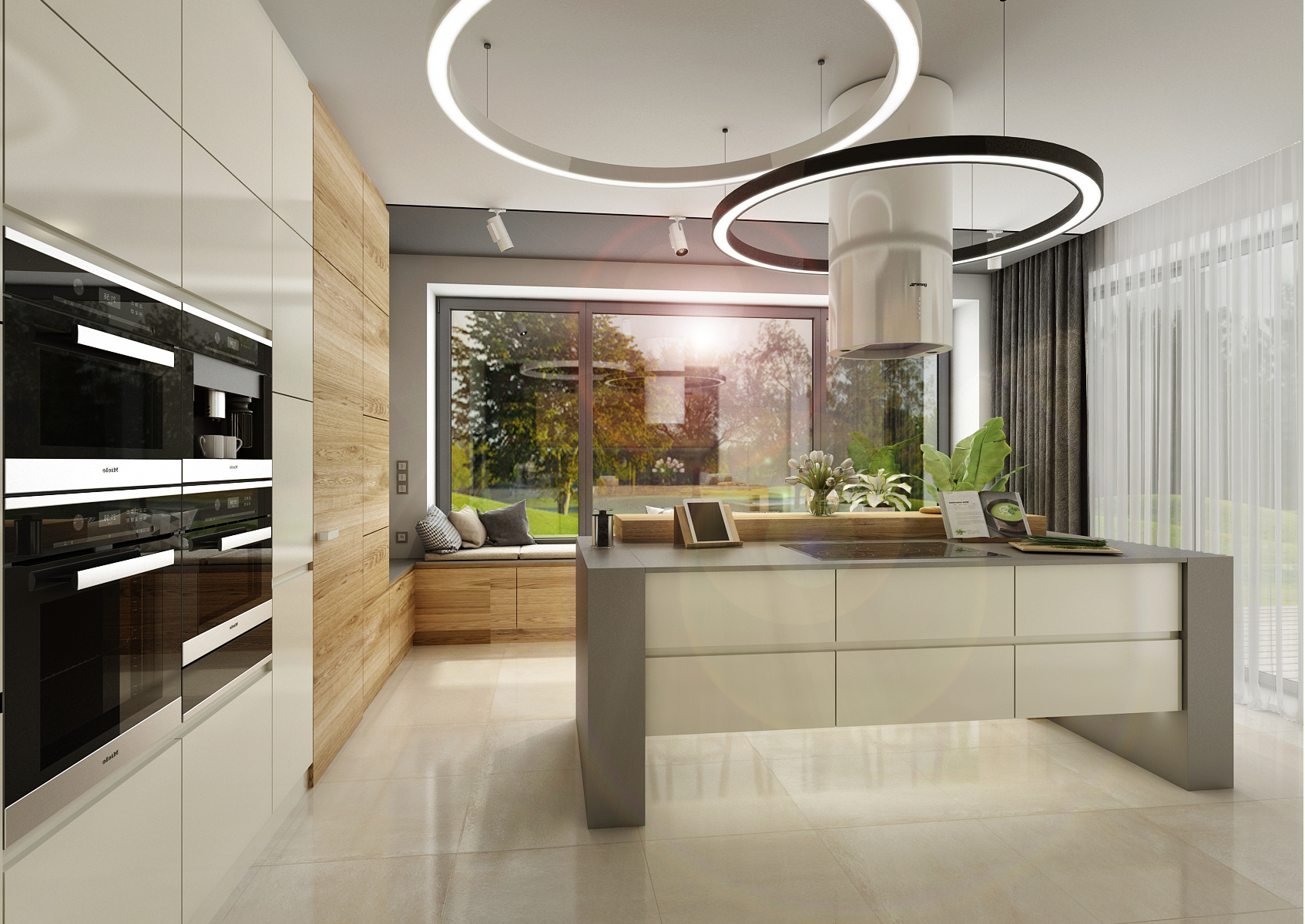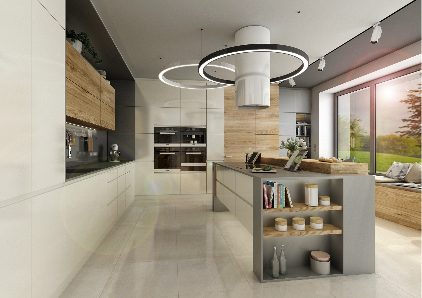 Rohová kuchyně s varným ostrůvkem se rozprostírá na ploše zhruba 30 m2. S nábytkovou stěnou s vestavnými spotřebiči diskrétně splynuly dveře do spíže. Velká plocha nábytku je „rozbita“ různorodostí použitého materiálu, barev i hloubkou skříněk – mělčí část s knihovnou přechází v lavici u parapetu okna s výhledem do zahrady. Toto posezení je jistě vítaným bonusem. Dominantou je kuchyňský ostrůvek s varnou deskou a barovým sezením. Jedno z kruhových stropních světel obtáčí zavěšenou digestoř. Stojné nohy ostrůvku jsou nejenom efektivně ztvárněným prvkem, ale i funkční. Ve své dutině ukrývá výsuvnou elektrickou zásuvky i odkládací police.