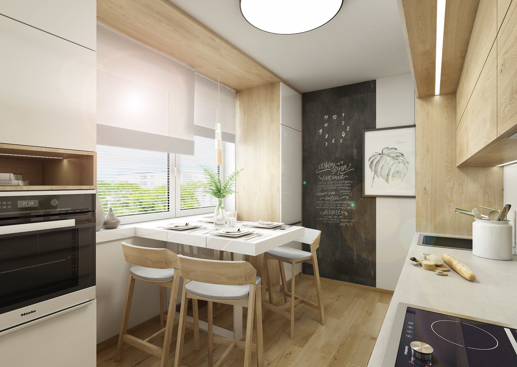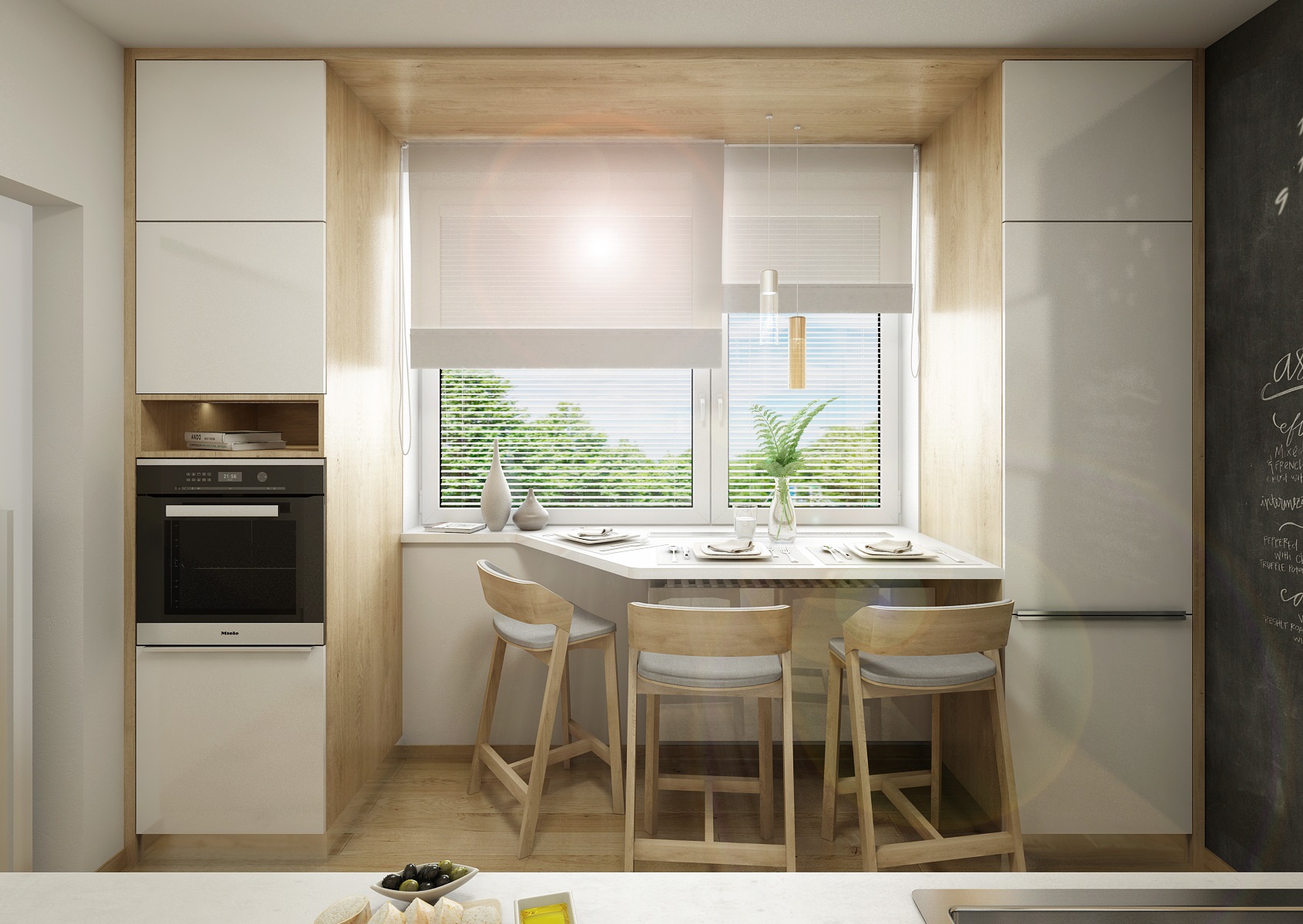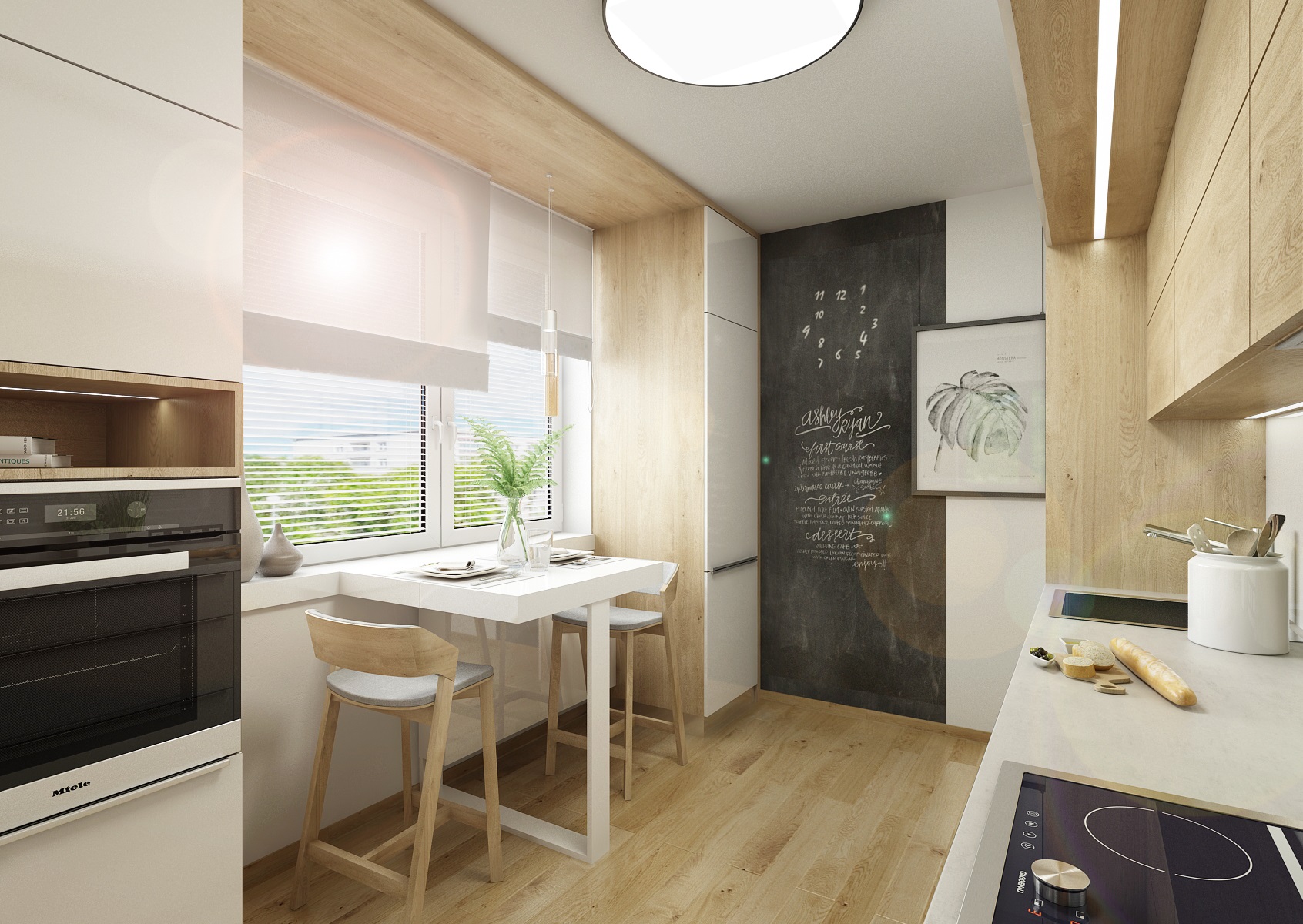 V malé kuchyni, na malém prostoru jsme se pokusili co nejlépe využít každý kousek dostupného místa. V hlavní zóně kuchyňské linky najdeme prostor pro přípravu pokrmů, dřez, varnou desku i malou vestavnou myčku. Protilehlá linka sestává z nábytkové vestavby s troubou, kombinovanou chladničkou a jídelního barového stolku, který tak využívá místo nad radiátorem. Prostor kuchyně je průchozí a nelze zde umístit klasický jídelní stůl, který by zasahoval do uličky.