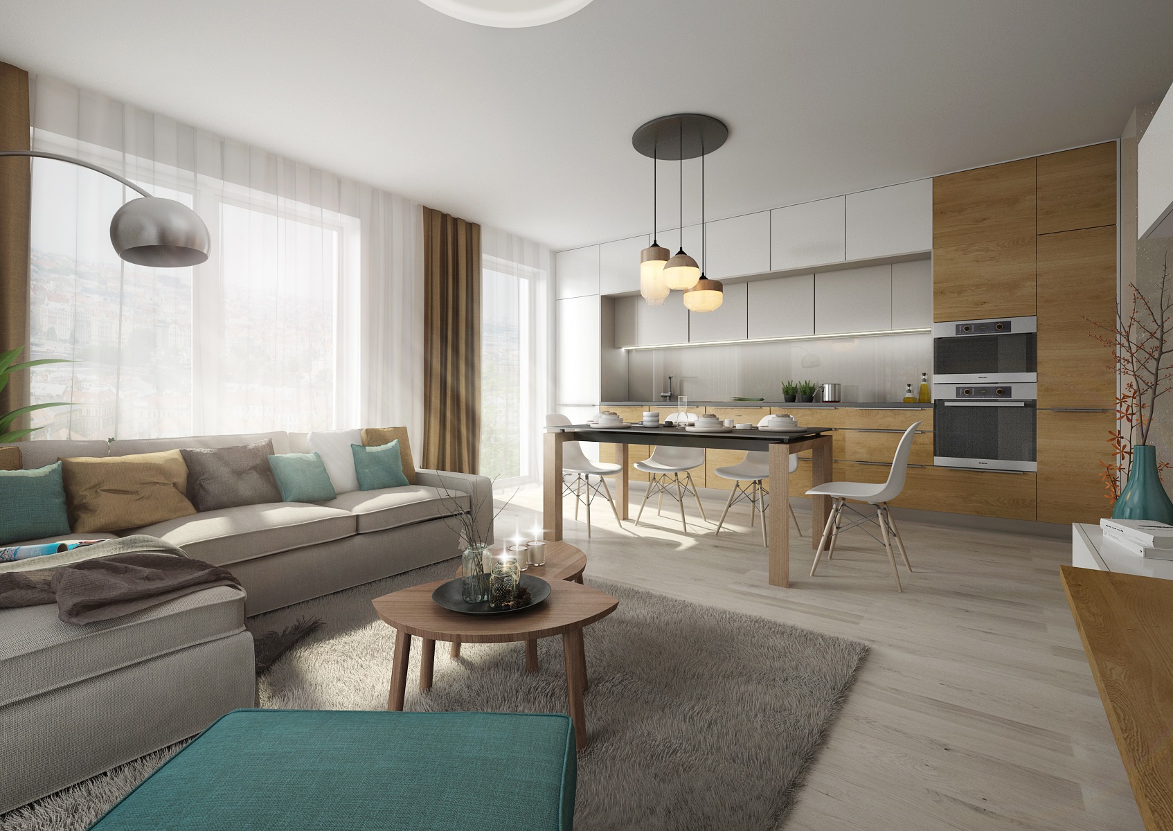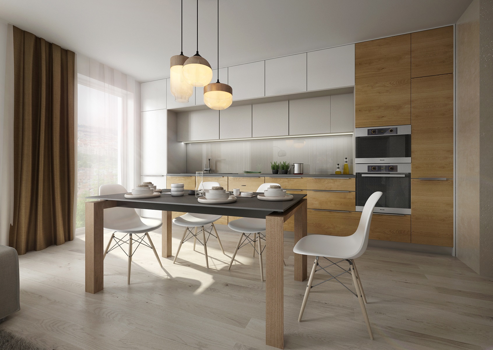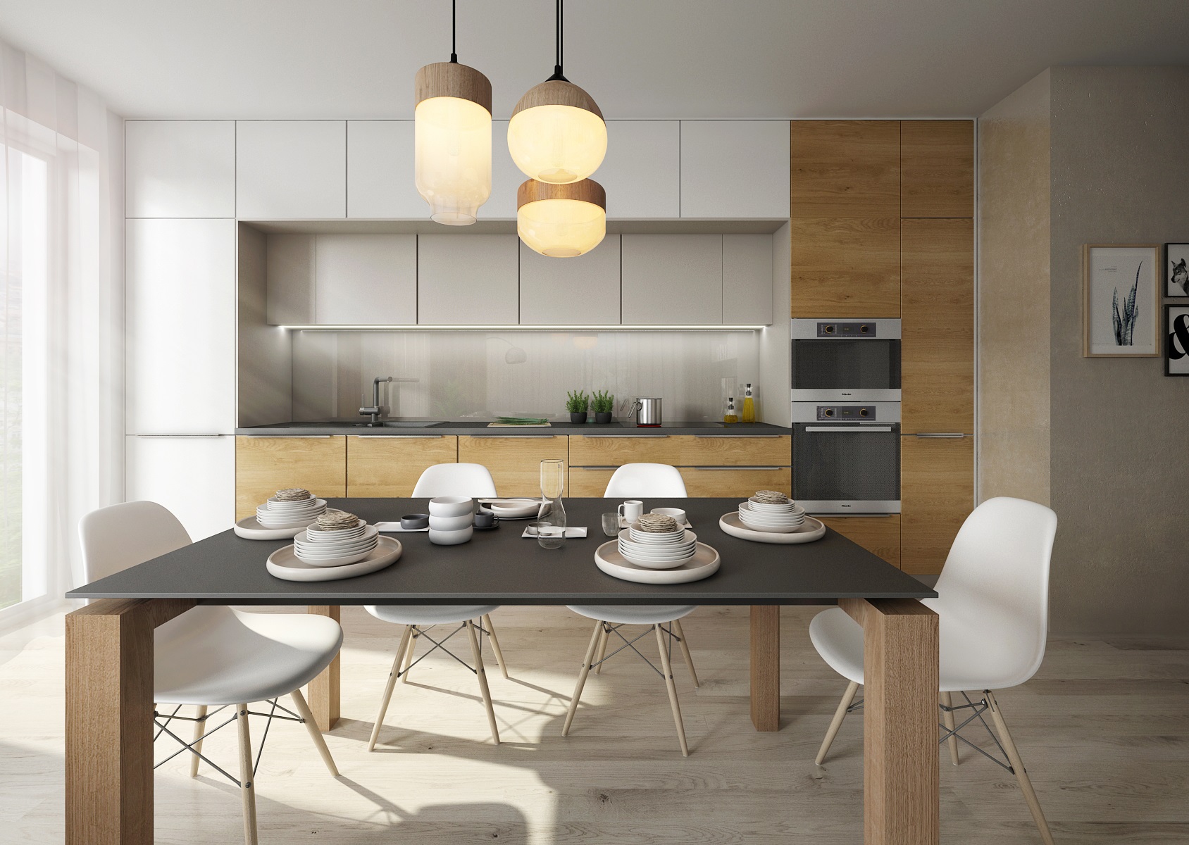 Skandinávská inspirace se odrazila v návrhu společných prostor kuchyně s obývacím pokojem. Byla použita kombinace bílé a více odstínů šedé barvy s dubovým dřevodekorem. Z umělého kamene použitého na kuchyňskou pracovní desku byla vyrobena i deska jídelního stolu s dřevěnou podnoží. Jednoduše zařízený interiér působí vzdušně a útulně zároveň.