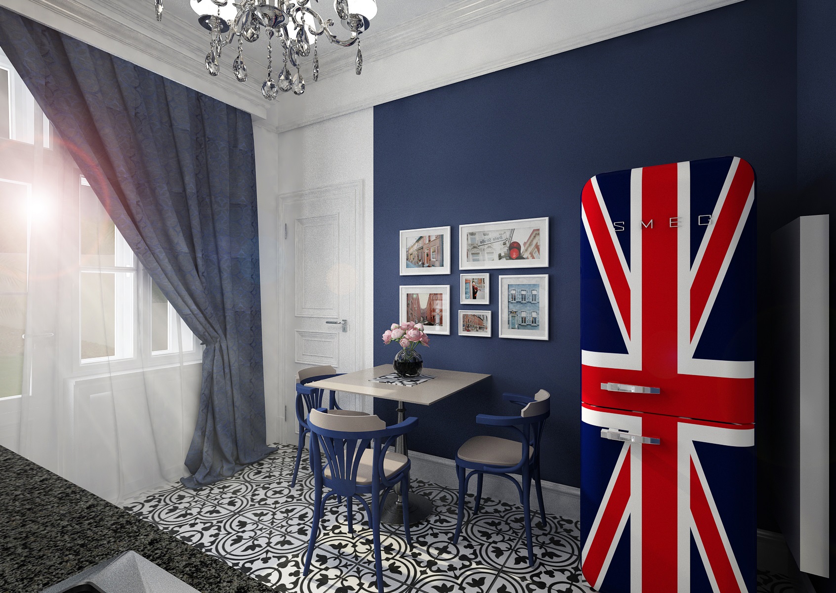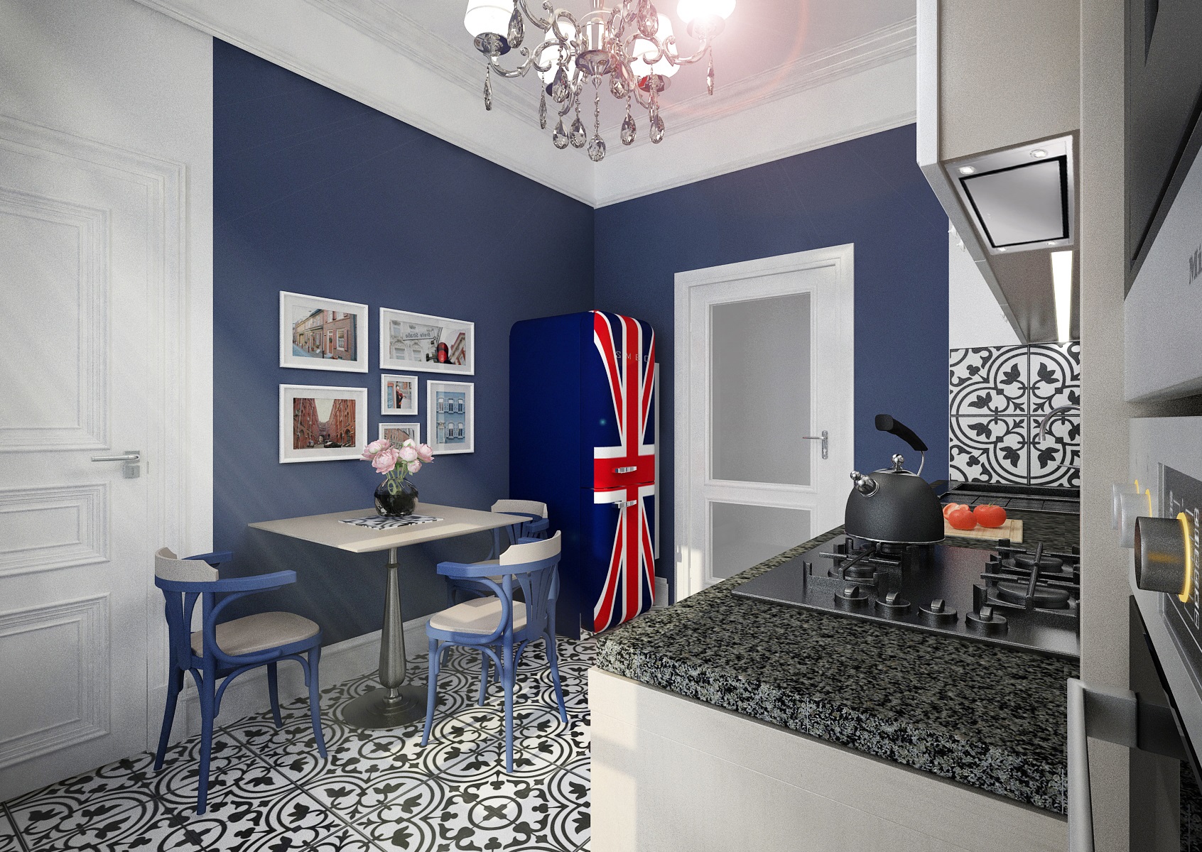 Zadavatel si přál do bytu v historickém domě v centru města také odpovídající kuchyni. Sytý modrý akcent na stěnách se odvinul od ikonické retro lednice značky SMEG s výrazným potiskem Union Jack. Ta se doplňuje se světlým provedením kuchyňské linky, sestavenou v jednoduché linii s dekorativními prvky, jako jsou okrasné vrchní lišty a boční sloupky. Nechybí ani typově vhodná žulová pracovní deska a dlažba s výraznou kresbou. K malému stolku přisedneme na židle TON č. 56 v odpovídající barvě. A tečkou interiéru je dokonale ladící křišťálový lustr.