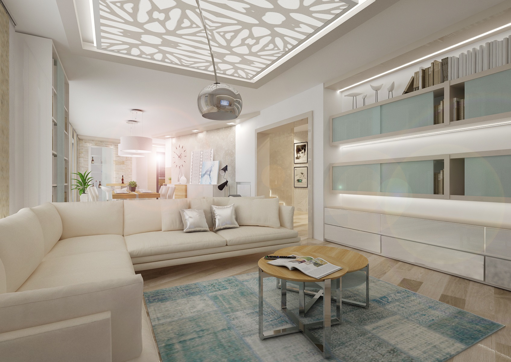 Atraktivní dekorací je vzorovaný podsvícený panel nad obývací částí.