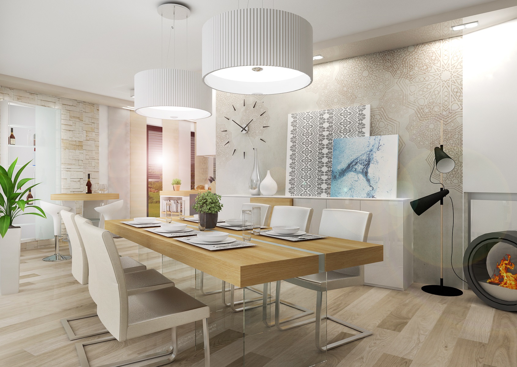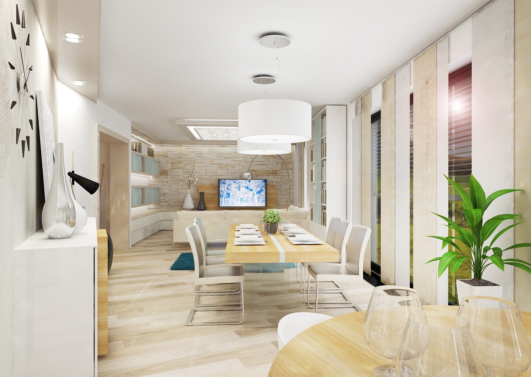Béžovo-bílá pastelová kombinace barev v kuchyni, jídelně a obývacím pokoji navozují pocit klidu a vzdušnosti. Pracovní deska je z bílého umělého kamene Technistone, MDF dvířka lakovaná bílým lesklým lakem a světlou dýhou běleného dubu. Jídelní stůl má desku z tlustých dubových prken stojících na skleněné podnoži.