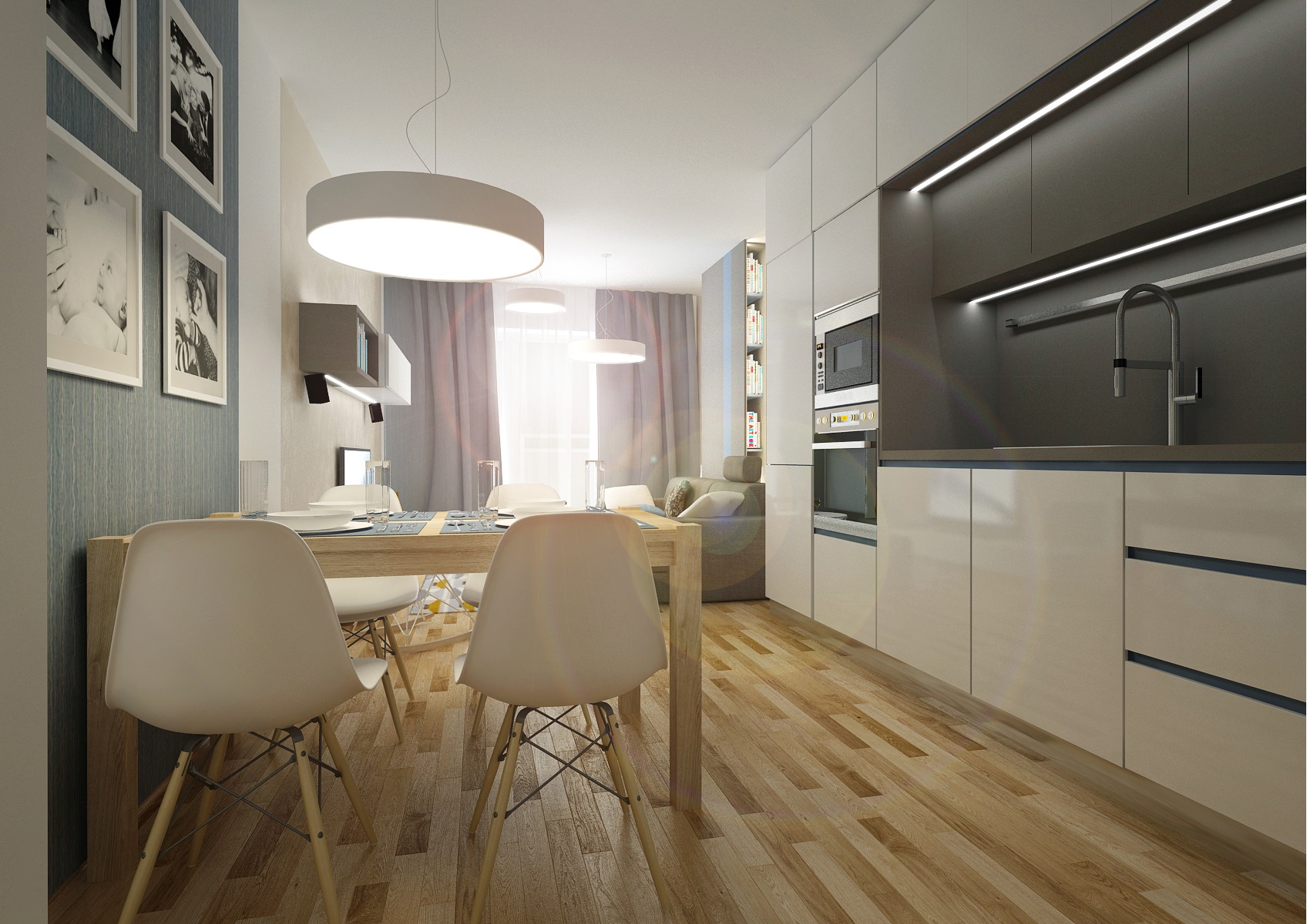 Řešení moderní kuchyně, jídelny a obývacího pokoje v jednom otevřeném prostoru, v bytě 2+kk. Pracovní deska je z antracitové postformingové desky a ze stejného dekoru je i obklad a horní skříňky kuchyňské linky.