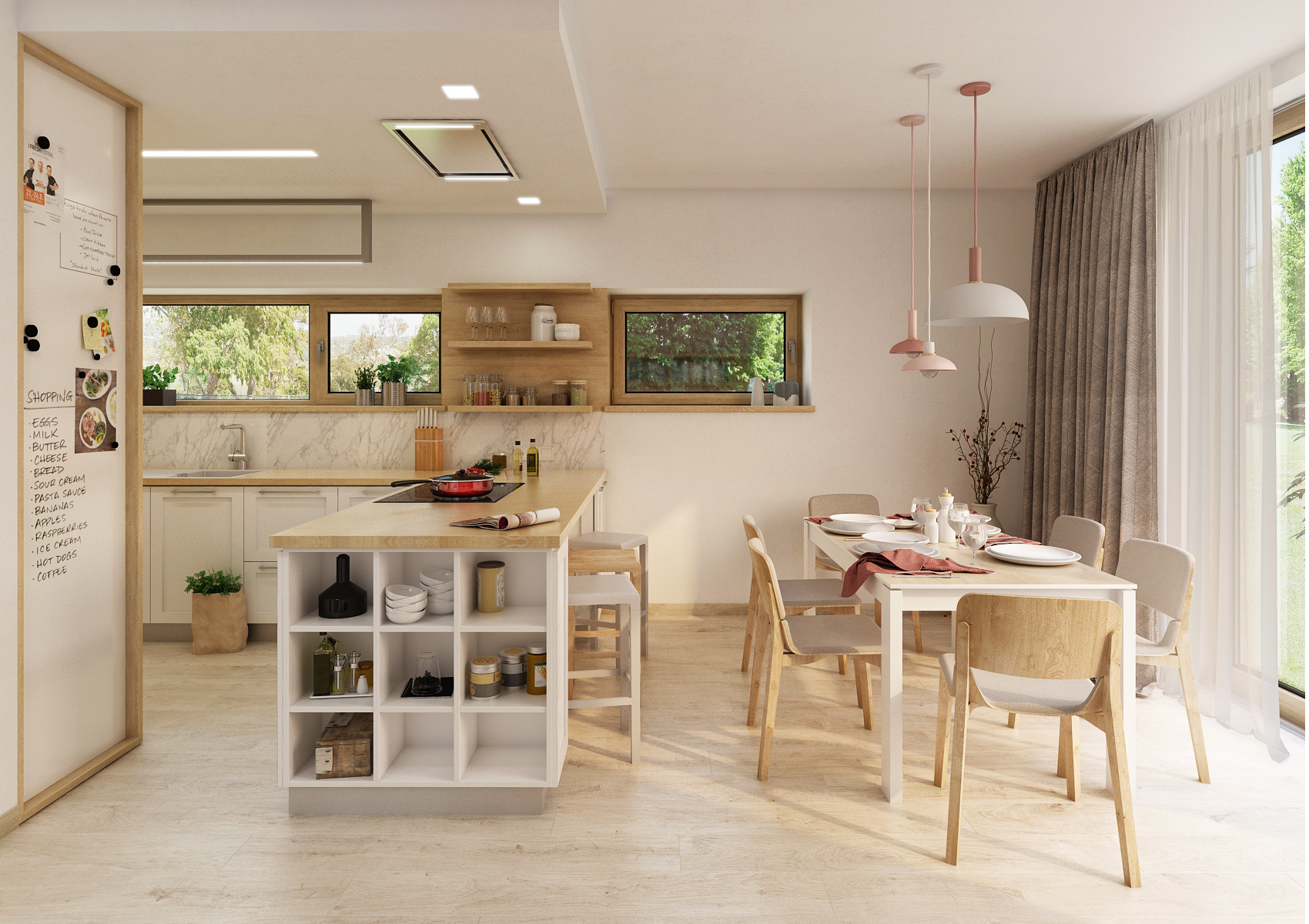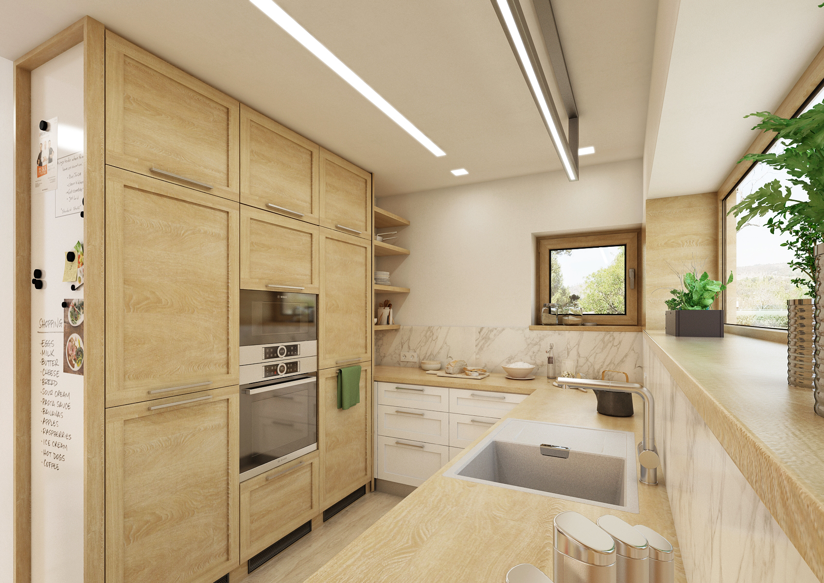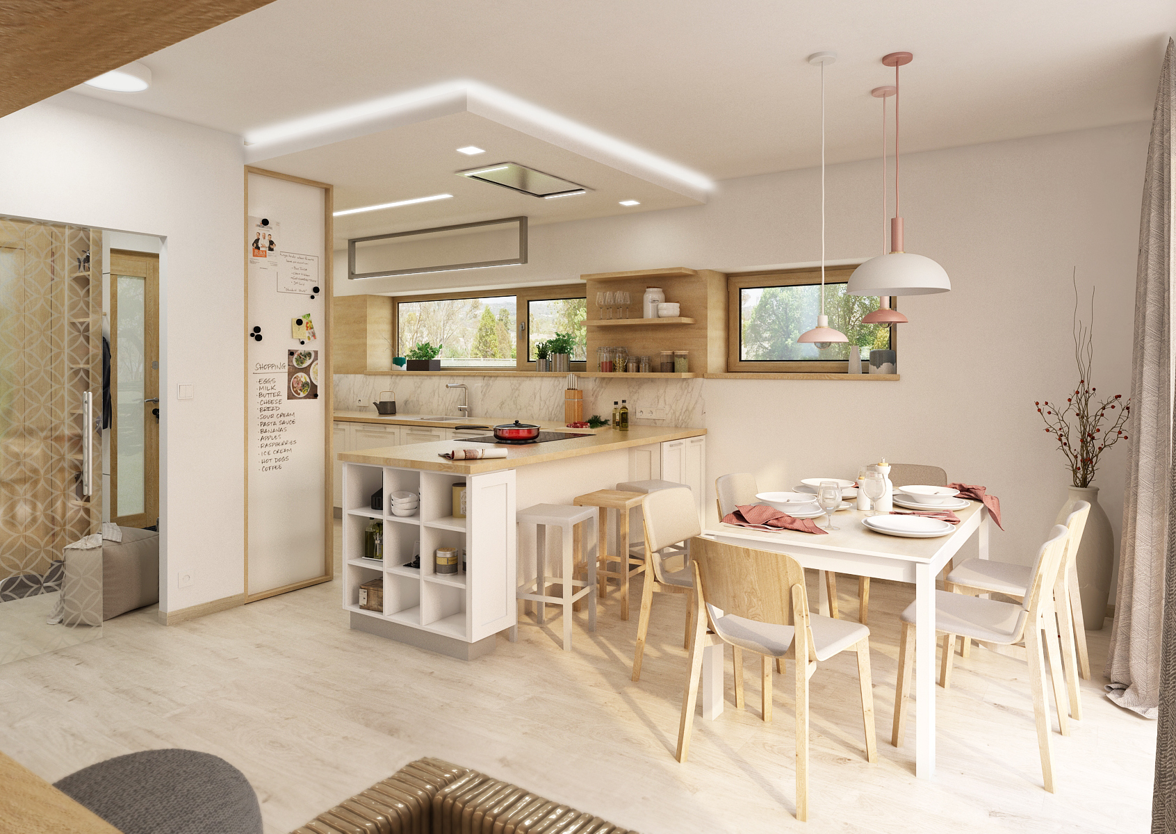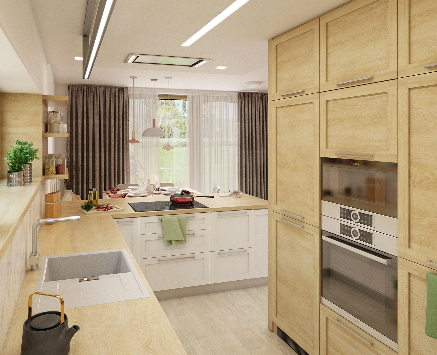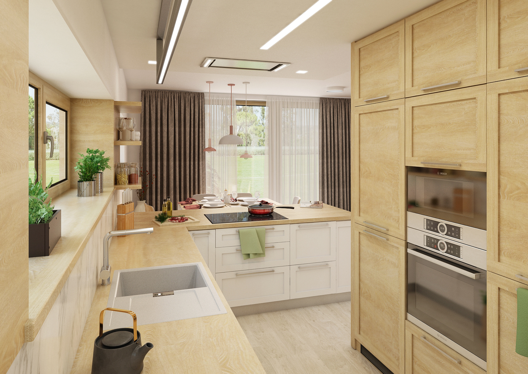 Kuchyňský kout začíná vysokou sestavou s vestavnými spotřebiči, jehož bok tvoří praktický doplněk - popisovací a magnetická tabule, pokračuje pod oknem zasazeným granitovým dřezem a končí varným centrem vysunutým do prostoru. Krom bílé se na nábytku opakuje stejný dřevodekor světlého dubu, jako je použit na okenních rámech. Na výrobu kuchyňské linky mladá rodina zvolila levnější materiál, jako je MDF s folií, na korpusy MDF s laminem, se strukturou imitující povrch dřeva. Na pracovní desku a parapety postfoming a na zástěnu laminát s podobou mramoru.