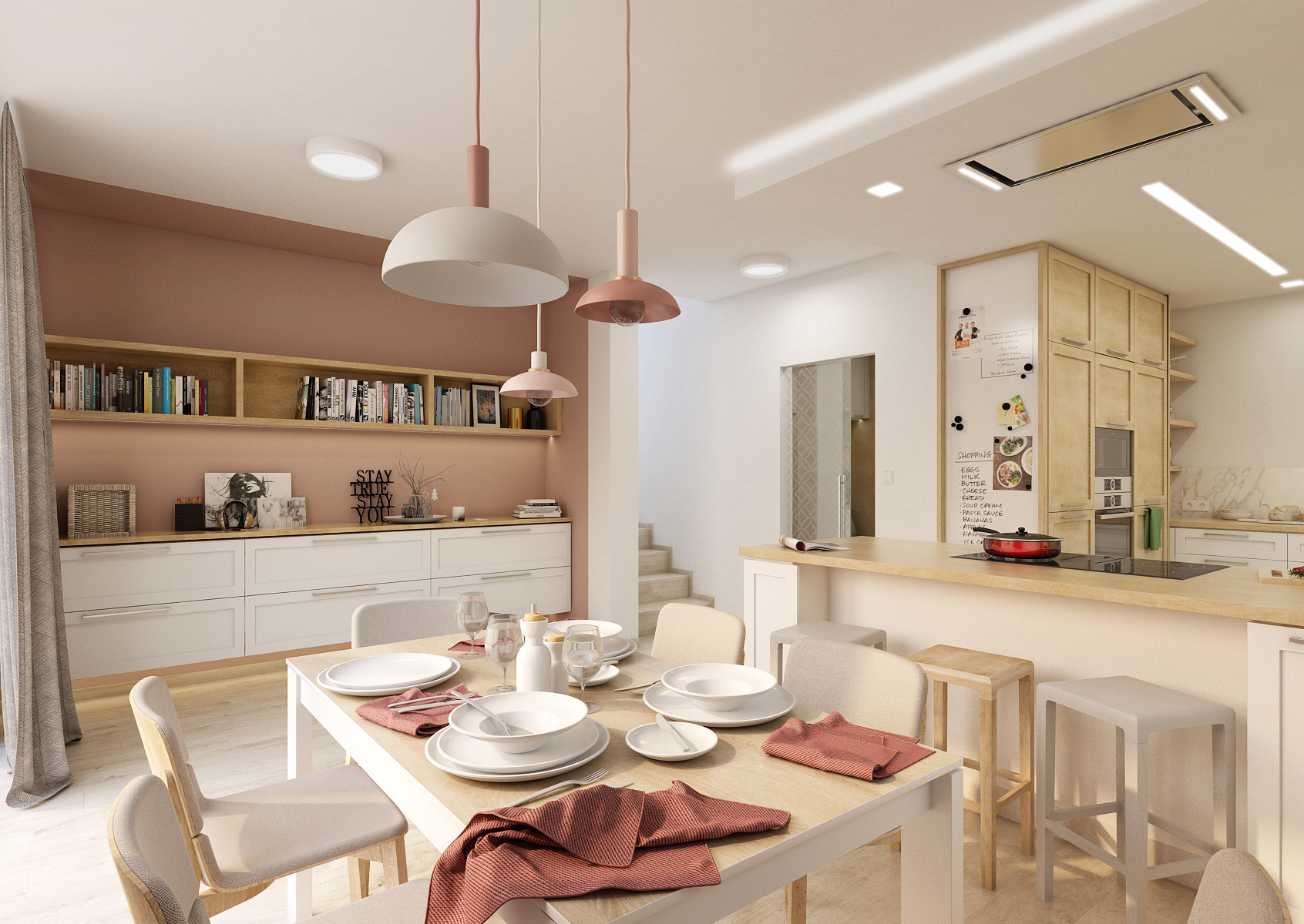 Světlost interiéru nijak neruší ani plovoucí podlahu v odstínu polárního dubu a výmalba starorůžovou barvou - zvaná Ballerina, která se opakuje i na skupině světel nad jídelním stolem.