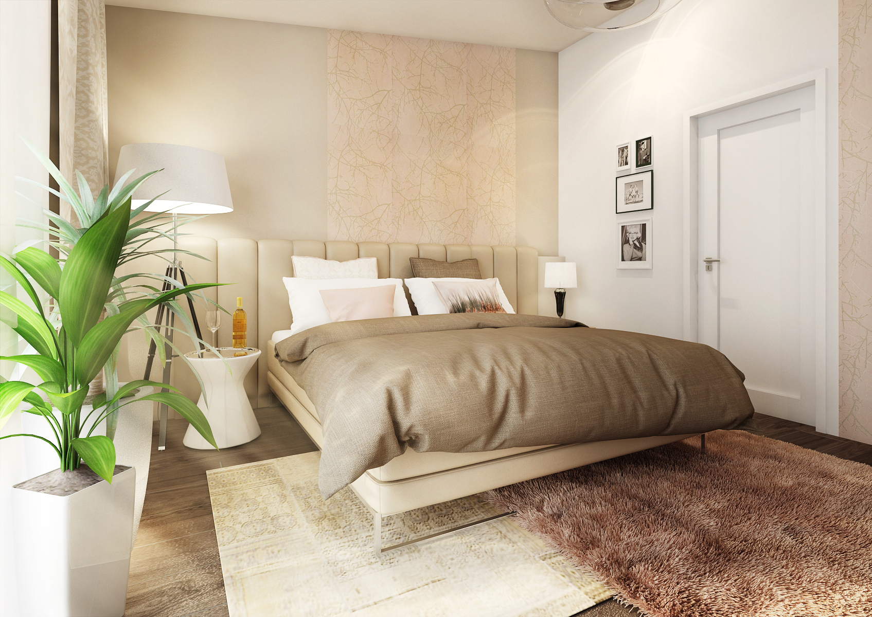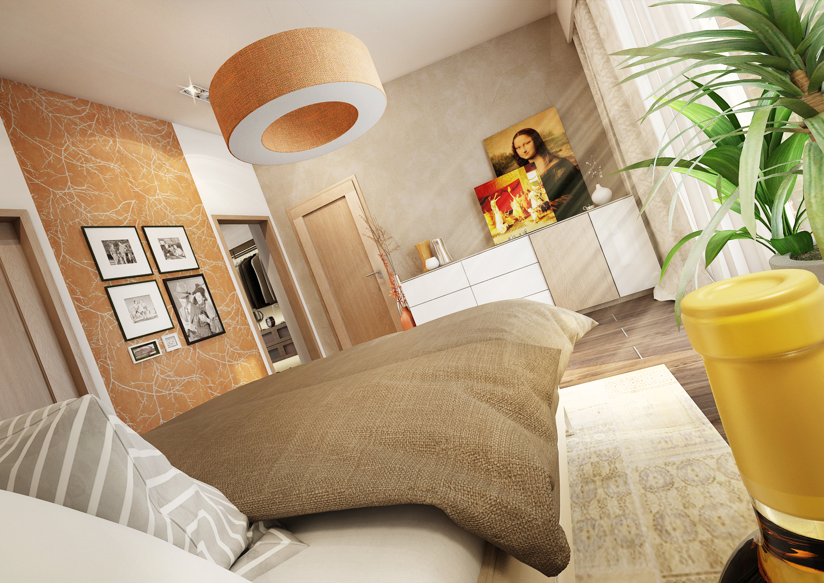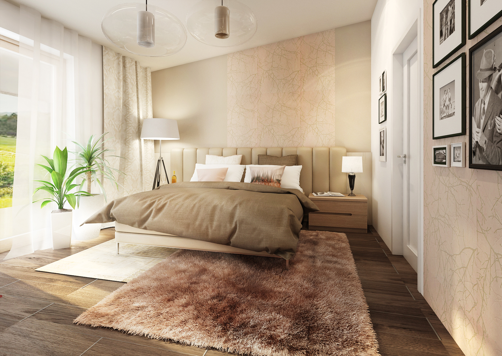 Požadavkem byly světlé zemité barvy, čalouněná postel a dřevodekor. Francouzká okna dodávají místnosti dostatek světla a pocit vzdušnosti. Za lůžkem se lze pohodlně opřít o kožené čalounění v krémové barvě, která se pak opakuje ve výmalbě pokoje. V návrhu lze vidět 2 varianty provedení čalouněného obkladu a tapety s rostlinným motivem.