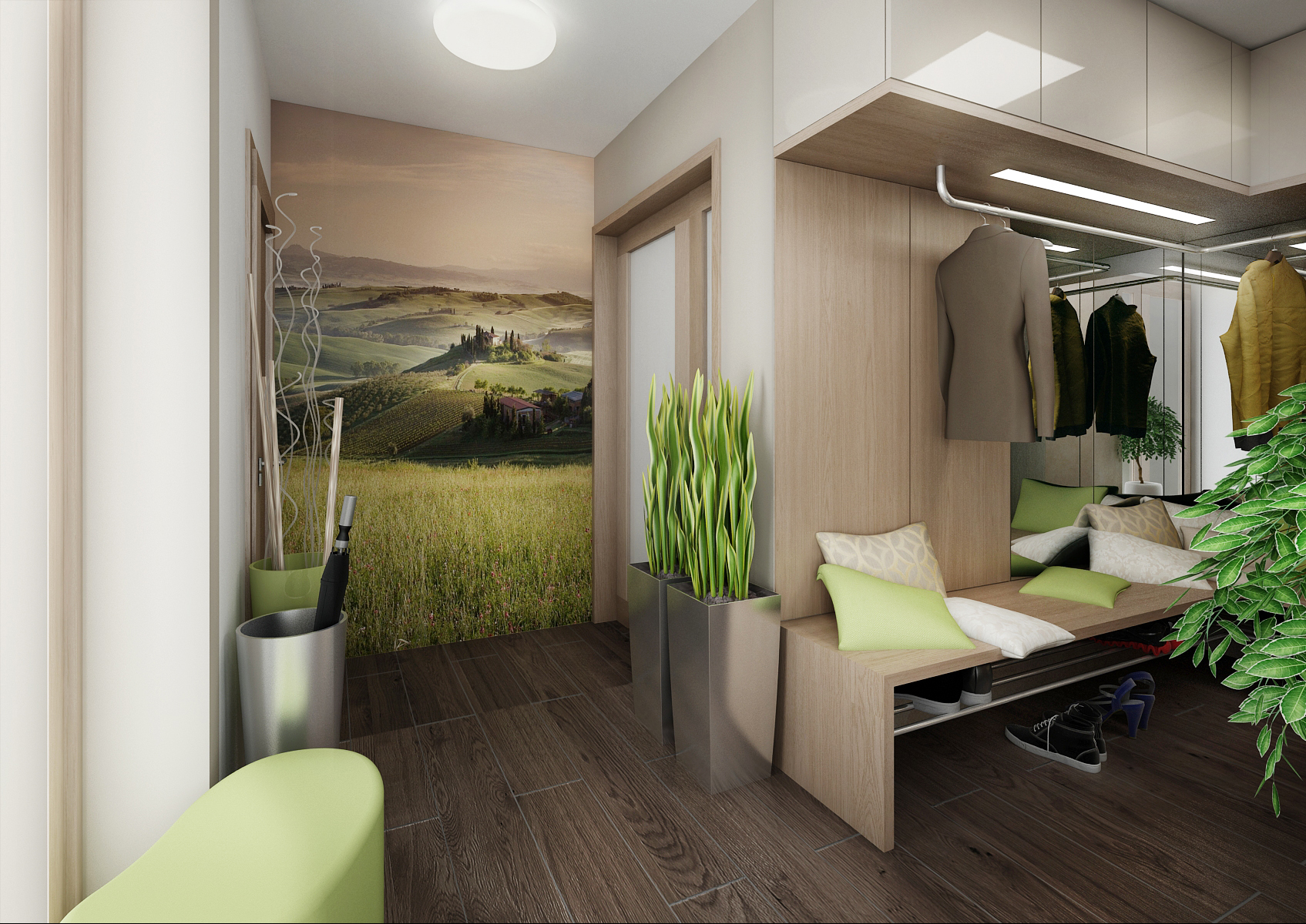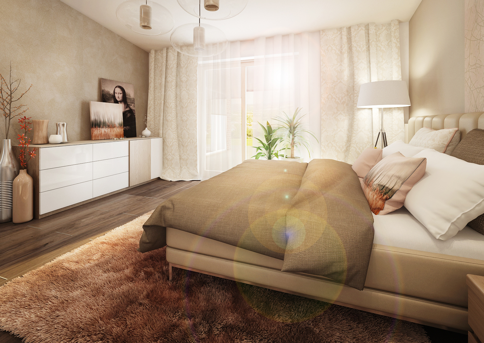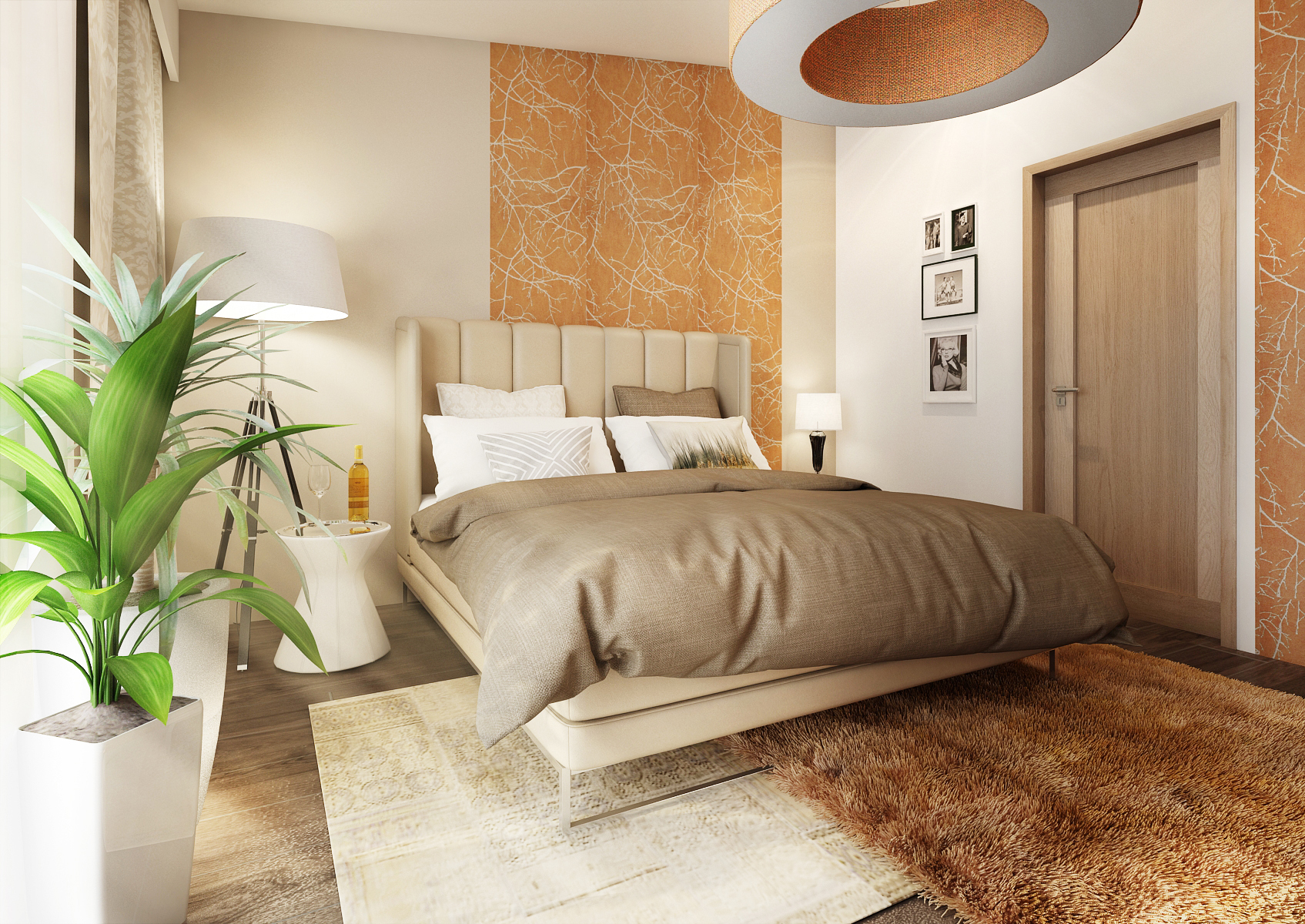Požadavkem byly světlé zemité barvy, čalouněná postel a dřevodekor. Francouzká okna dodávají místnosti dostatek světla a pocit vzdušnosti. Za lůžkem se lze pohodlně opřít o kožené čalounění v krémové barvě, která se pak opakuje ve výmalbě pokoje. V návrhu lze vidět 2 varianty provedení čalouněného obkladu a tapety s rostlinným motivem.