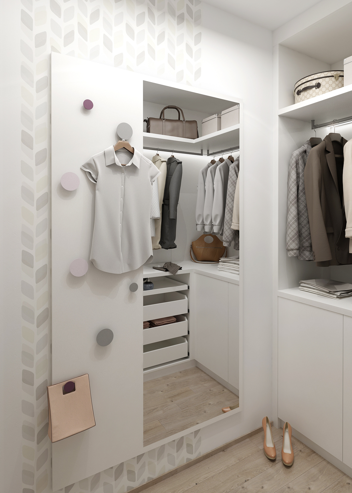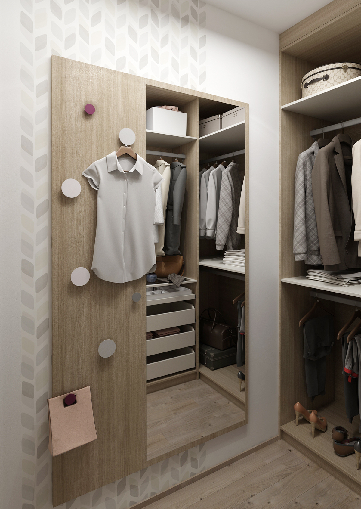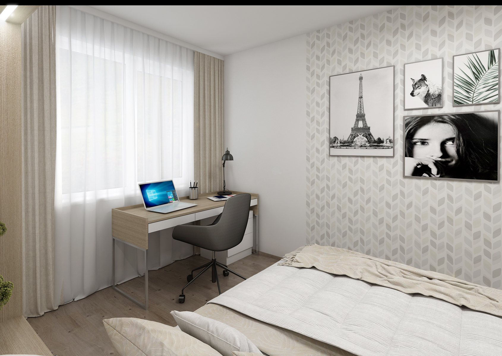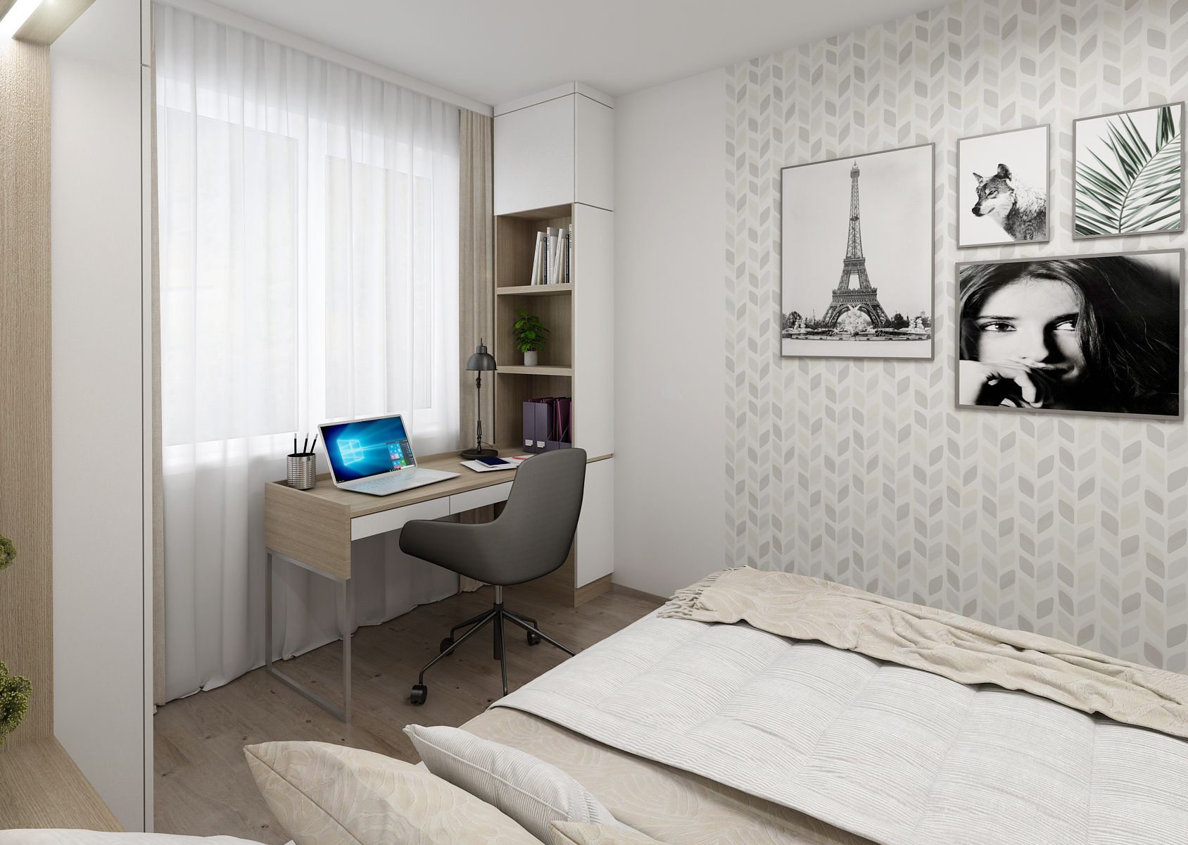 Stěna proti posteli je zpestřena vzorovanou tapetou, která interiér spíše doplňuje a dodává důraz na jednoduchost návrhu. U okna je umístěn i pracovní koutek ve variantě s knihovnou či bez. Co se šatny týče, nabízí prostor pro zavěšení oděvů, ale i šuplíky, ať už kryté nebo s prosklenou částí na šperky. Nechybí ani zrcadlo s věšáky.