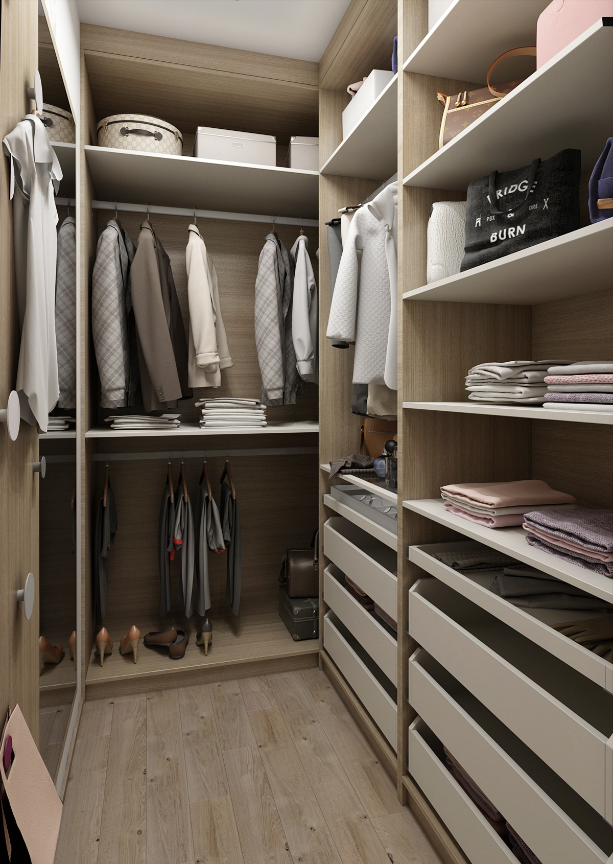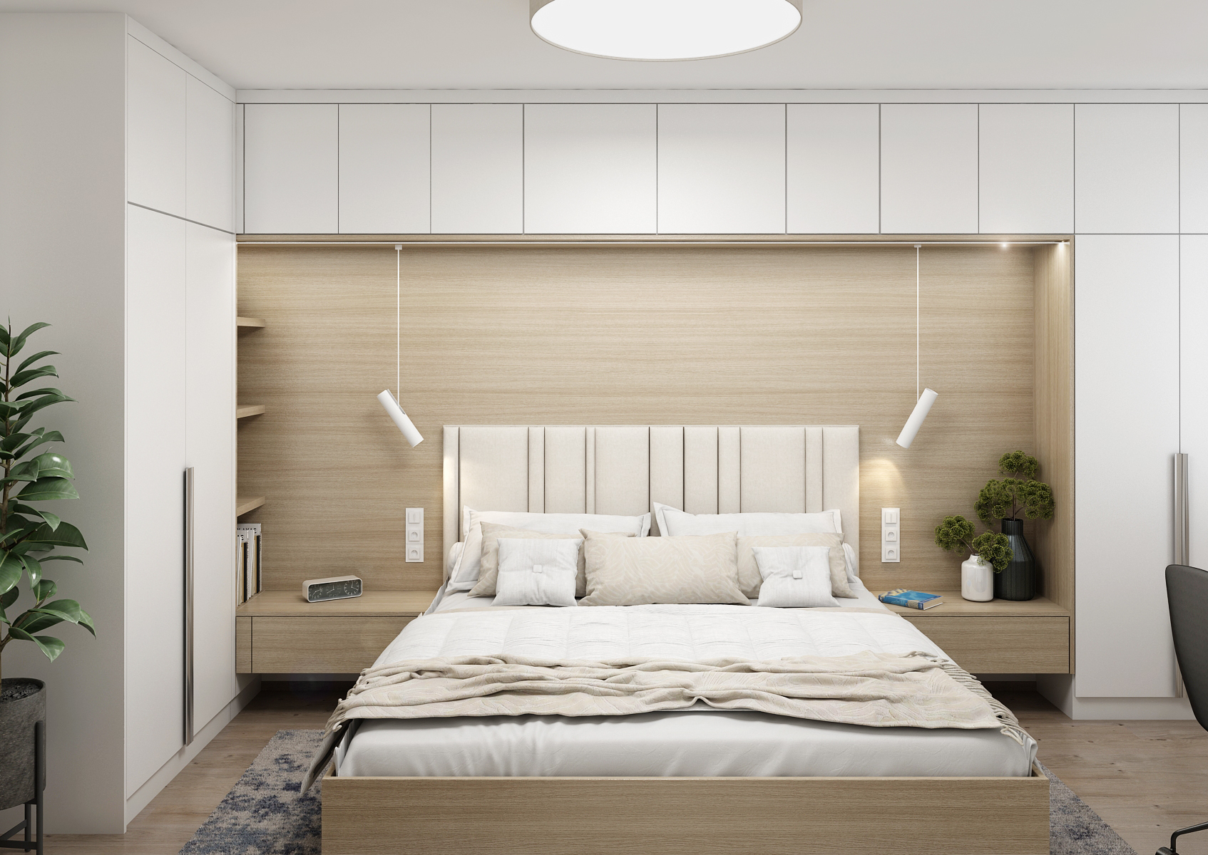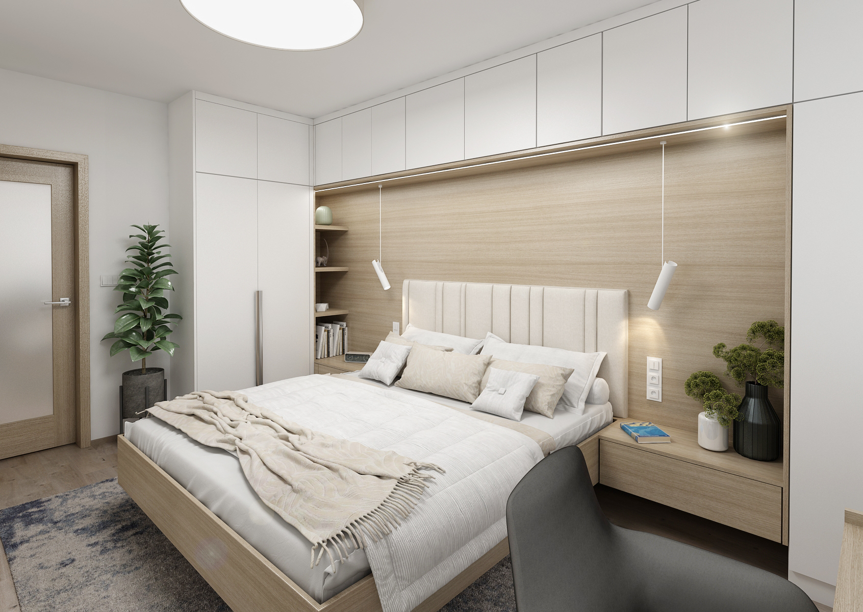 Konstrukce lůžka, čelo a noční stolky jsou navrženy v teplých tónech přírodního jasanového dřeva, které je lemováno bílými skříňkami. Kromě nočních stolků jsou vedle nich umístěny i police pro ukládání knih, celý prostor pod horními skříňkami je pak osvětlen LED páskem zabudovaným ve spodní části skříní. Bezúchytová dvířka podtrhují čistý a minimalistický design.