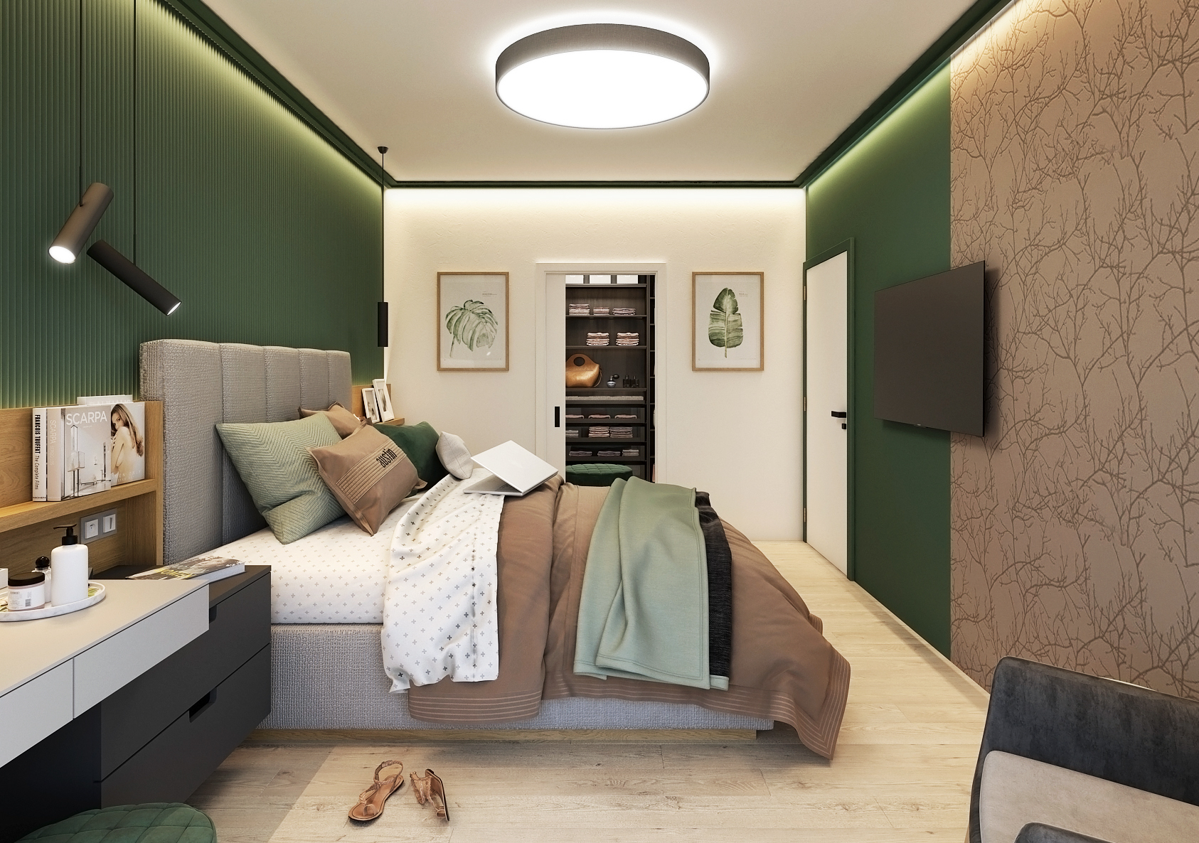Při prvním pohledu na interiér této ložnice si lze povšimnout dominantní barvy, kterou je právě zelená. Ať už na obkladových panelech kolem postele nebo na nábytkových prvcích či bytovém textilu.
