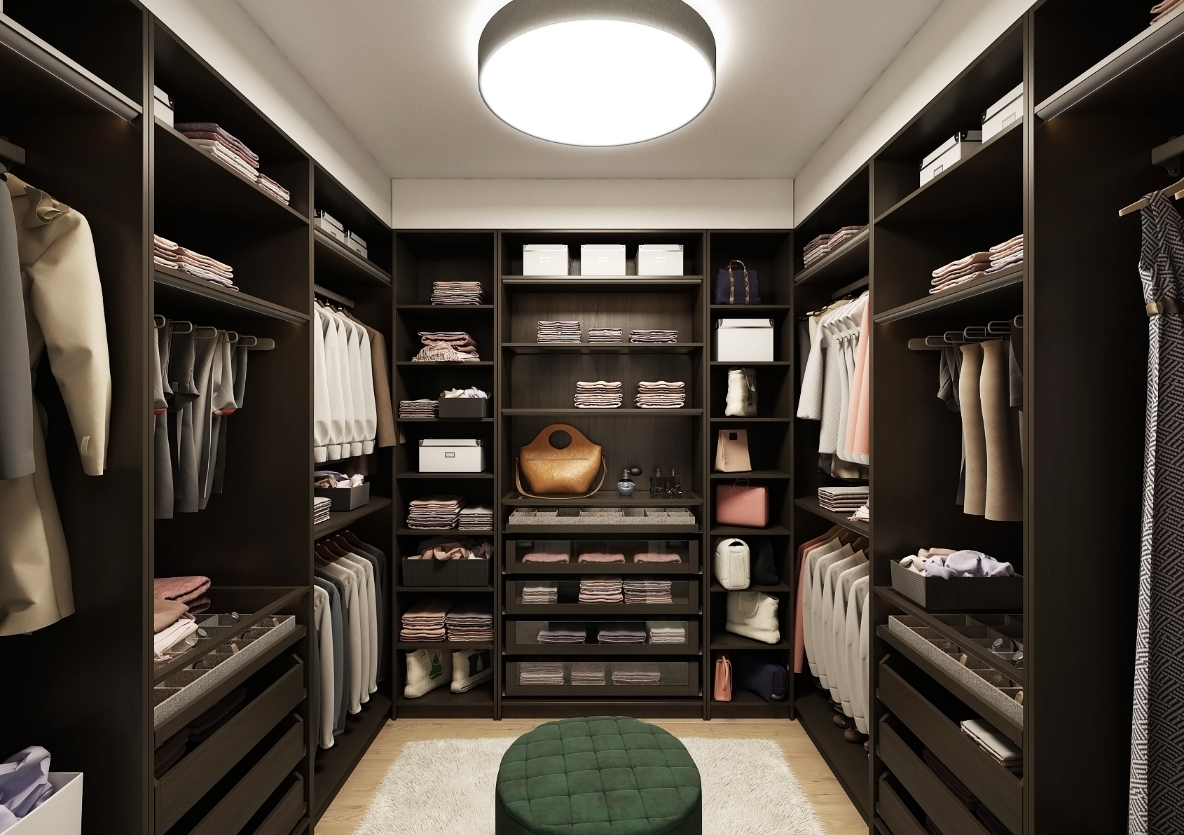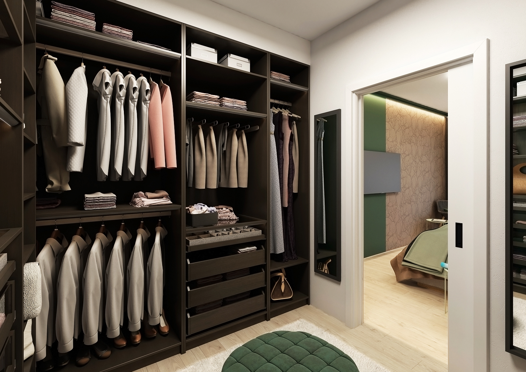Vstup do šatny je opatřen zasouvacími dveřmi. Prostorná šatna s taburetem uprostřed k usazení, se může pyšnit regály v dekoru wenge.