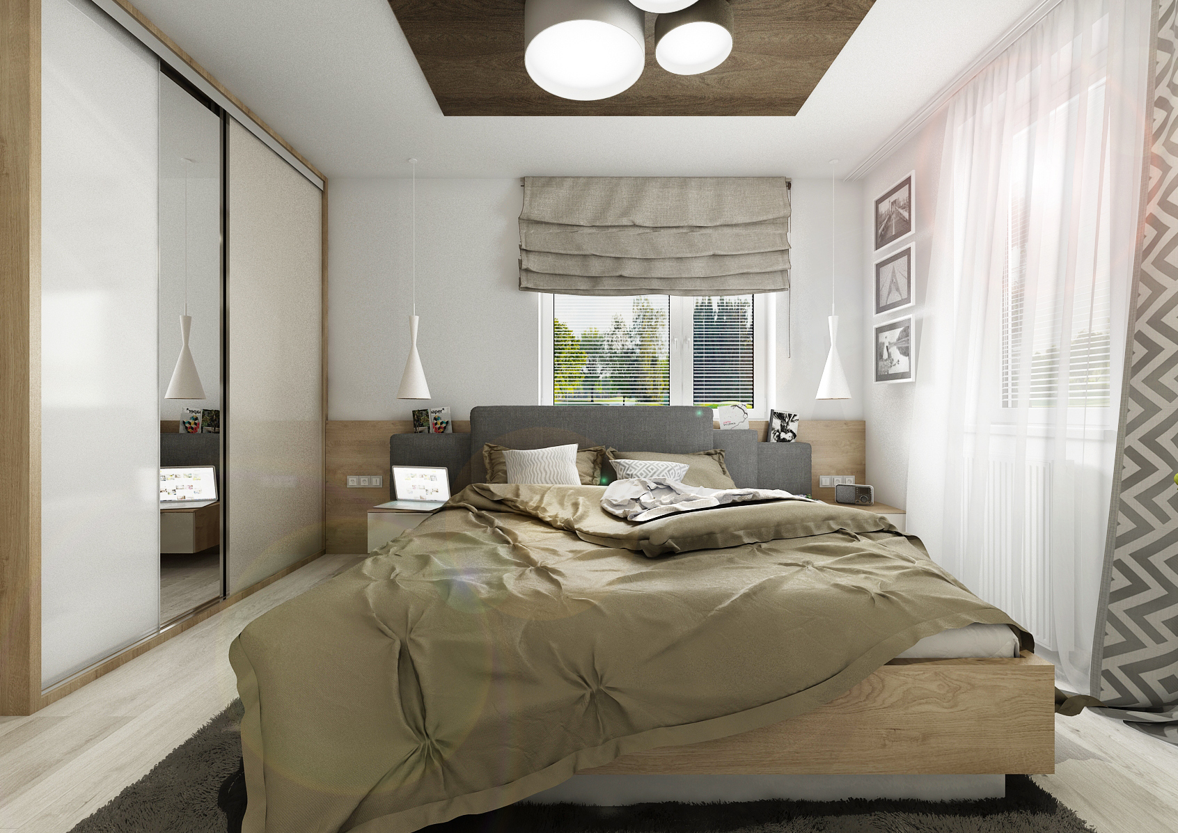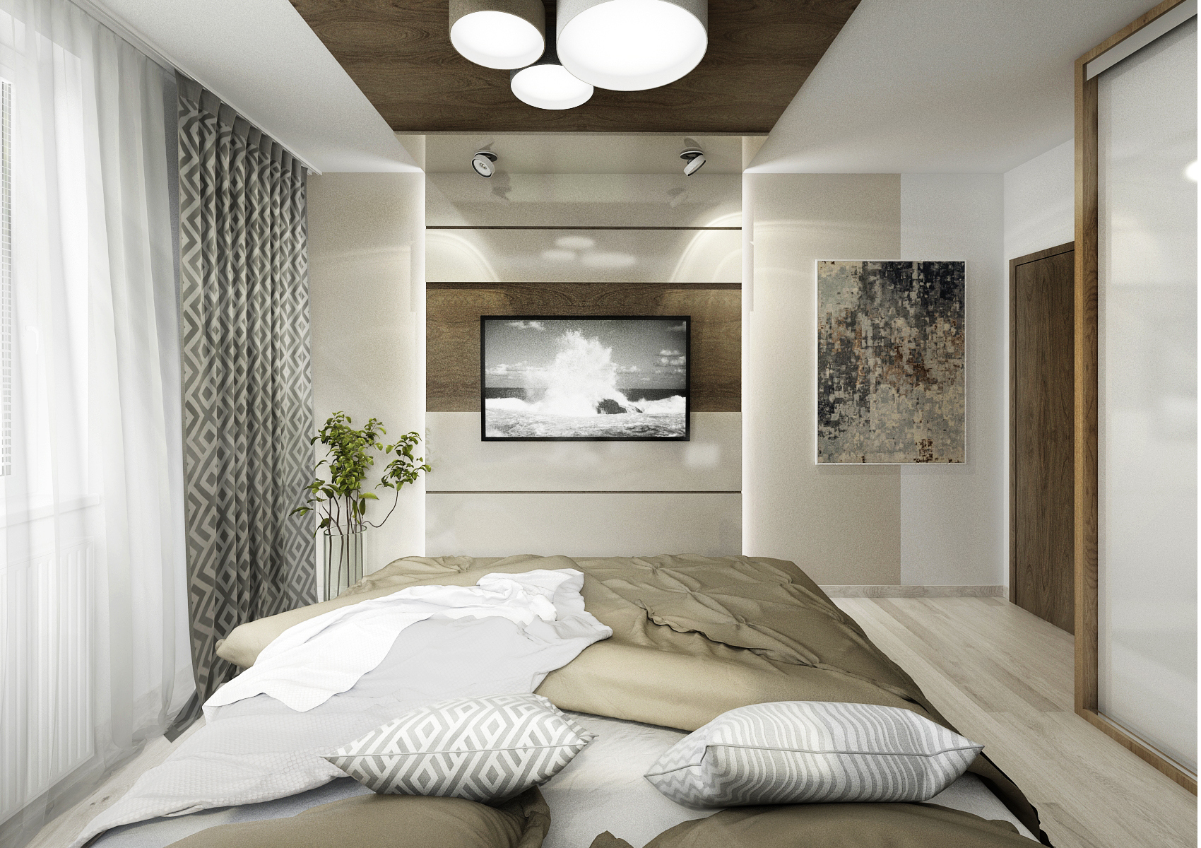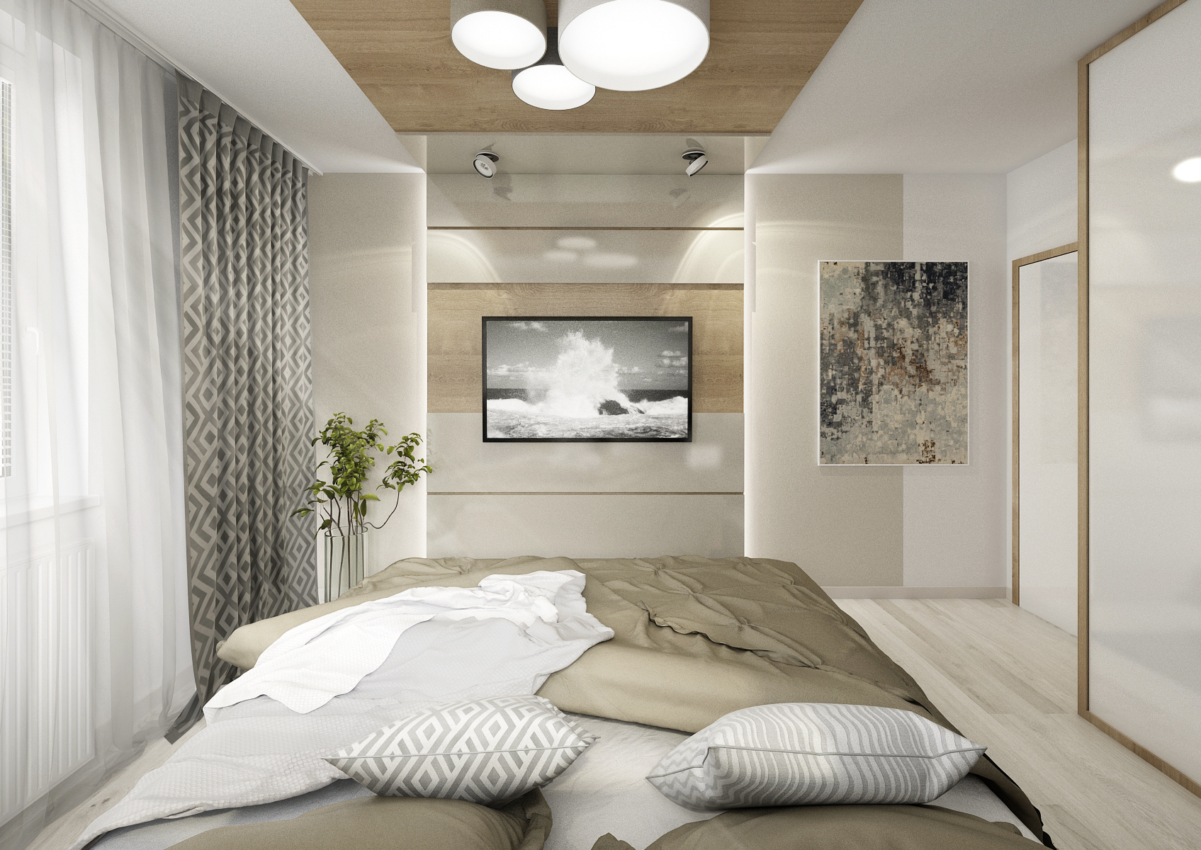 vestavné šatní skříně na míru. V jedné variantě čelo postele s nočními stolky plynule přechází do skříně, rozdělené na čtyři části, s dveřmi na závěsu s úchytkami. V další byly zvoleny posuvné dveře bez úchytu, pro úsporu místa. V obou verzích byly dveře skříně pro efekt rozděleny v jiných poměrech šířek. Čelo postele je tvořeno kombinací desky v dřevodekoru s čalouněnými formáty. Odskočené čalouněné čela schovávají úzké police na odkládání například rozečtené knihy. Použité materiály jsou LDT desky v dekoru dubu Kansas, skombinovaného s alpskou bílou a kašmírově šedou barvou ve vysokém lesku a běleným dubem na vinylové podlaze.