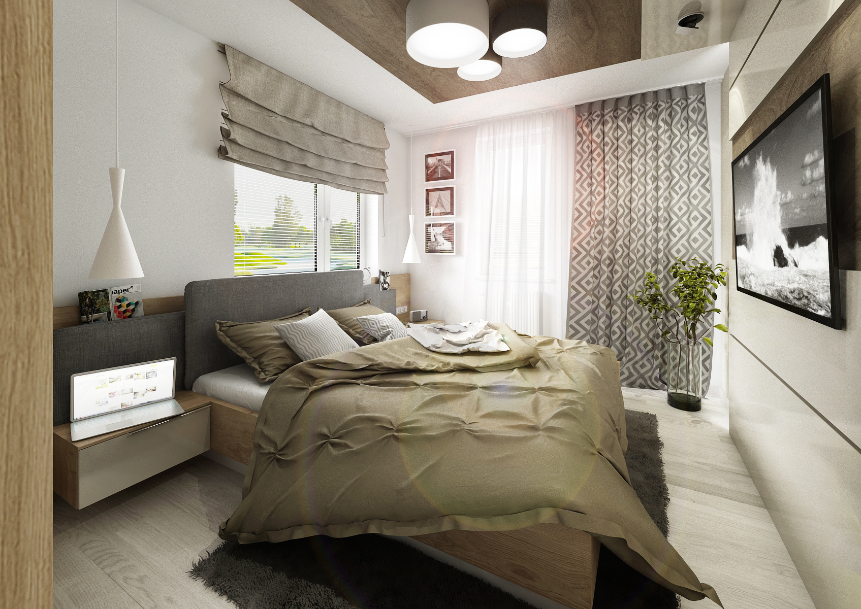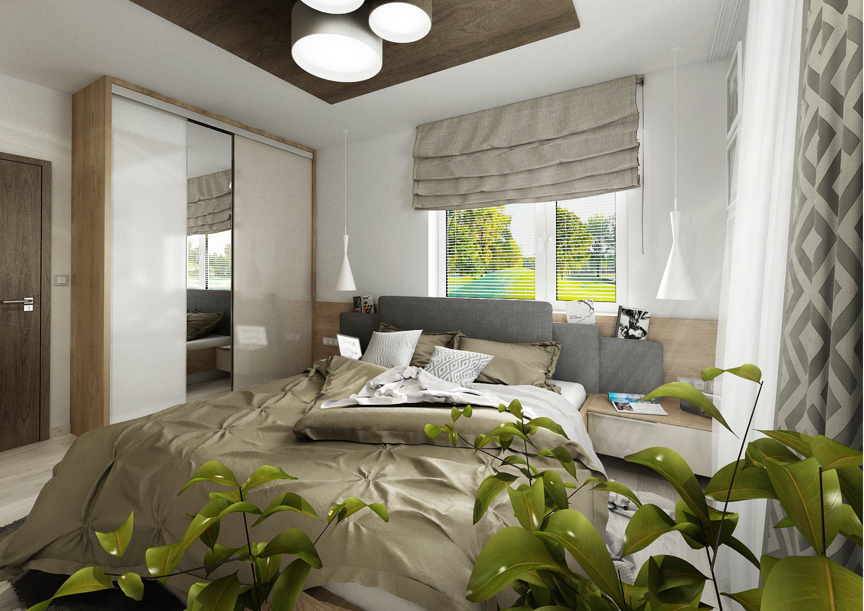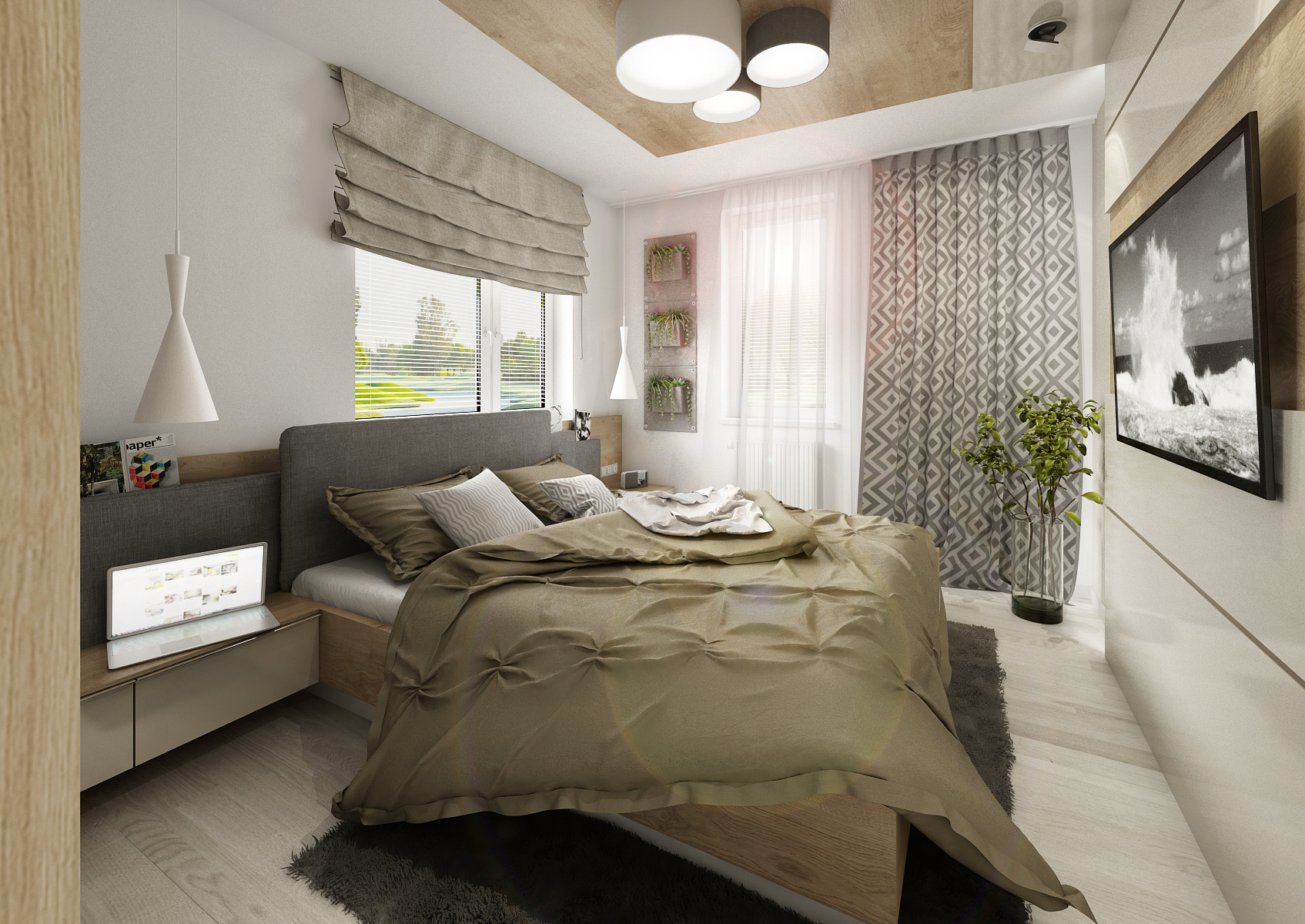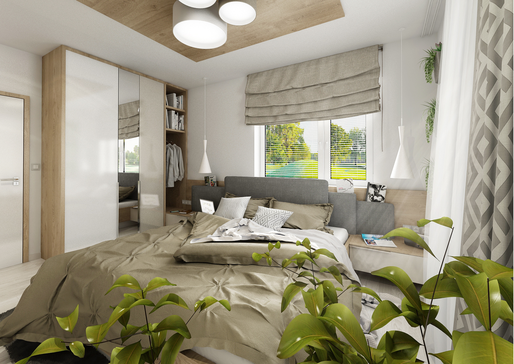 vestavné šatní skříně na míru. V jedné variantě čelo postele s nočními stolky plynule přechází do skříně, rozdělené na čtyři části, s dveřmi na závěsu s úchytkami. V další byly zvoleny posuvné dveře bez úchytu, pro úsporu místa. V obou verzích byly dveře skříně pro efekt rozděleny v jiných poměrech šířek. Čelo postele je tvořeno kombinací desky v dřevodekoru s čalouněnými formáty. Odskočené čalouněné čela schovávají úzké police na odkládání například rozečtené knihy. Použité materiály jsou LDT desky v dekoru dubu Kansas, skombinovaného s alpskou bílou a kašmírově šedou barvou ve vysokém lesku a běleným dubem na vinylové podlaze.