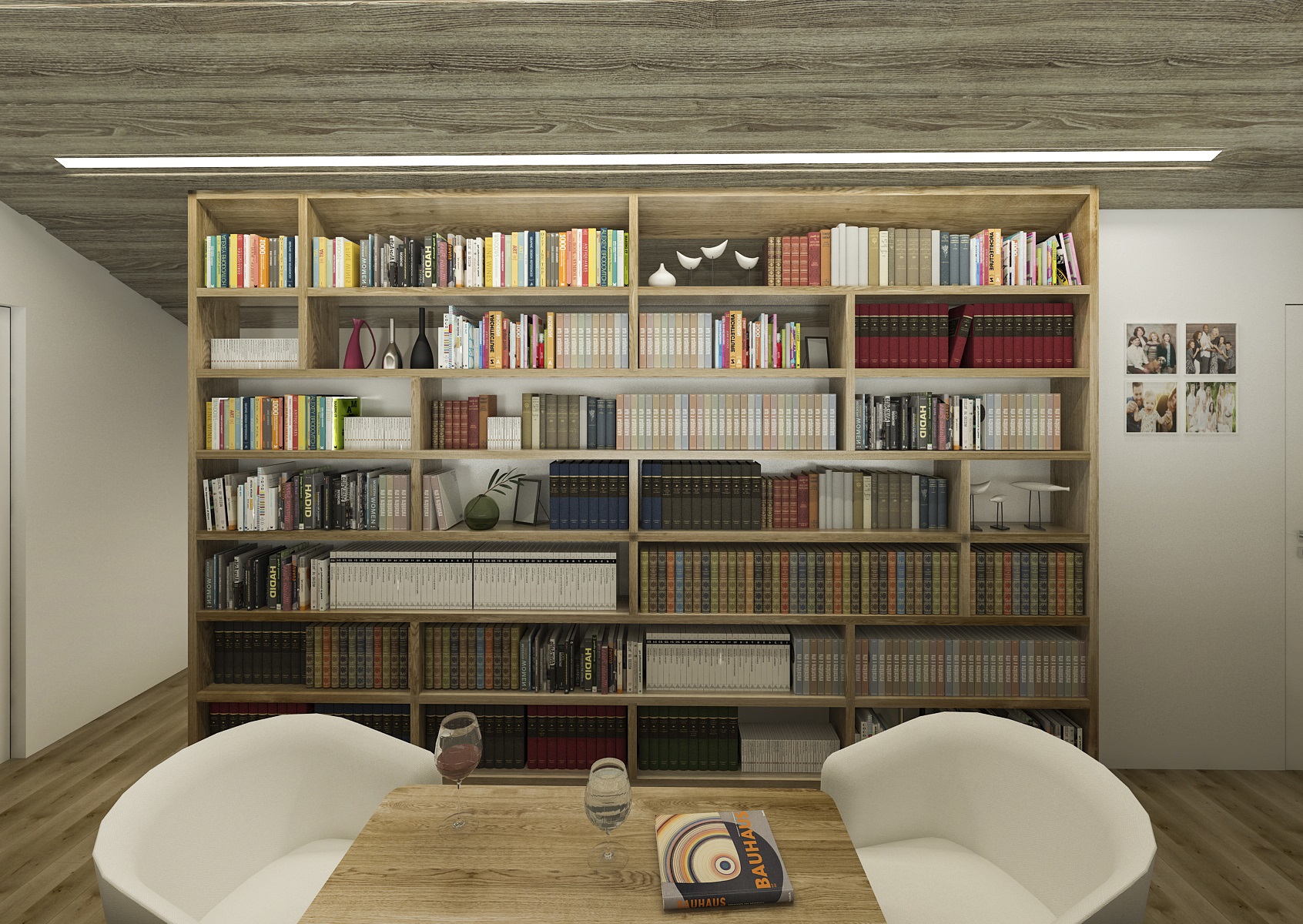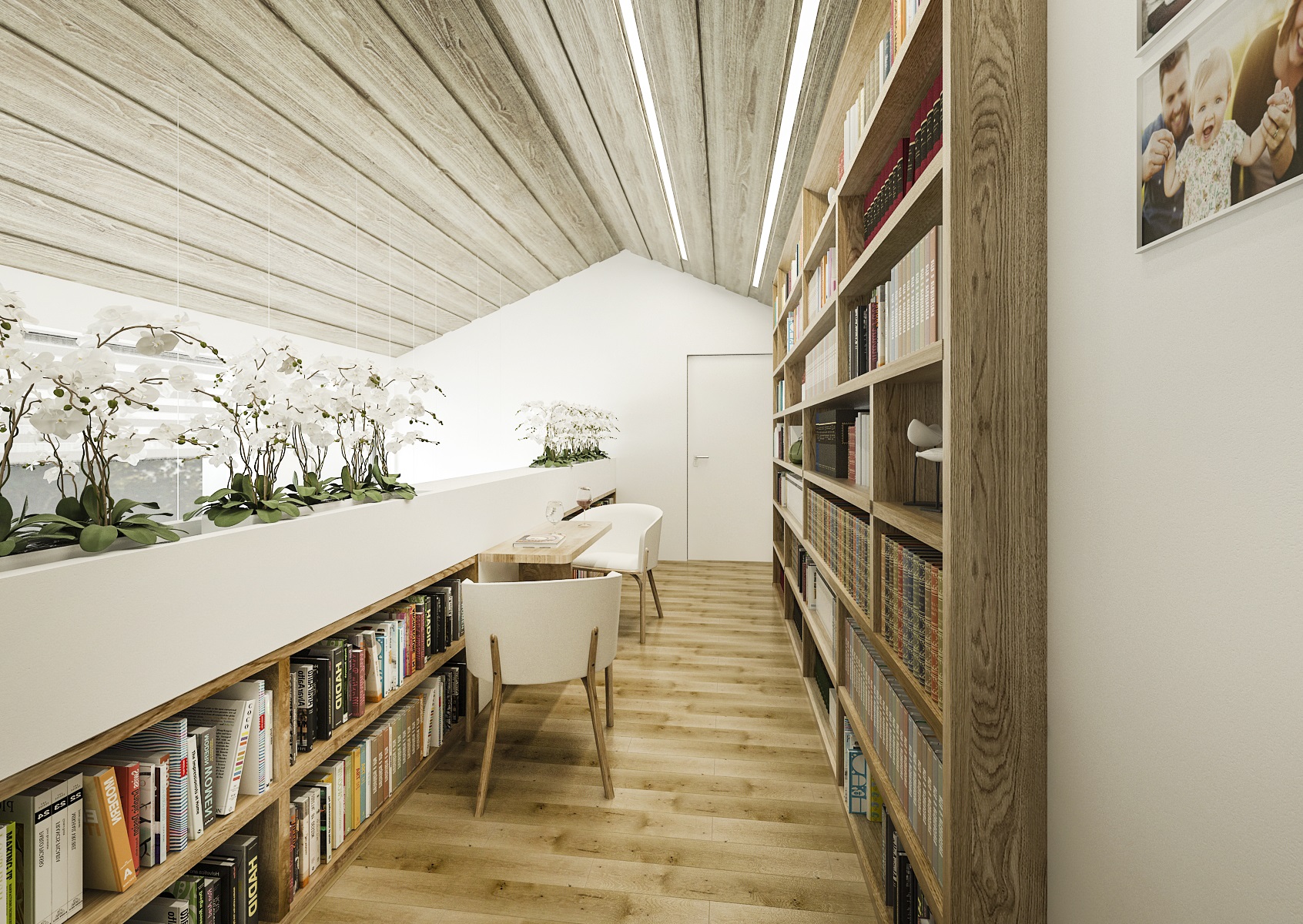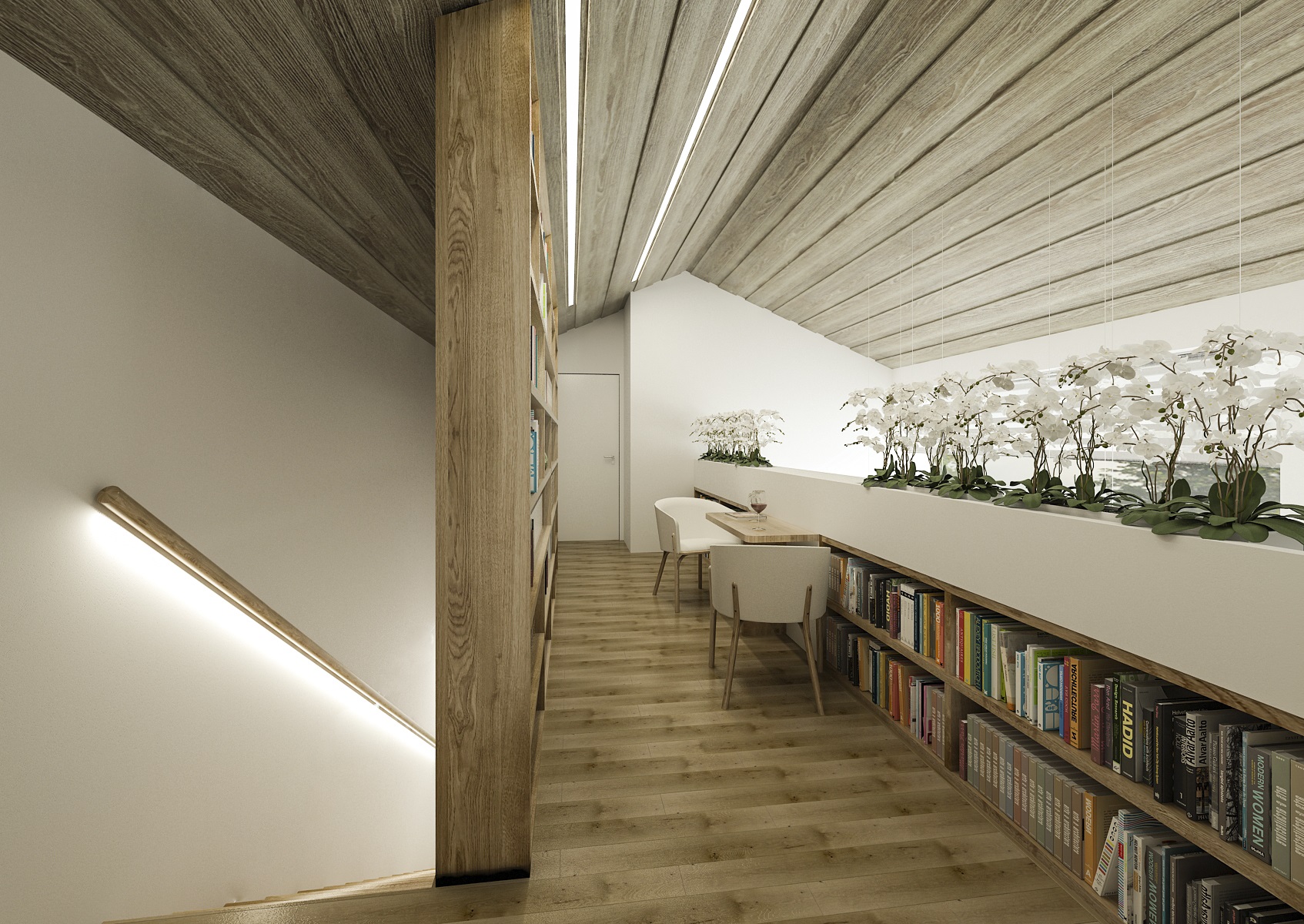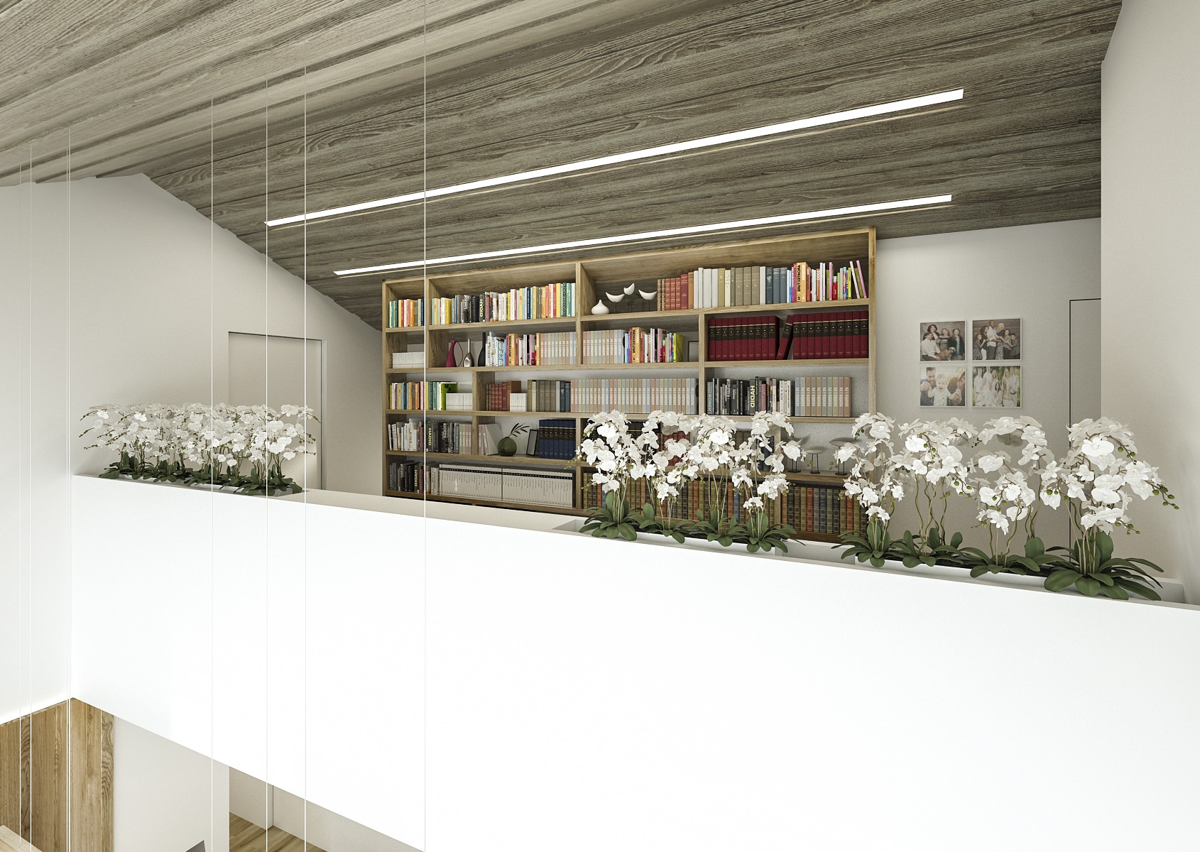 Otevřený prostor podkrovní galerie interieru rodinného domu je ohraničen nízkou knihovnou, na které jsou na míru vyrobené truhlíky s květinami. Tímto je vyřešeno zábradlí, které plní funkci jak bezpečností tak i estetickou. Na protější straně již pokračuje vestavná knihovna.