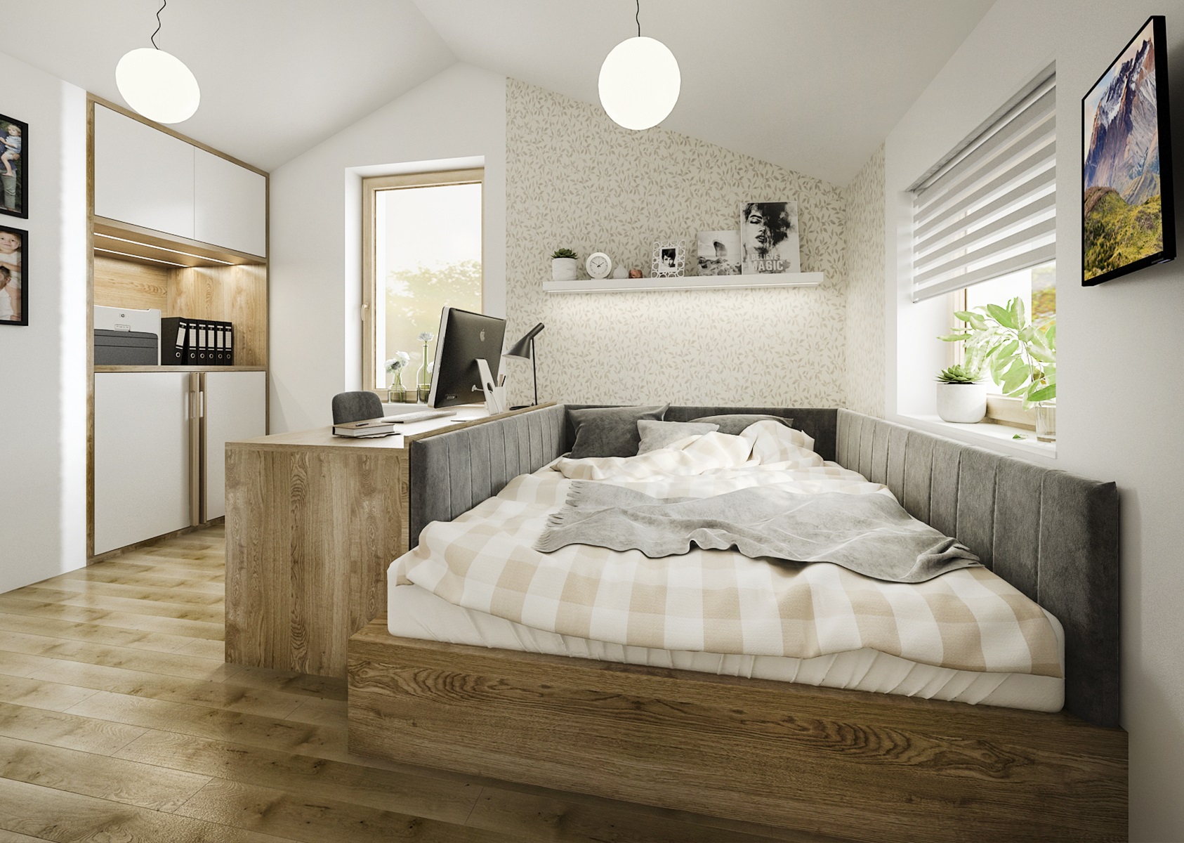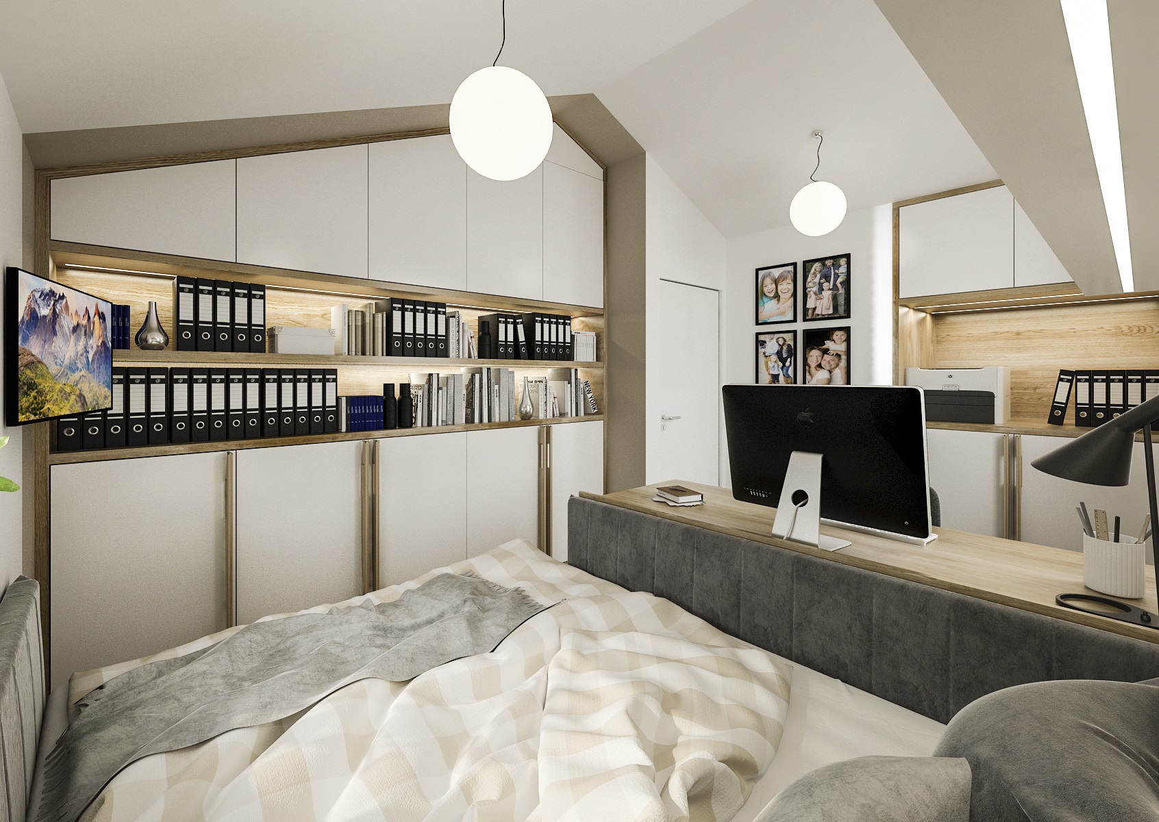 Navazující pracovna slouží současně jako pokoj pro hosty. Obě části jsou v dekoru přírodního dubu a bílé.