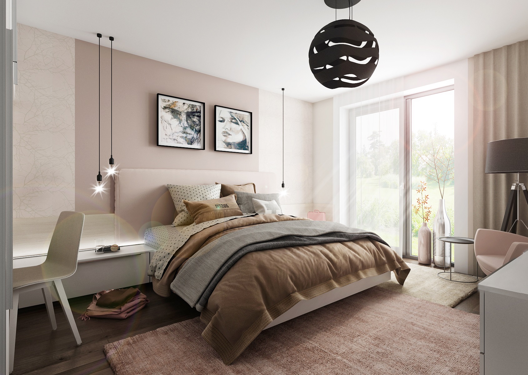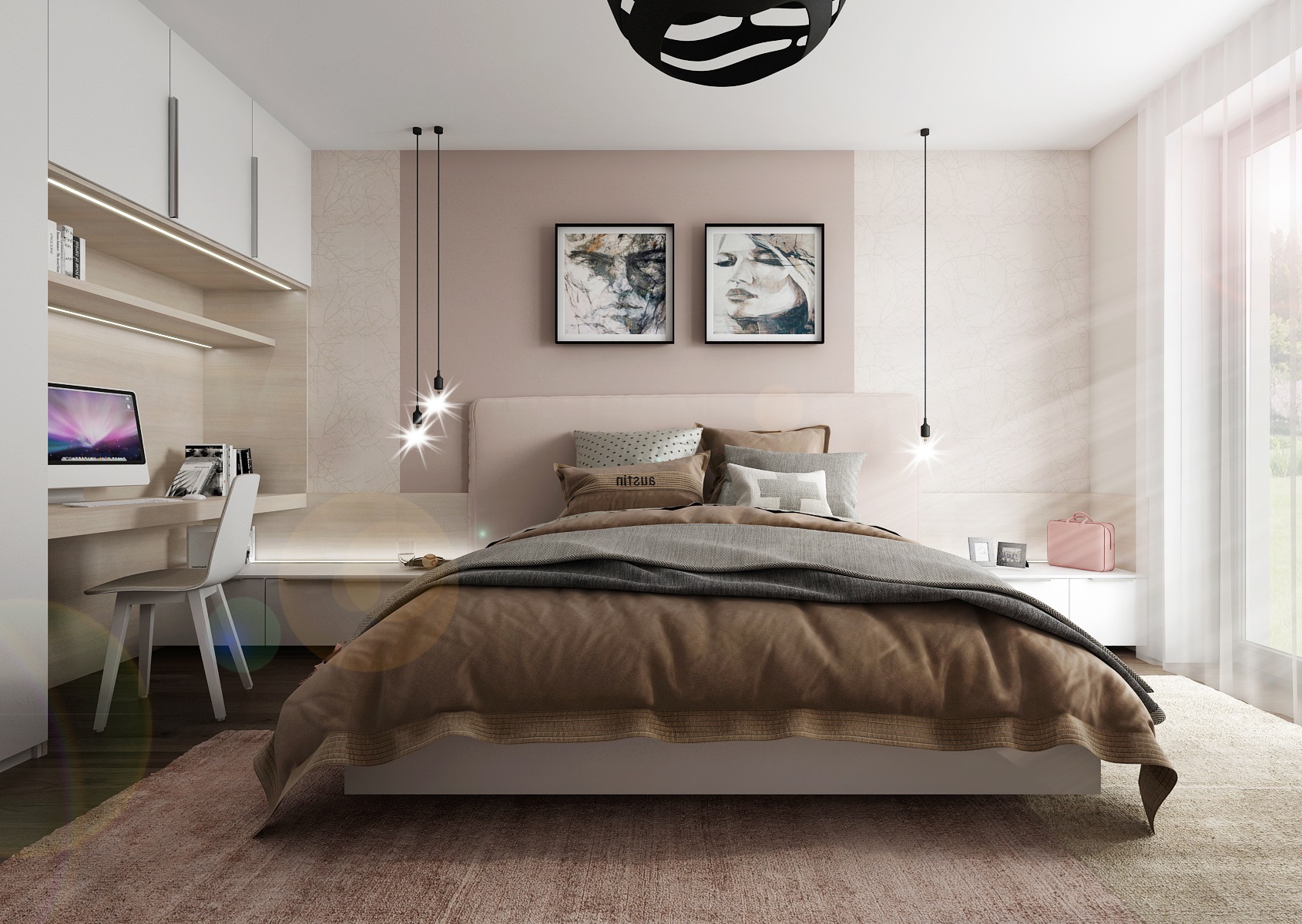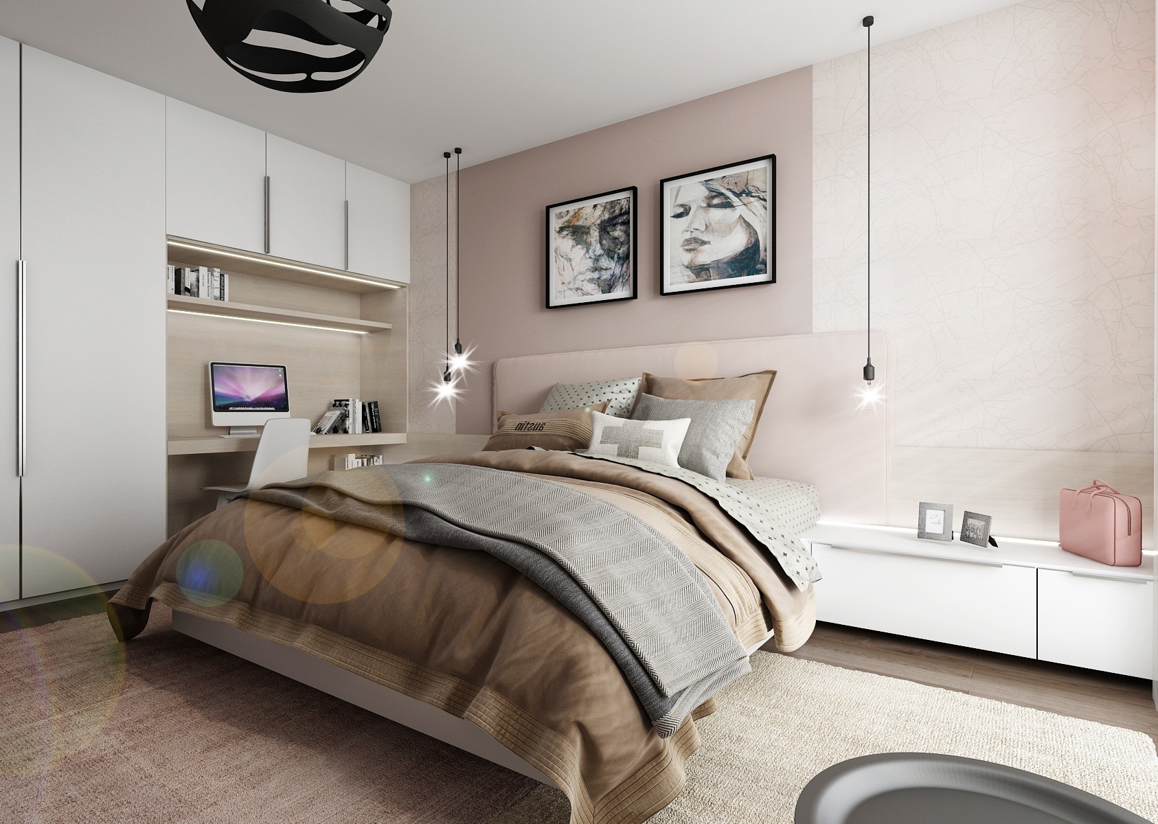 Do interiéru dámské ložnice jsme použili starorůžovou barvu, která se hodí jak k bílé na dvířkách, tak doplňkově k tmavému odstínu kouřového dubu na podlaze. Skříně na míru zajišťují dostatek úložného prostoru. Šatní tyč je navíc umístěna i v rámci niky nad postelí, kde lze pověsit jak oblečení a ostatní drobnosti, tak i závěsné žárovky E27 jako osvětlení u postele.