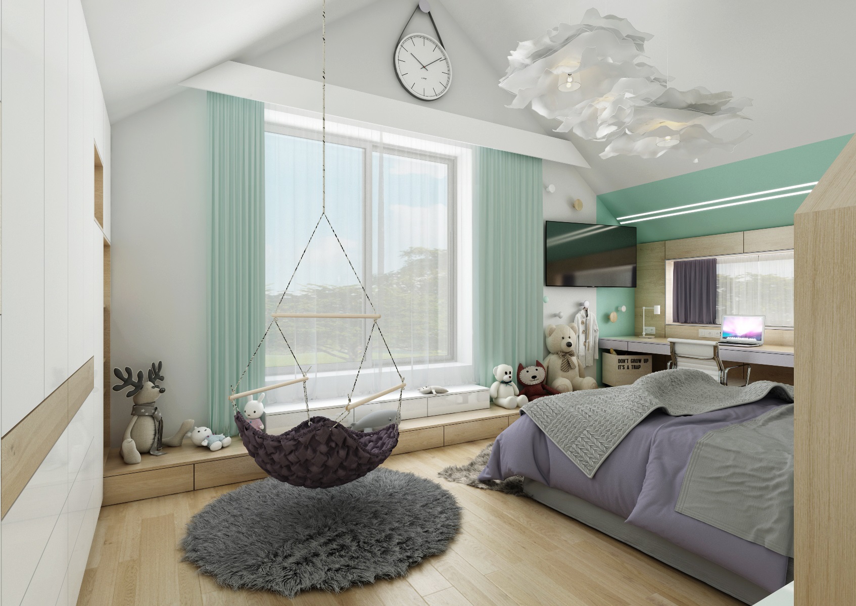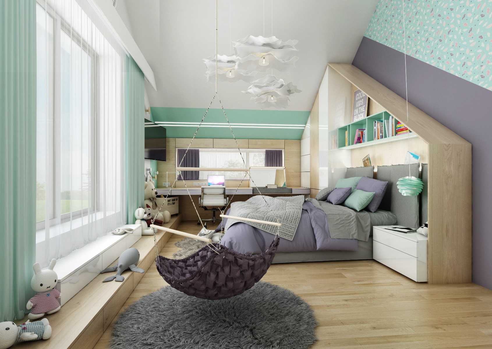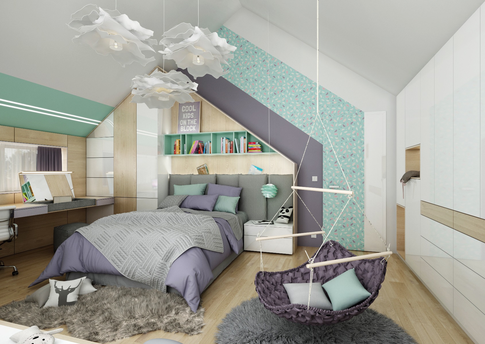 Hlavním prvkem pokoje je nábytková sestava postele se skříní (tvar domečku), která kopíruje zešikmený strop pokoje. Pod oknem dál navazuje pracovní stůl s výklopným (zrcadlem) toaletním stolkem.