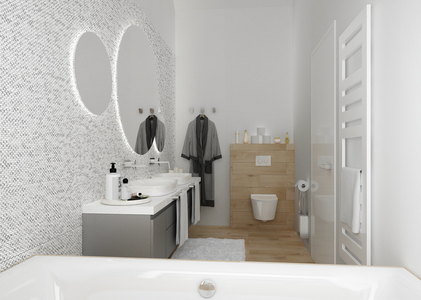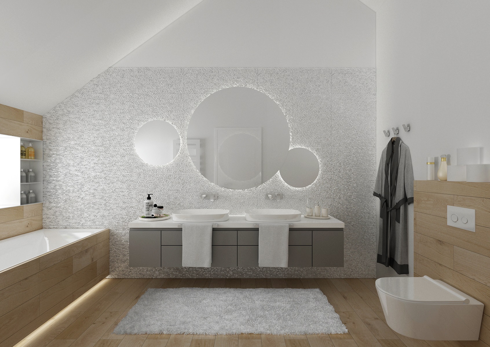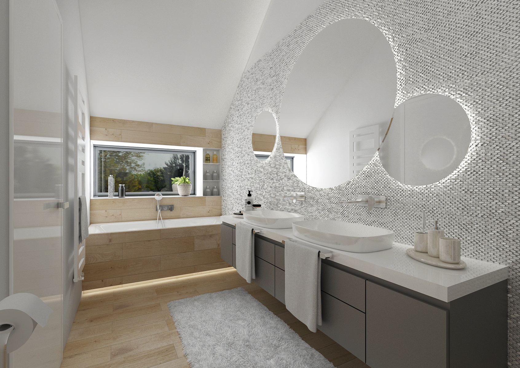 V koupelně je použita keramika od firmy Porcelanosa, například mozaikový obklad Madison Nacar.