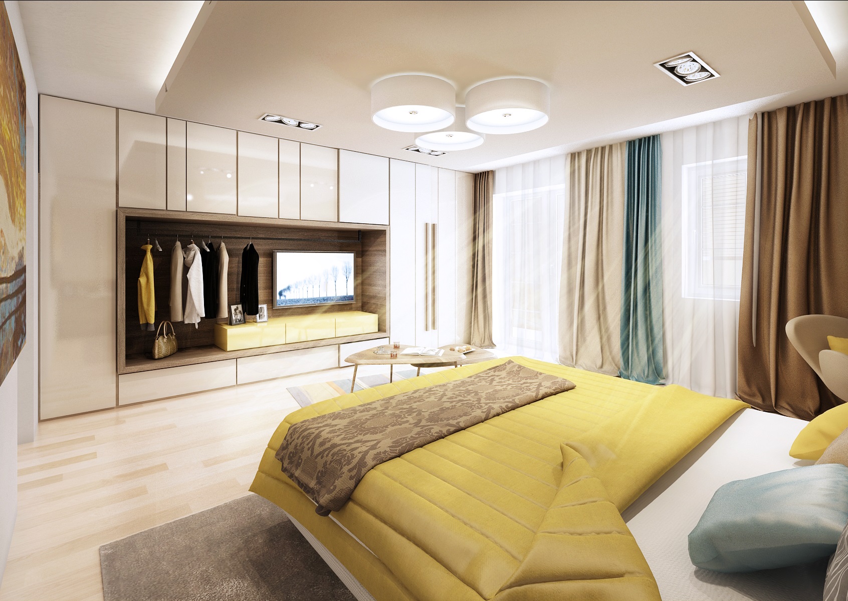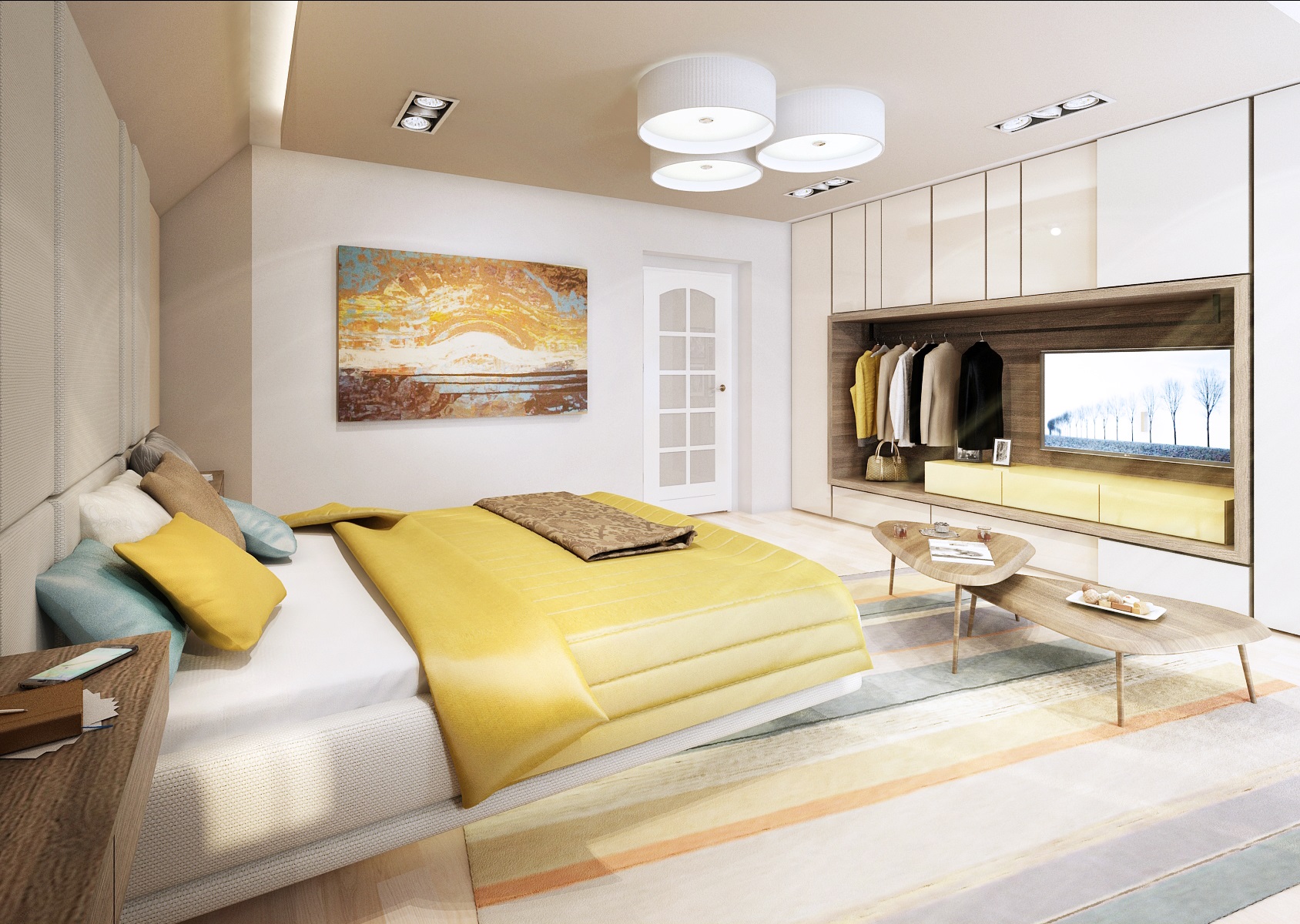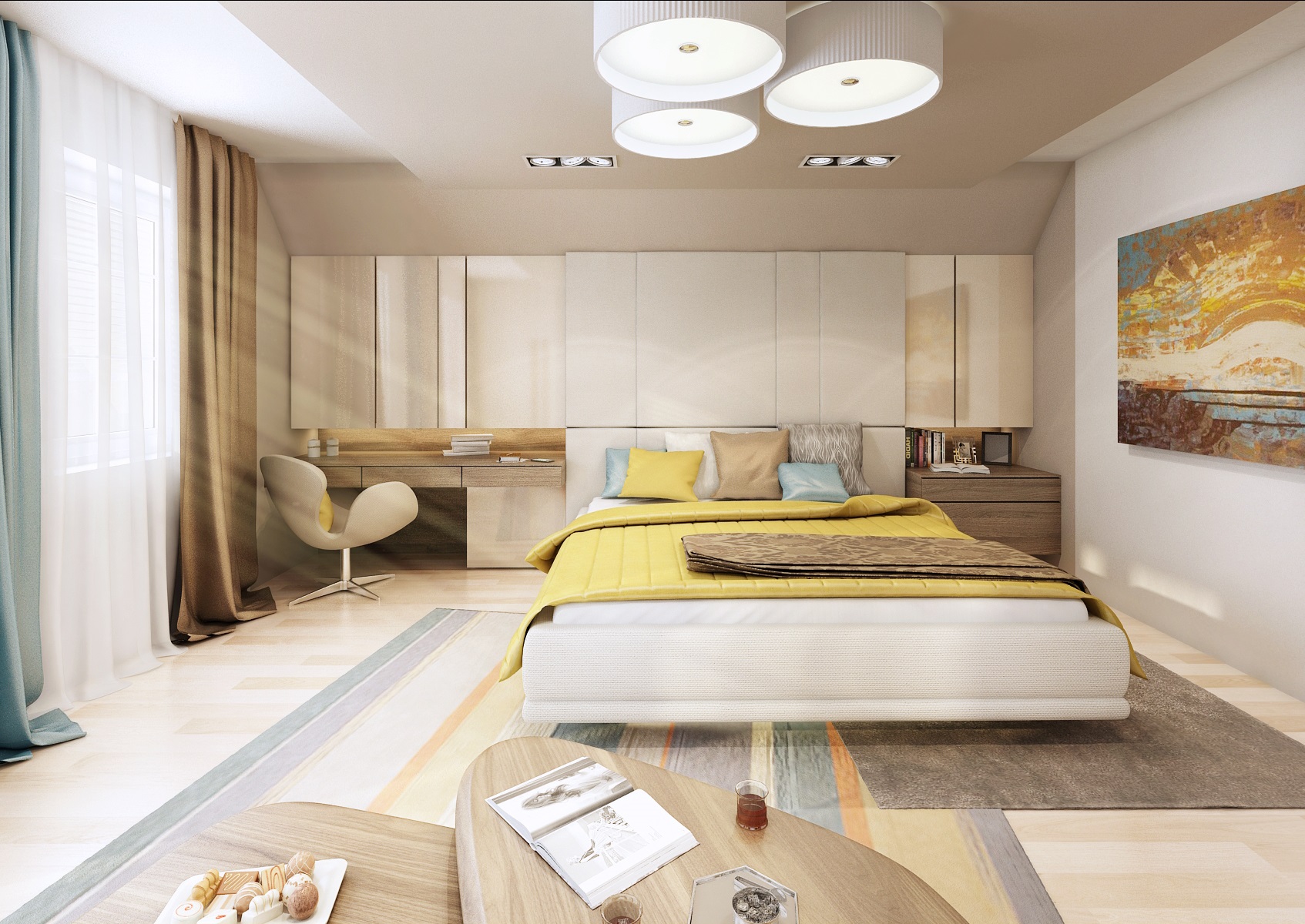 Ložnice rodinného domu v prostorově velmi štědrém interiéru je navržena ve světlých béžových odstínech s kontrastem tmavého dřevodekoru, hořčičné žluté a tyrkysové barvy. Kolem čalouněného čela postele navazují po bocích lesklé béžové obklady, za kterými se ukrývá úložný prostor nebo zrcadlo k toaletnímu stolu, využívá se tak prostor pod šikminou.