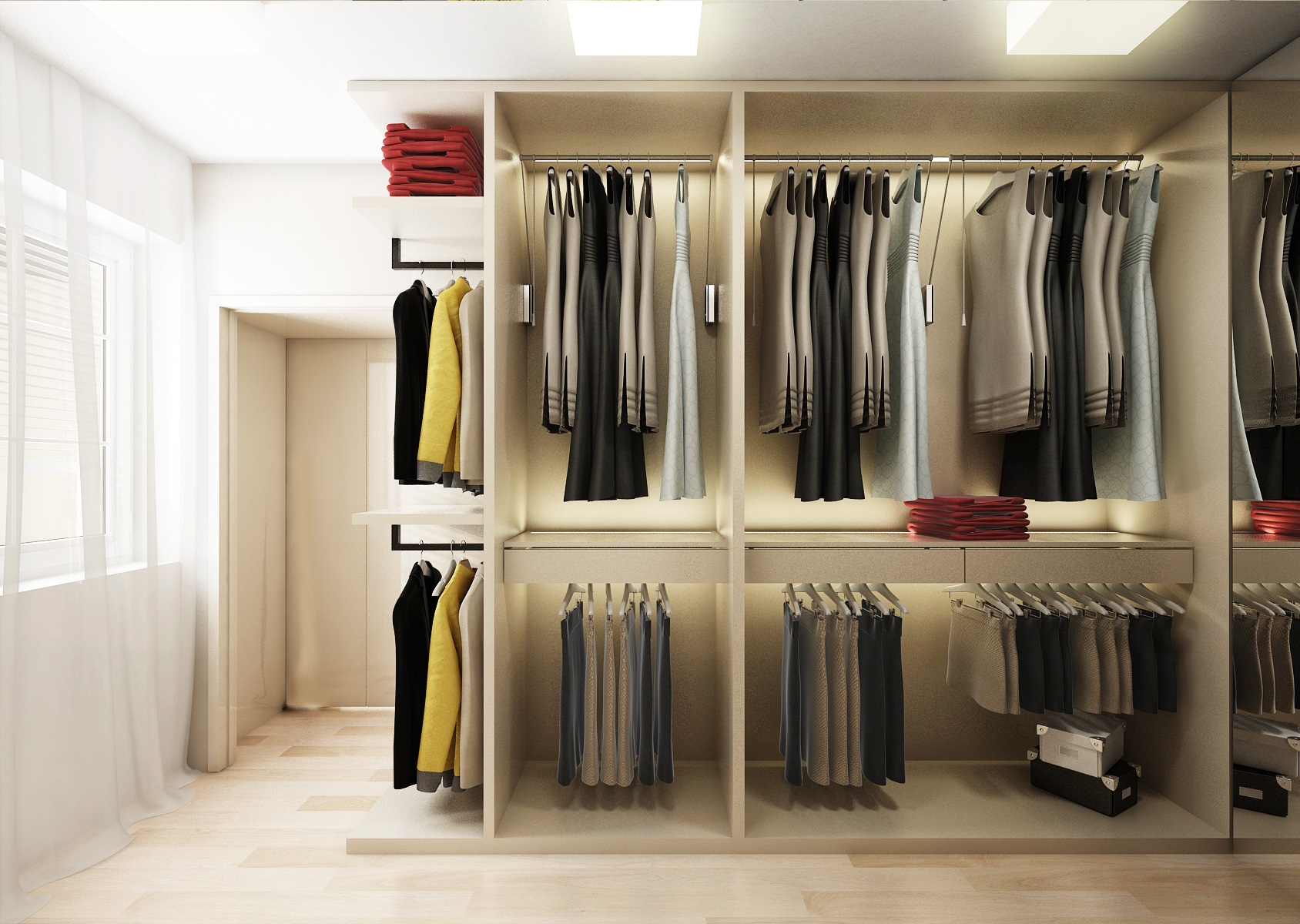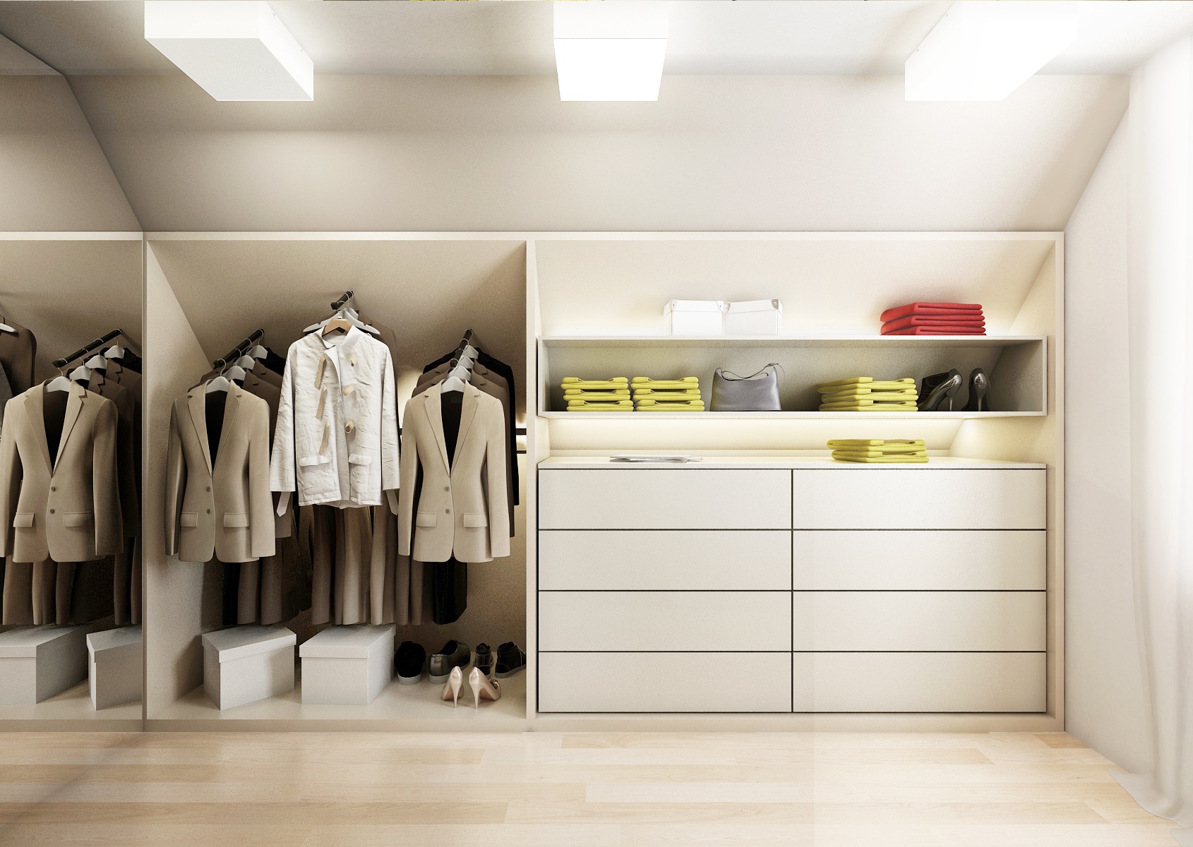 Důmyslně ukrytá je i prostorná šatna, do které se vstupuje dvoukřídlími dveřmi v TV stěně. Vchod vyvolává pocit, že jde pouze o vestavnou skříň.