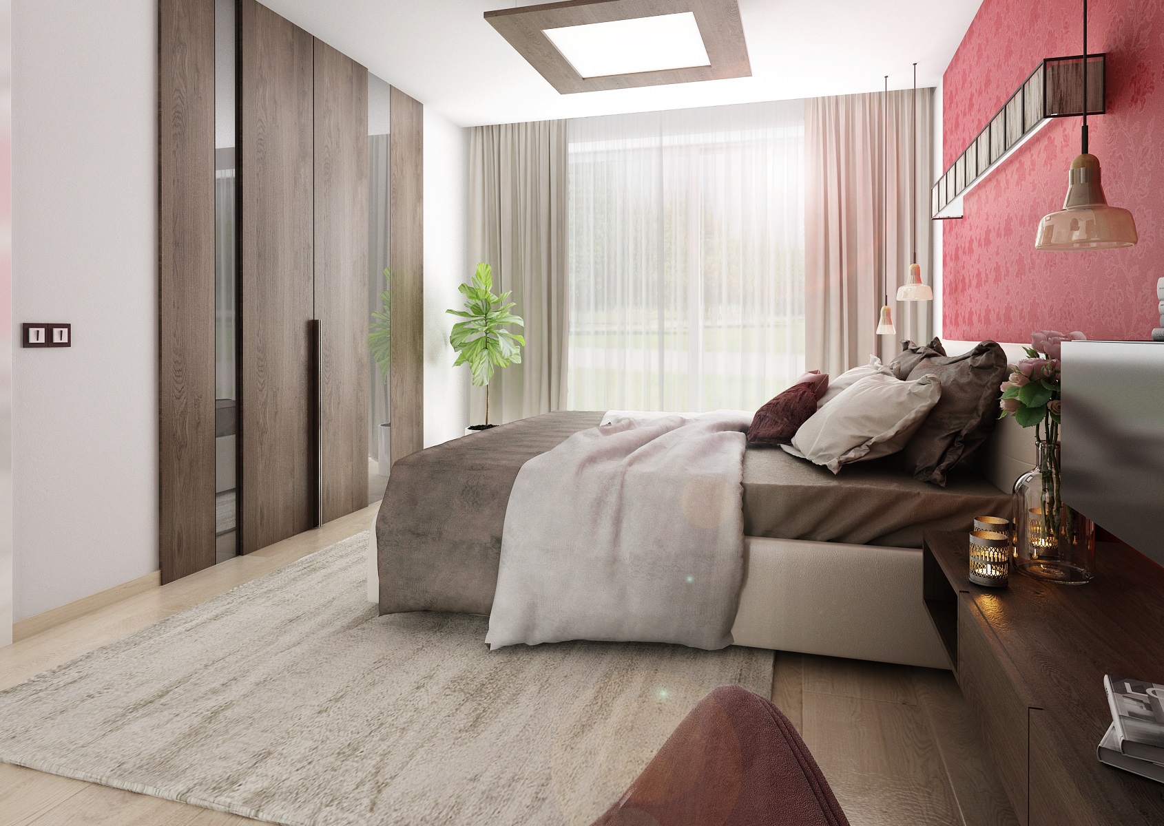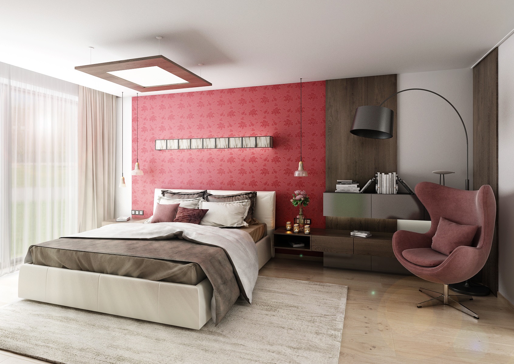 Design interiéru ložnice s výraznou červenou tapetou