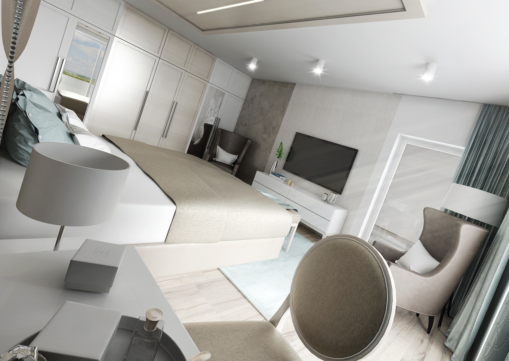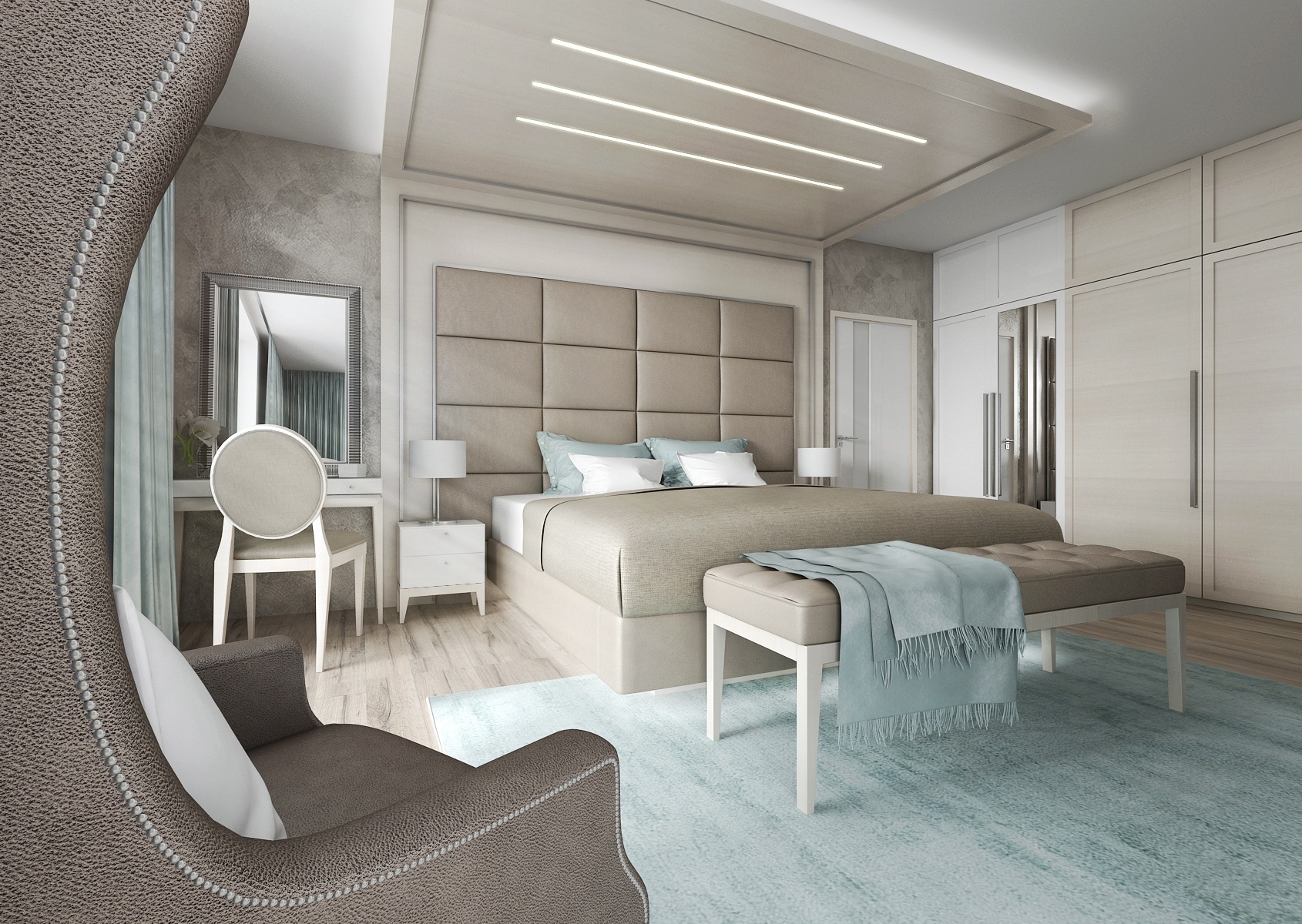 v návrhu ložnice s přilehlou šatnou. Ústředním prvkem prostoru je dvoulůžková postel s vysokou matrací. Díky podsvětlenému rámu se skleněnou nohou postel "levituje" v prostoru. Luxusní dojem umocňuje výrazné čalouněné čelo s kazetovým obložením stěny a