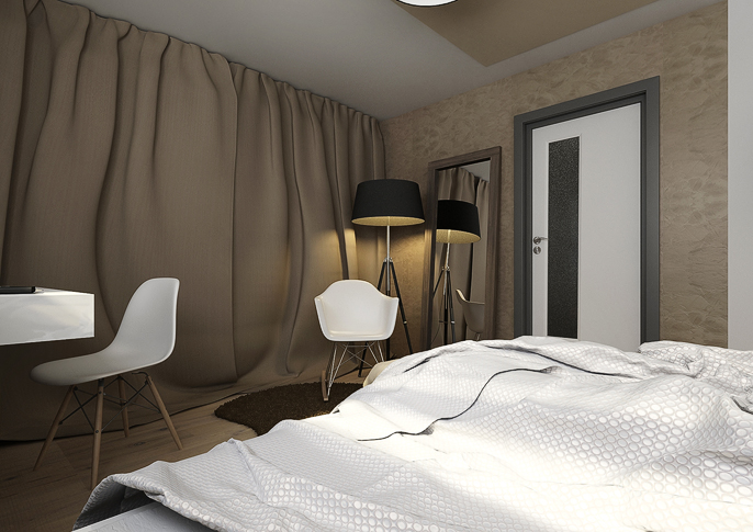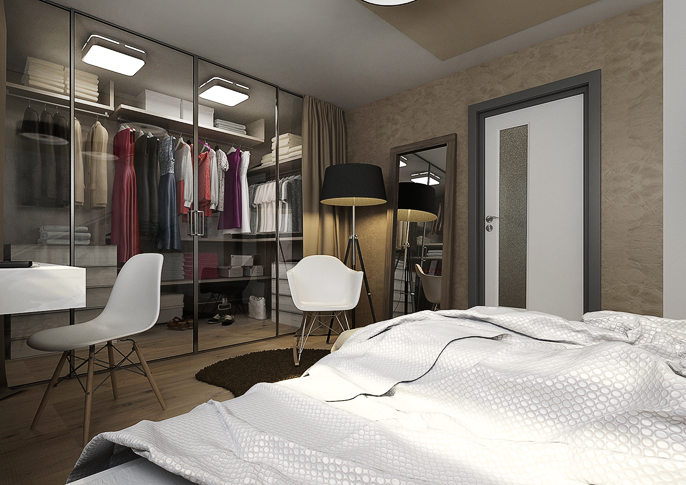 Návrh ložnice v zemitých barvách. Vestavnou skříň nahradila šatna s posuvnými skleněnými dveřmi. Úložné prostory, v případě potřeby, lze pohledově oddělit závěsem. Skleněný oddělovač šatny od ložnice působí moderně a luxusně.