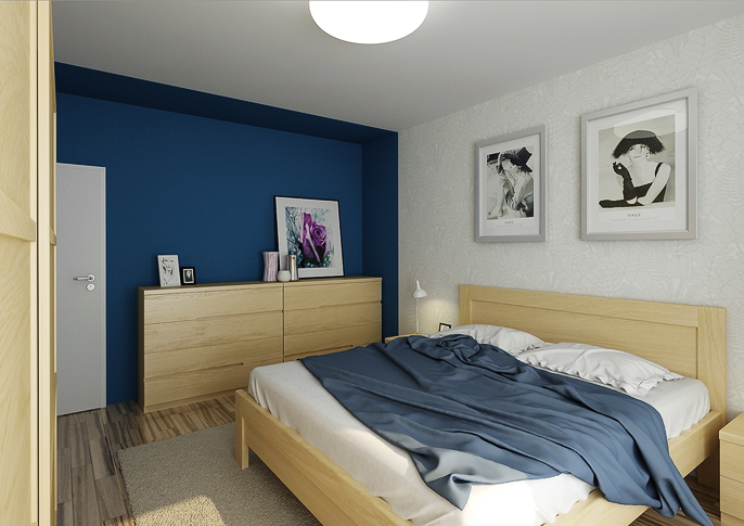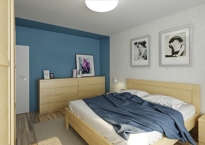 Varianty modrobílé ložnice jsou vybaveny masivním dubovým nábytkem, jež působí solidně a bytelně. Interiér je dekorován tapetou s nenápadným rostlinným motivem.