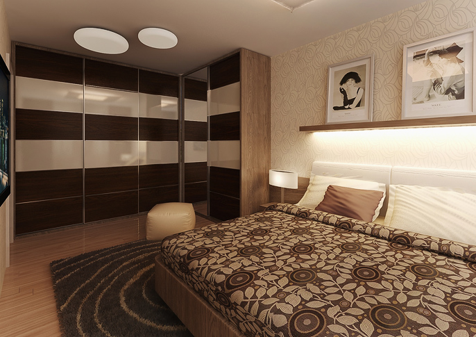 Návrh ložnice se nese v odstínu zemitých barev a příjemném retro stylu. Úložné prostory jsou řešeny vestavnými skříněmi s posuvnými dveřmi. Díky kombinaci s bílou působí prostor útulně a pohodlně. Místnost dostatečně prosvětlují velká okna, která je možné zatáhnout závěsem v hnědém odstínu.