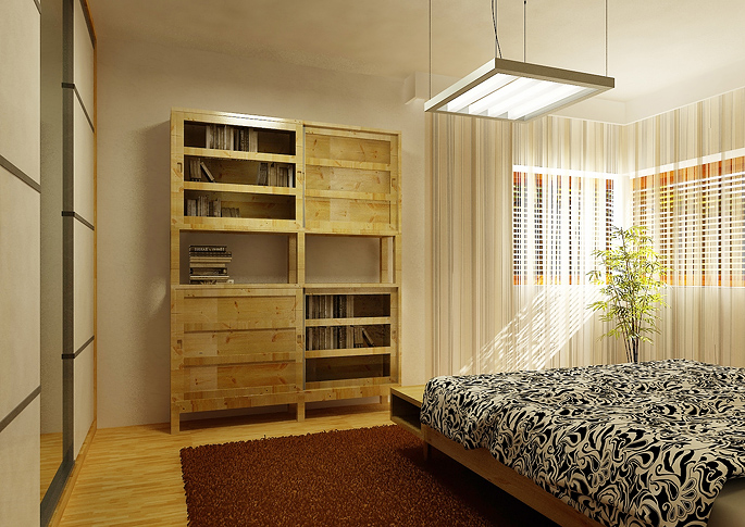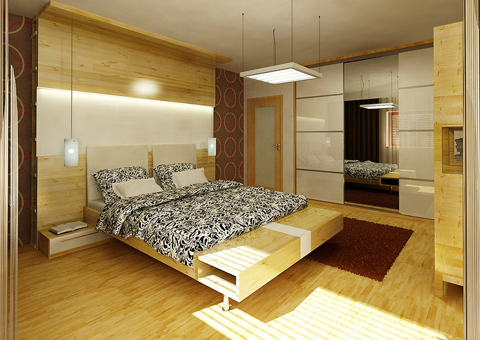 Prostorná ložnice zpestřena nábytkem ze smrkového masivu, který místnost spojuje s přírodou. Světlé dřevo je kombinováno s bílými prvky a vínovými a hnědými doplňky. Světlé tóny barev interiér dostatečně projasňují. Dostatek přirozeného světla zařizují velká rohová okna. Prostor je opticky zvětšován velkým zrcadlem na dveřích šatní skříně. Zajímavým prvkem jsou závěsná svítidla nad nočními stolky kotvena ve stropě.