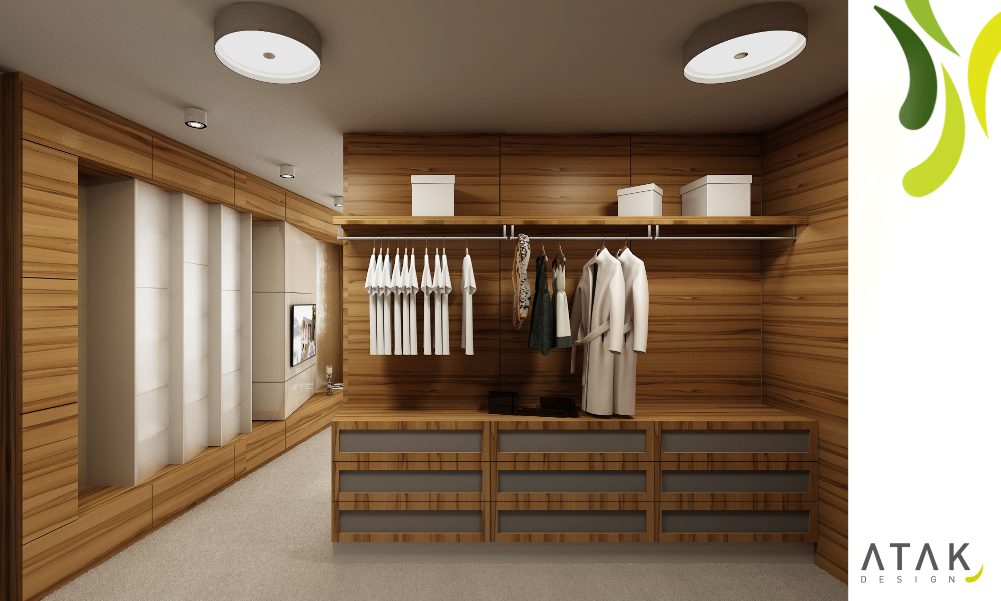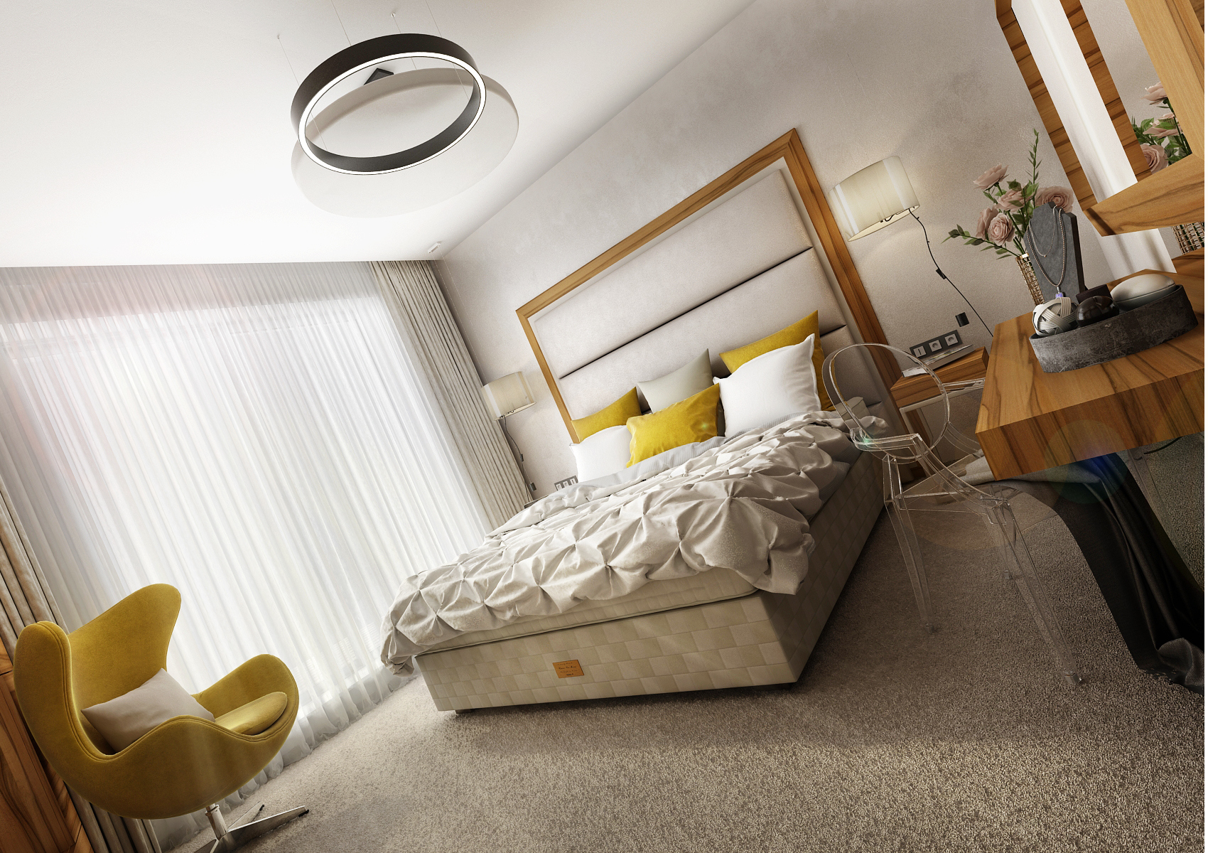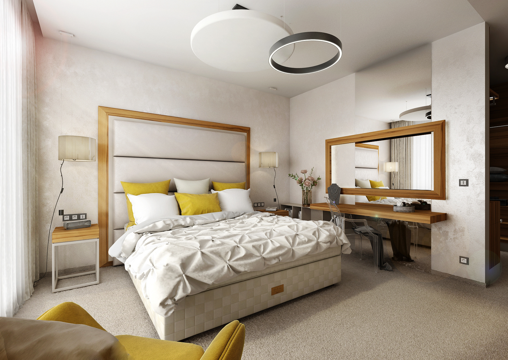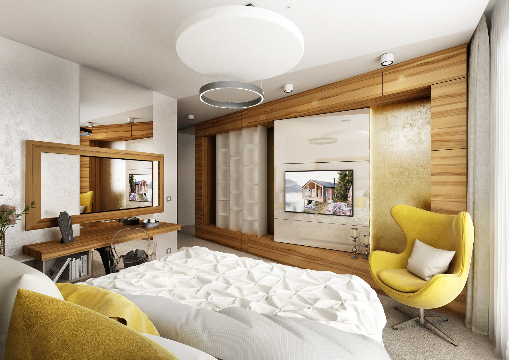 Luxusní postel značky Hästens je doplněna o čalouněné čelo zvýrazněné masivním rámem. Masivní rám je příčně zavěšený i přes velkoformátové zrcadlo za toaletním stolkem. Lůžko je od dveří opticky odděleno šatnou, kterou představují dvě nábytkové paralelní sestavy. Šatna je průchozí směrem do koupelny. Do „rámu“ jsou uspořádány skříňky a zásuvky na protější stěně postele. Vnitřní část tvoří na koso vestavěný televizní panel a knihovny uzavřené za podsvícené mléčné sklo. Záda jsou vymalována zlatou stěrkou. Z materiálu převládá lakovaná dýha přírodního Makasaru a lak barvy Solid světle šedé a Prémiově bílé, použitý na nábytku jak v lesku tak matu. Vše ladí s nástěnnou stěrkou se stříbrným akcentem a kobercem s vysokým vlasem.