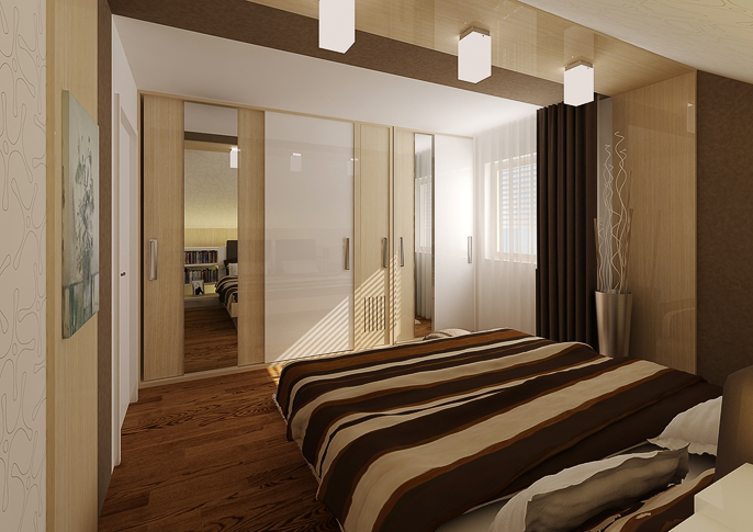 Užití různých odstínů hnědé v kombinaci s bílou vnáší do místnosti kontrast, aniž by působilo rušivě. Lesklé dýhové obklady s výraznou barevnou texturou na stěnách a florální či organický motiv na šikmém stropě prostor dekorují a činí jej opticky čitelnějším.