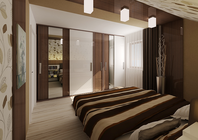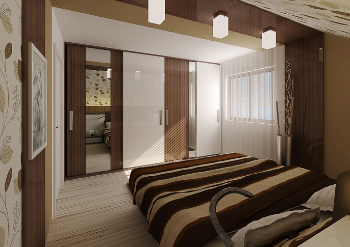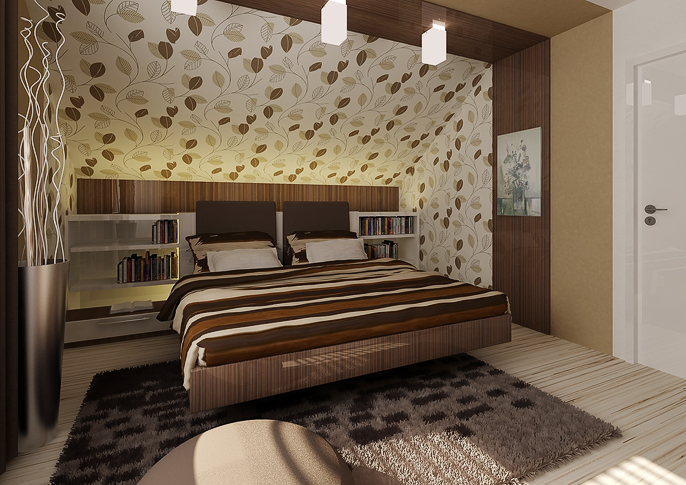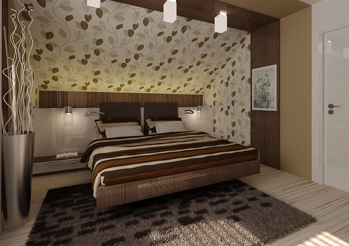 Moderní design ložnice v kombinaci hnědé a bílé barvy
