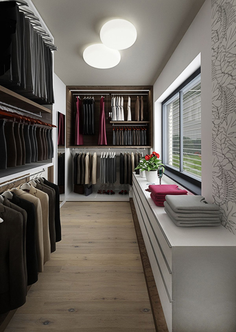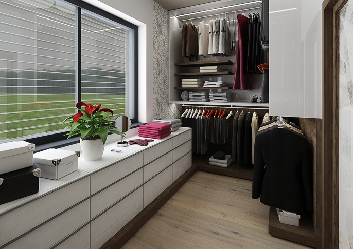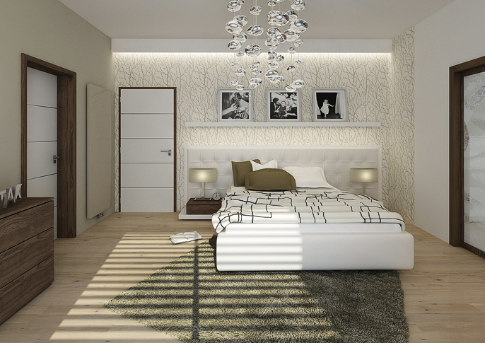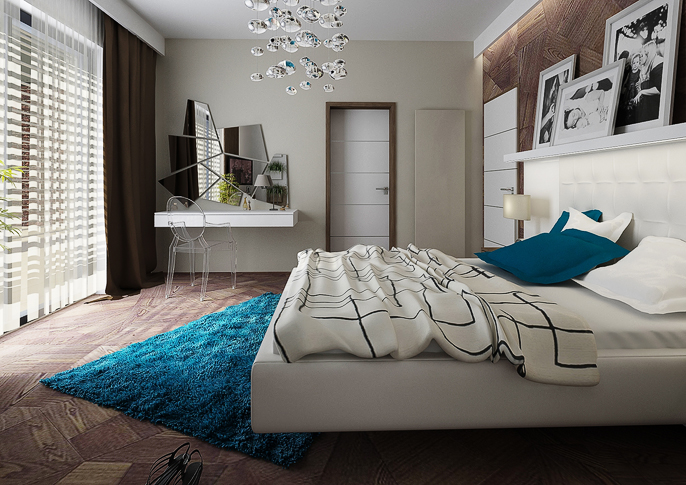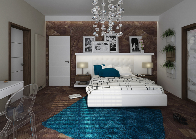 Návrh ložnice s netradičním provedení parket, které vybíhá i na stěnu za postelí. Atypický tvar parket kopíruje i zrcadlo u toaletního stolku. Tmavé parkety jsou v kontrastu se světlým nábytkem a výmalbou, což místnost dělá světlejší. Je dostatečně prosvětlena i díky velkým oknům naproti postele. Nechybí ani prostorná šatna.
