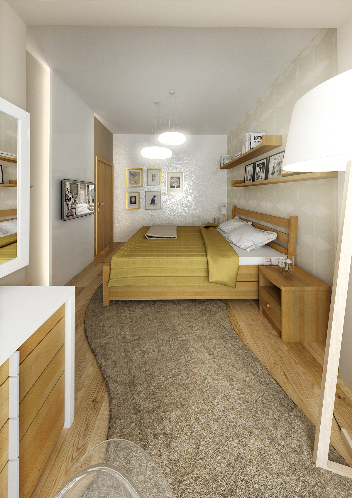 Ložnice pro hosty/ pro babičku je vyvedena v tlumených zemitých barvách. Dominantním prvkem je klasická masivní buková postel od české firmy Spíme. S postelí je sladěno zbylé zařízení pokoje. Nábytek na míru je vyhotoven v základní bílé v kombinaci s bukovou dýhou. Na míru je vyveden i tvarovaný kusový koberec Miroo. Nechybí ani toaletní či psací stolek a klasický prvek - křeslo zvané "ušák" pro posezení s knihou nebo s pletením. Babička se zde bude jistě cítit jako doma.