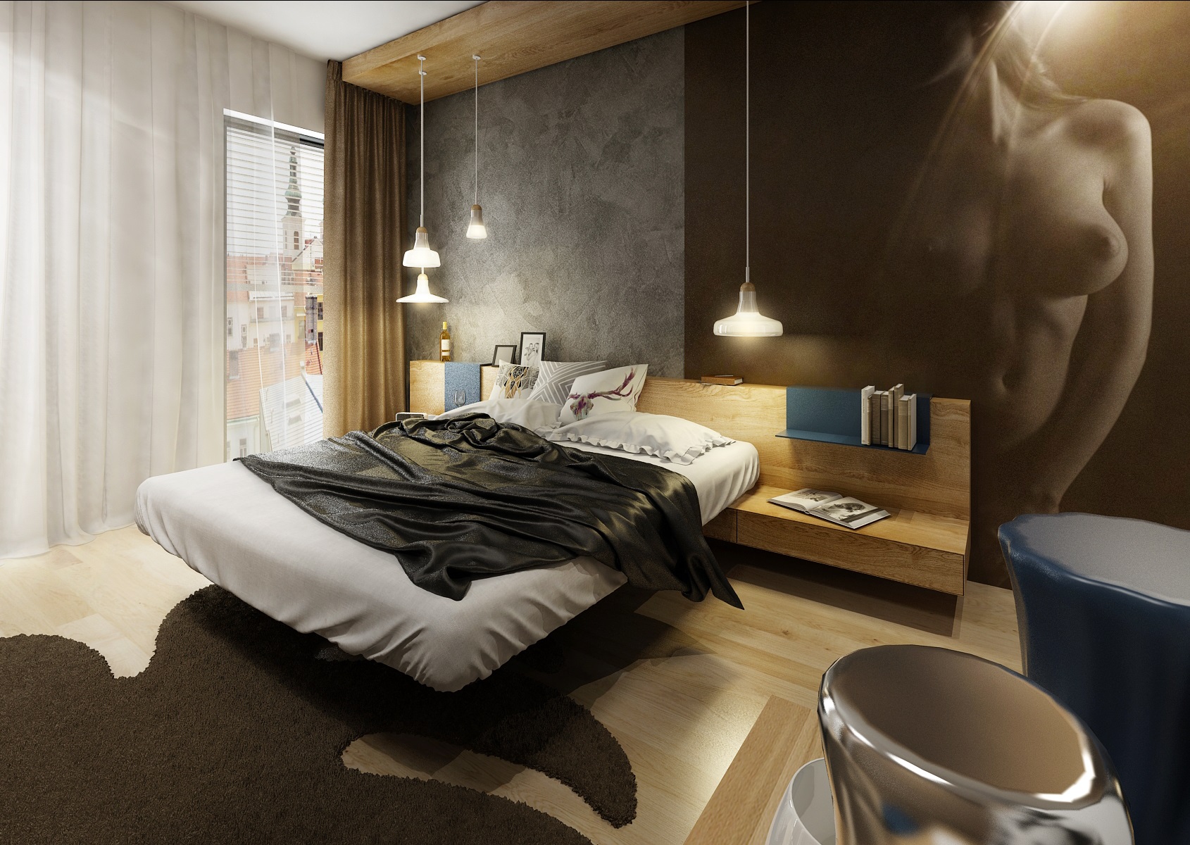 pánská ložnice v tmavých zemitých barvách a šedé stěrce. Postel a noční stolky jsou v provedení dubové dýhy a dojem levitace je dosažen ukotvením nábytku do stěny a použitím podnože ze skla. Šatní skříň je skryta za textilními dvířky od Lago.