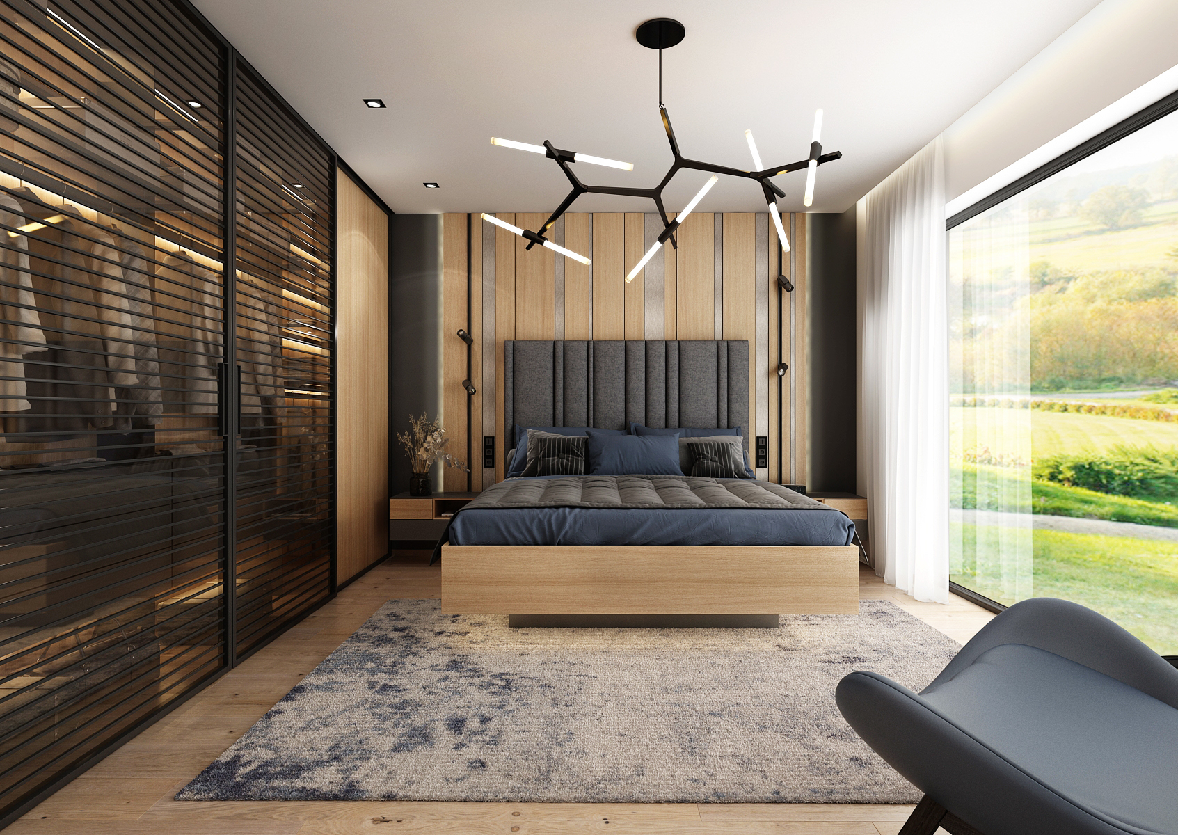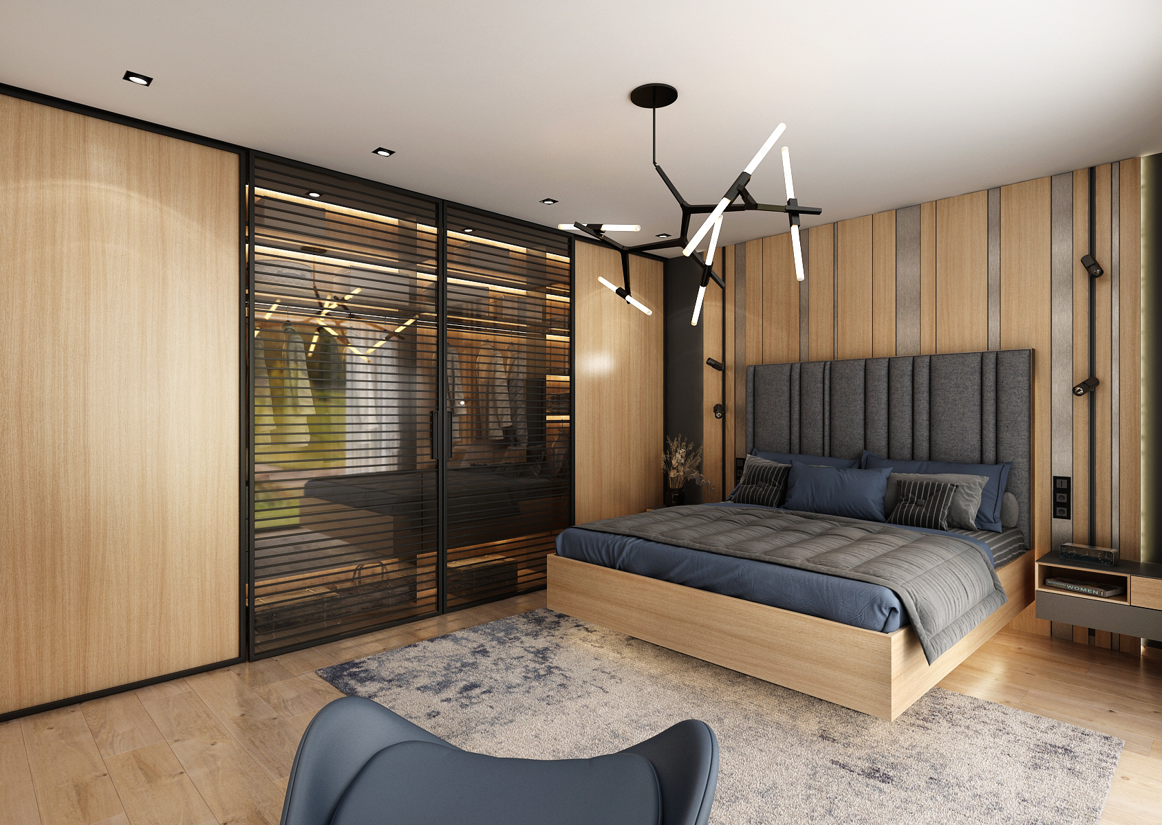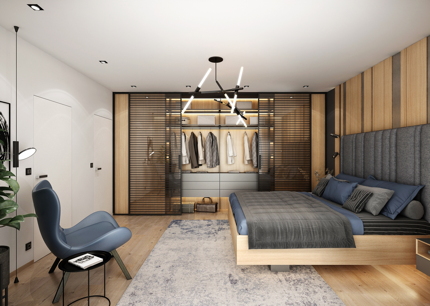 Pánská ložnice s prosklenou šatnou je laděna do tmavých barev v kombinaci s dubovým dřevem a elegantními stříbrnými detaily.