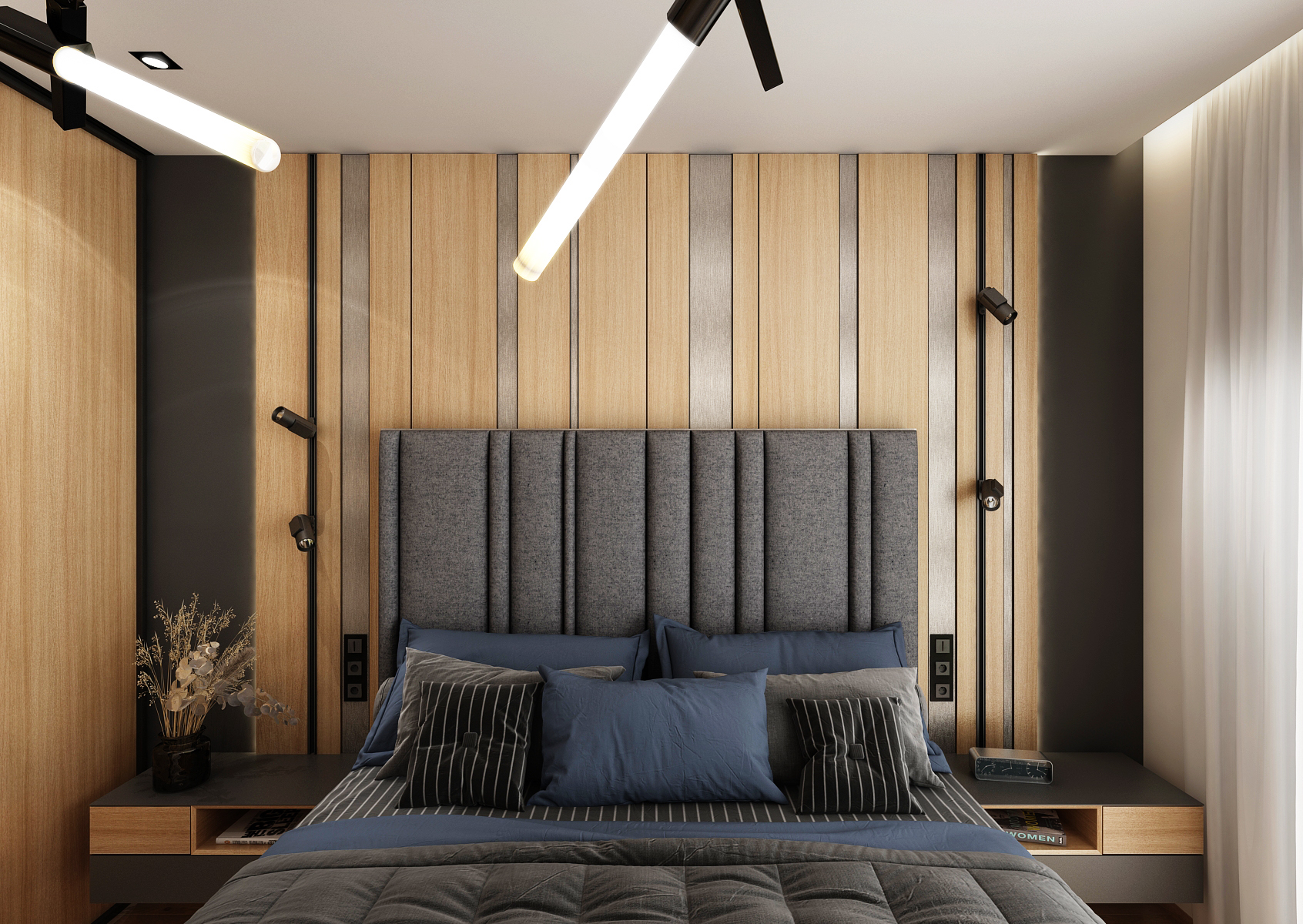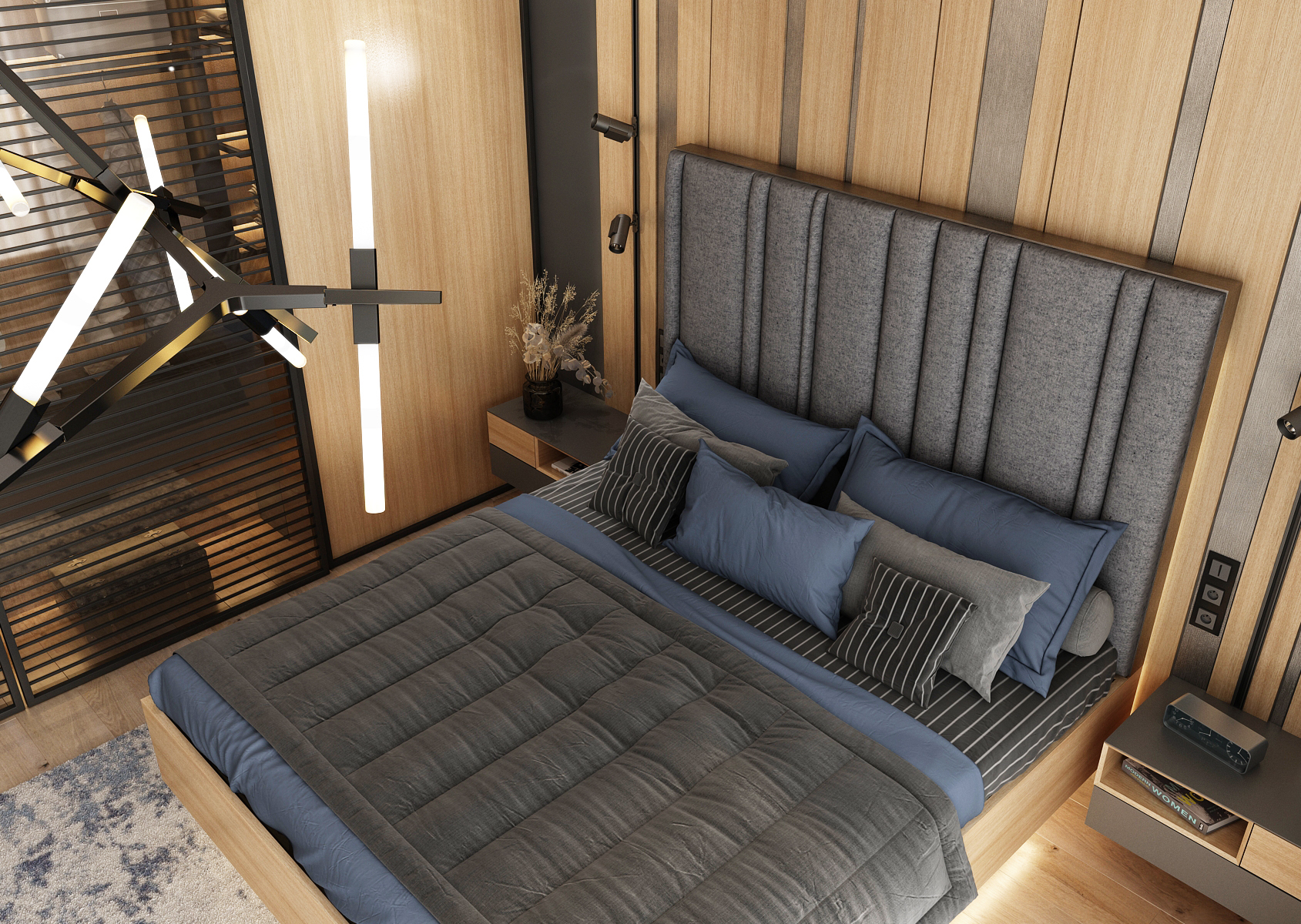 Prostorné lůžko s čalouněným čelem budí dojem levitace díky schované podnoži a podsvícení zespod konstrukce. Stěna s dřevěným obkladem postelovým čelem je doplněna jak stříbrnými detaily, tak i černými, díky čemuž desgin působí elegantně. Kromě lůžka se zde také nachází relaxační koutek s odkládacím stolkem a koženým ušákem.