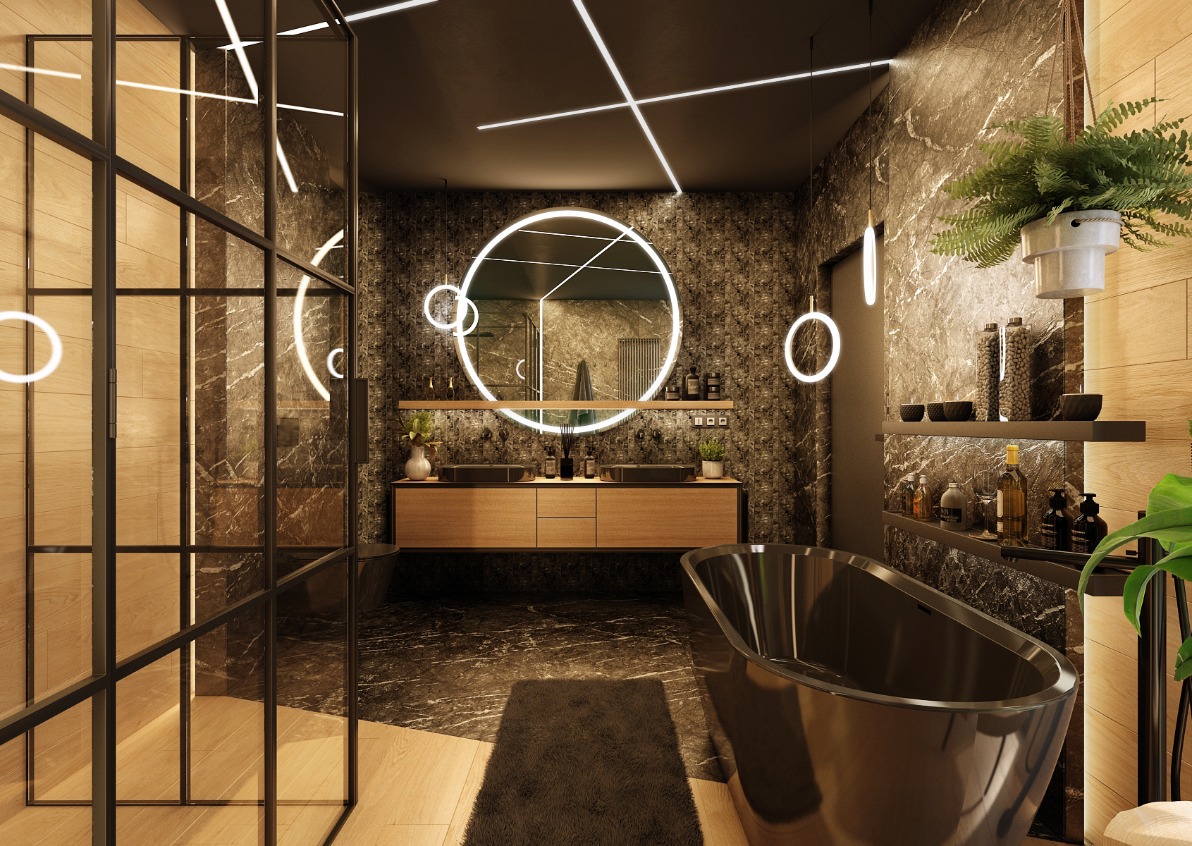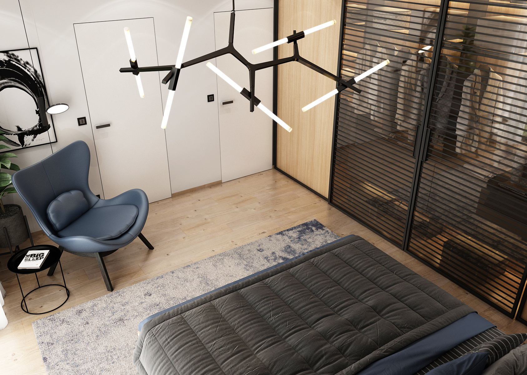Čistotu designu podtrhují také bezzárubňové dveře v bílé s černými detaily a prosklená vestavěná šatní skříň se zasouvacími dveřmi. Kromě denního světla, kterého se místnosti díky velkému francozskému oknu dostává dostatek, díky proskleným dveřím z šatní skříně prosvítá i LED osvětlení polic. Aby toho nebylo málo, minimalismus se objevuje i v koupelně, která disponuje černými mramorovými obklady a stejnobarevným vybavením. I zde ale kontrastuje se světlým dubem.