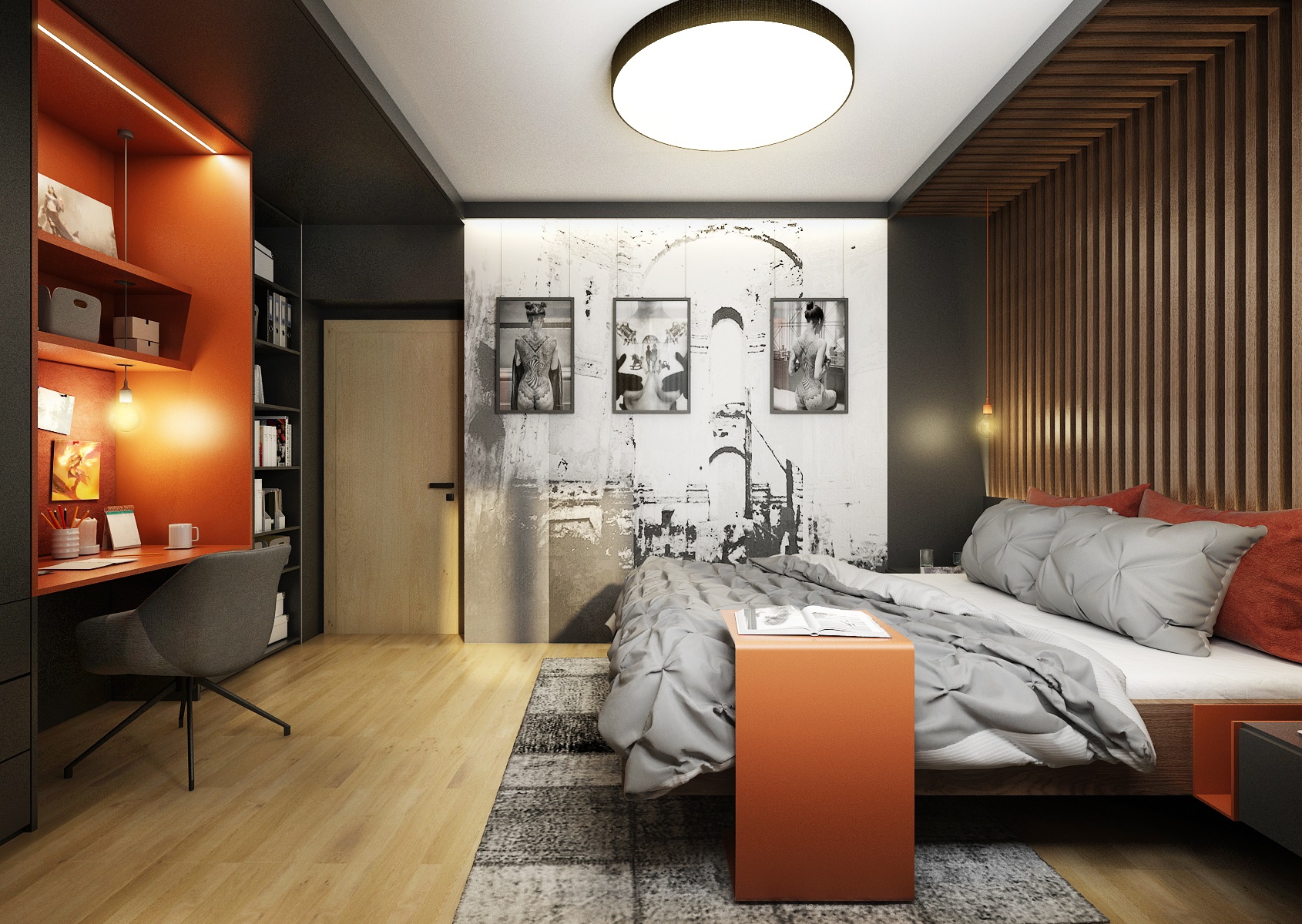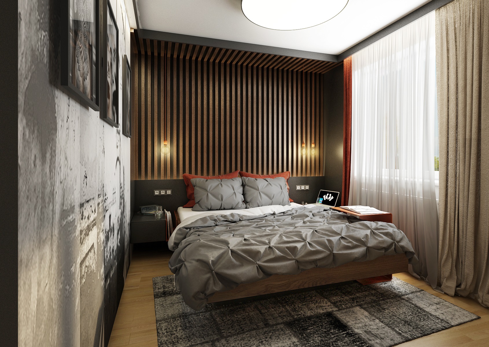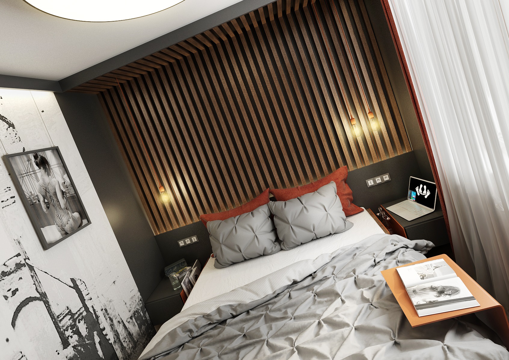 V ložnici nesmí chybět černá barva (nábytek a výmalba), která je příznačná pro tento hudební žánr. Cihlově červená nika, látky a čalounění je pak použita jako dynamický doplněk. Atmosféru pak podtrhuje šedá velkoformátová tapeta.
