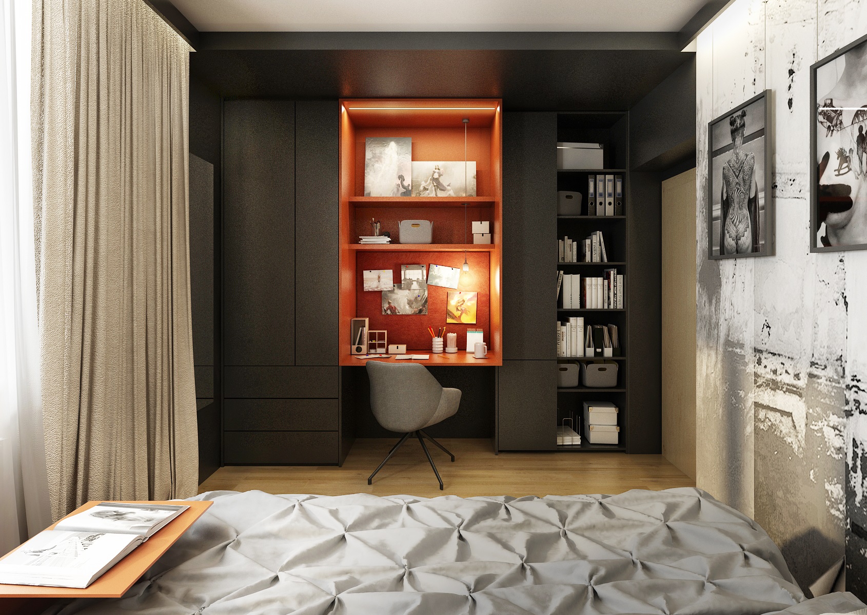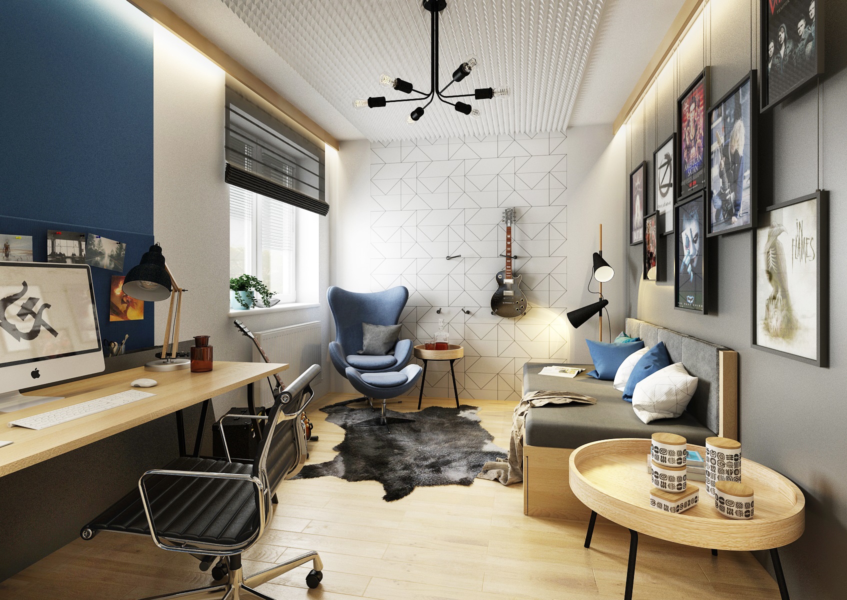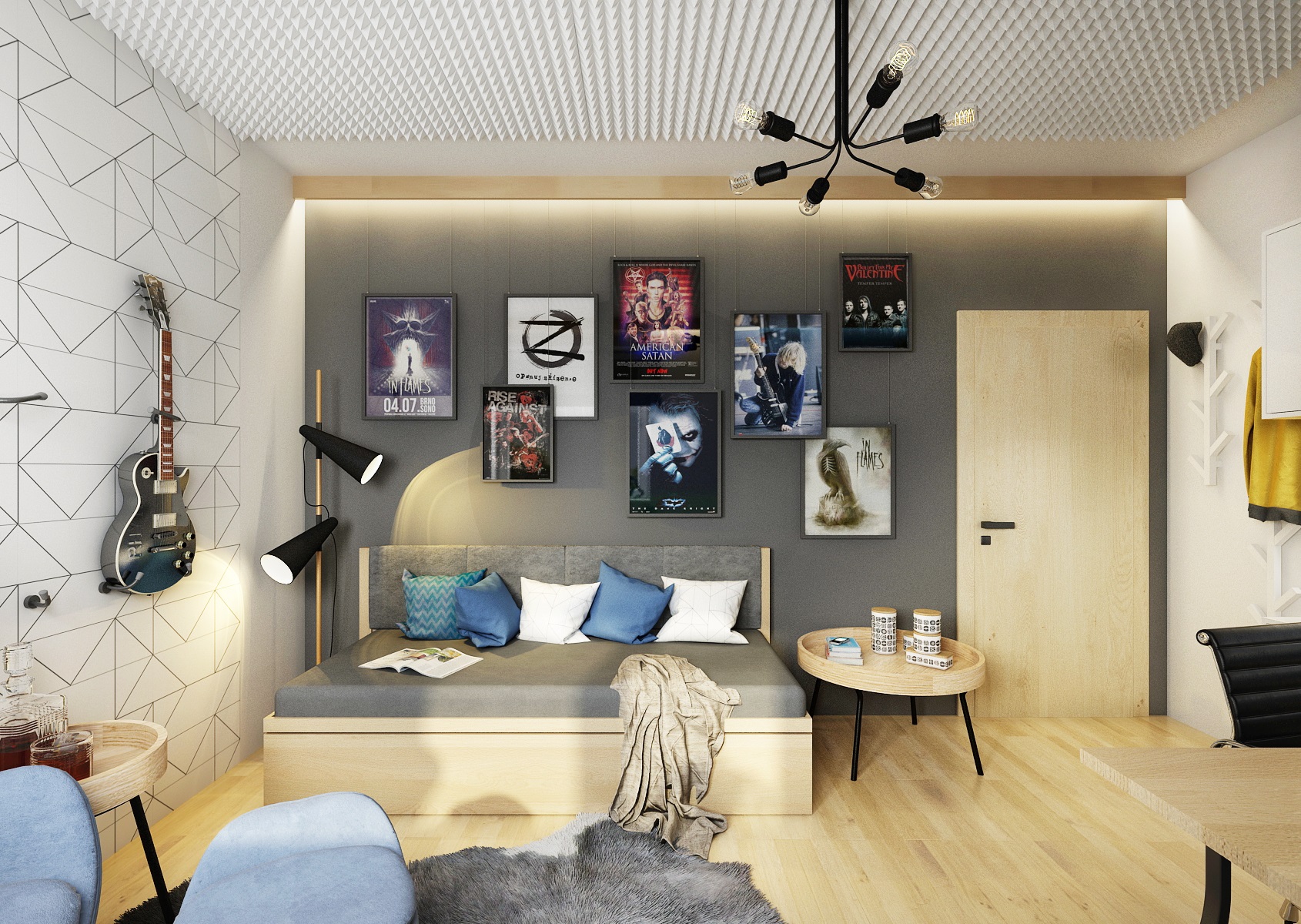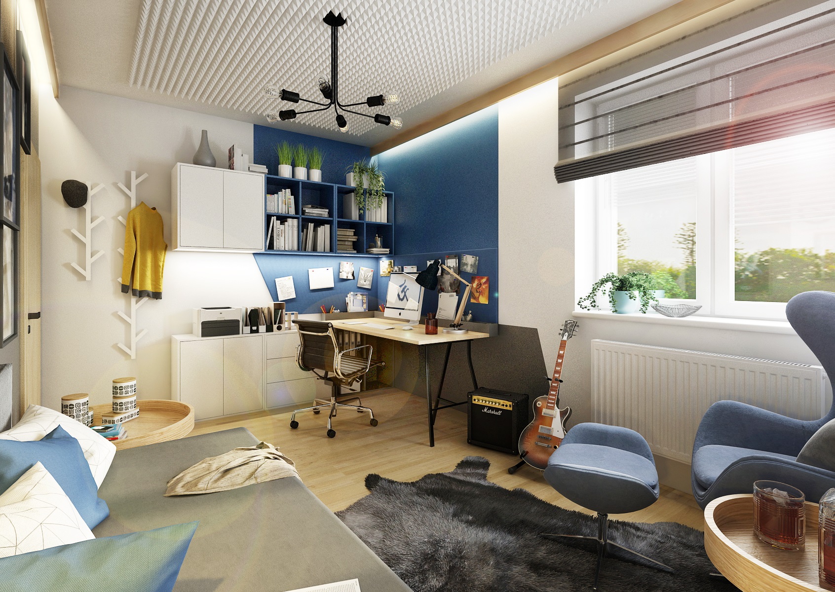 Pracovna je pro majitele zároveň i malá zkušebna, kde může cvičit, například v pohodlném křesle Egg, na el. kytaru nebo skládat hudbu. Na strop jsme použili jehlanovité PUR panely, typické obložení používané ve zkušebnách, pro snížení hlučnosti v uzavřených prostorech. V pokoji je i malá sedací souprava, kterou lze případně použít jako postel pro hosty. Na stěně u stropu jsme za panelem schovali LED podsvícení a závěsný lankový systém, na který si může klient vystavit např. plakáty oblíbených kapel.