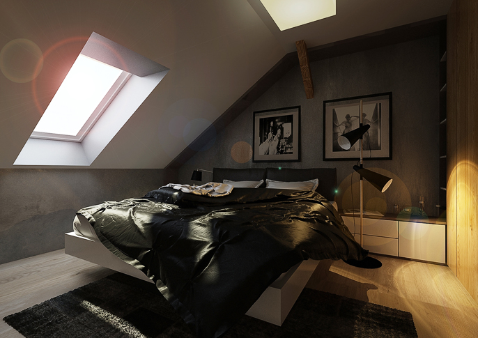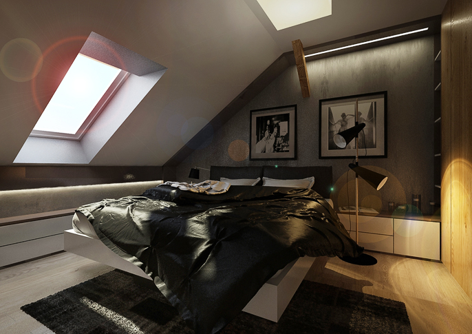pánské ložnice v podkroví. V kombinaci se světlým dřevodekorem a bílými prvky působí luxusně. Světlá podlaha má úkol místnost projasnit. Prostor opticky zvětšuje zrcadlo dveřích šatní skříně. Zajímavým prvkem je podsvícení pod zkoseným stropem na stěně i nad postelí.