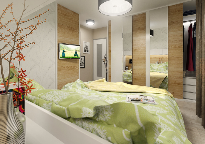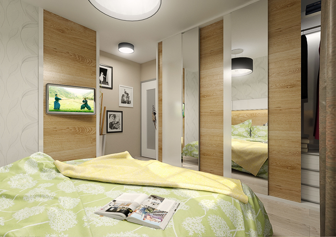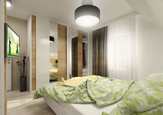 Kombinace dubové dýhy a tapet v podkrovním prostoru. Police s dvířky ve vysokém lesku Fundermax. Podlaha z běleného dubu světlou místnost ještě více projasňuje a dodává jí tak pocit jednoduchosti a čistoty. V interiéru se nachází prostorná vestavná skříň zajišťující dostatek úložného prostoru na oděvy. Zrcadla na dvířkách mají za úkol prostor opticky zvětšovat.