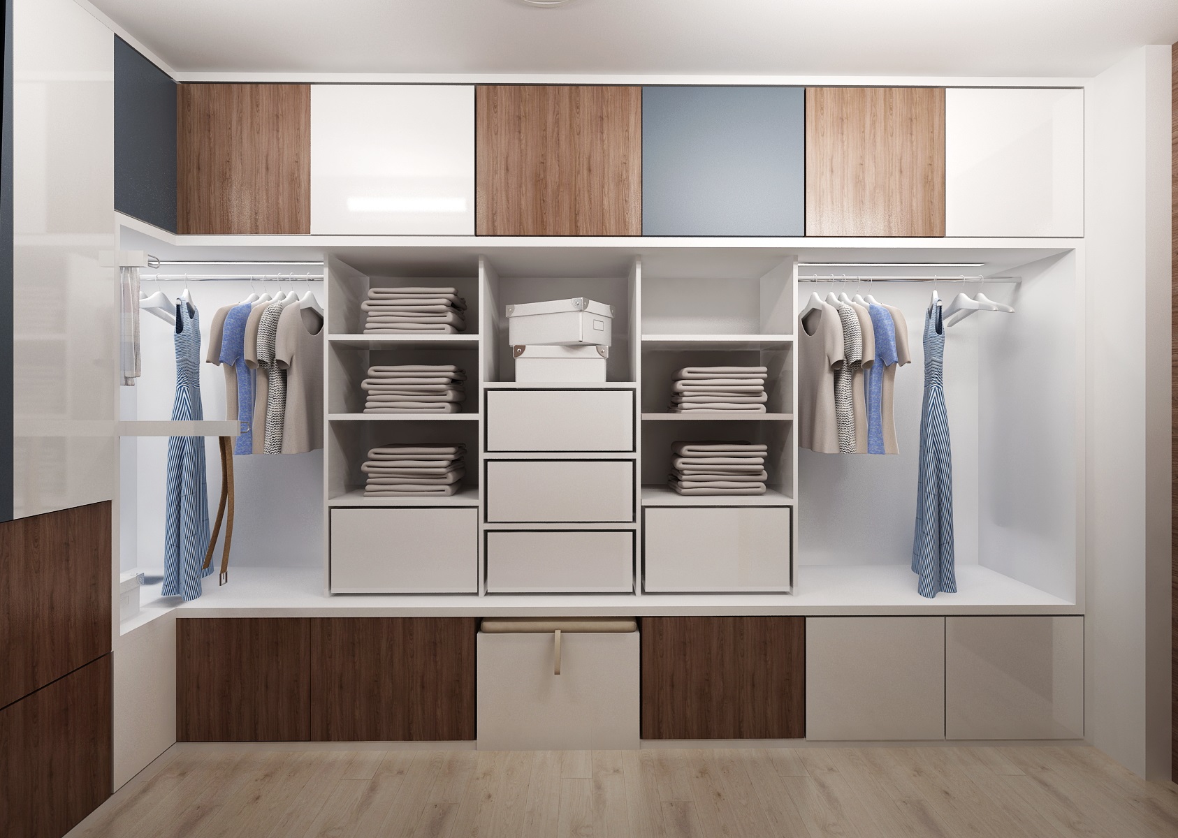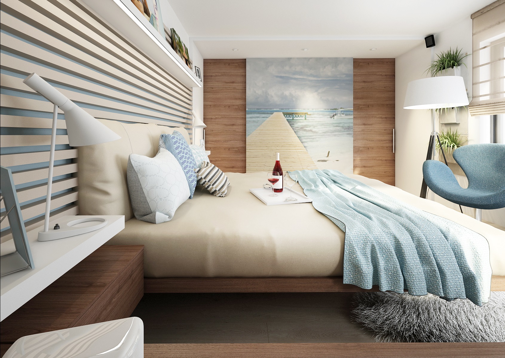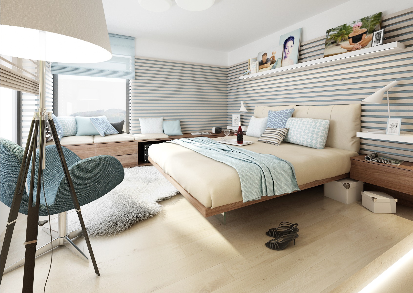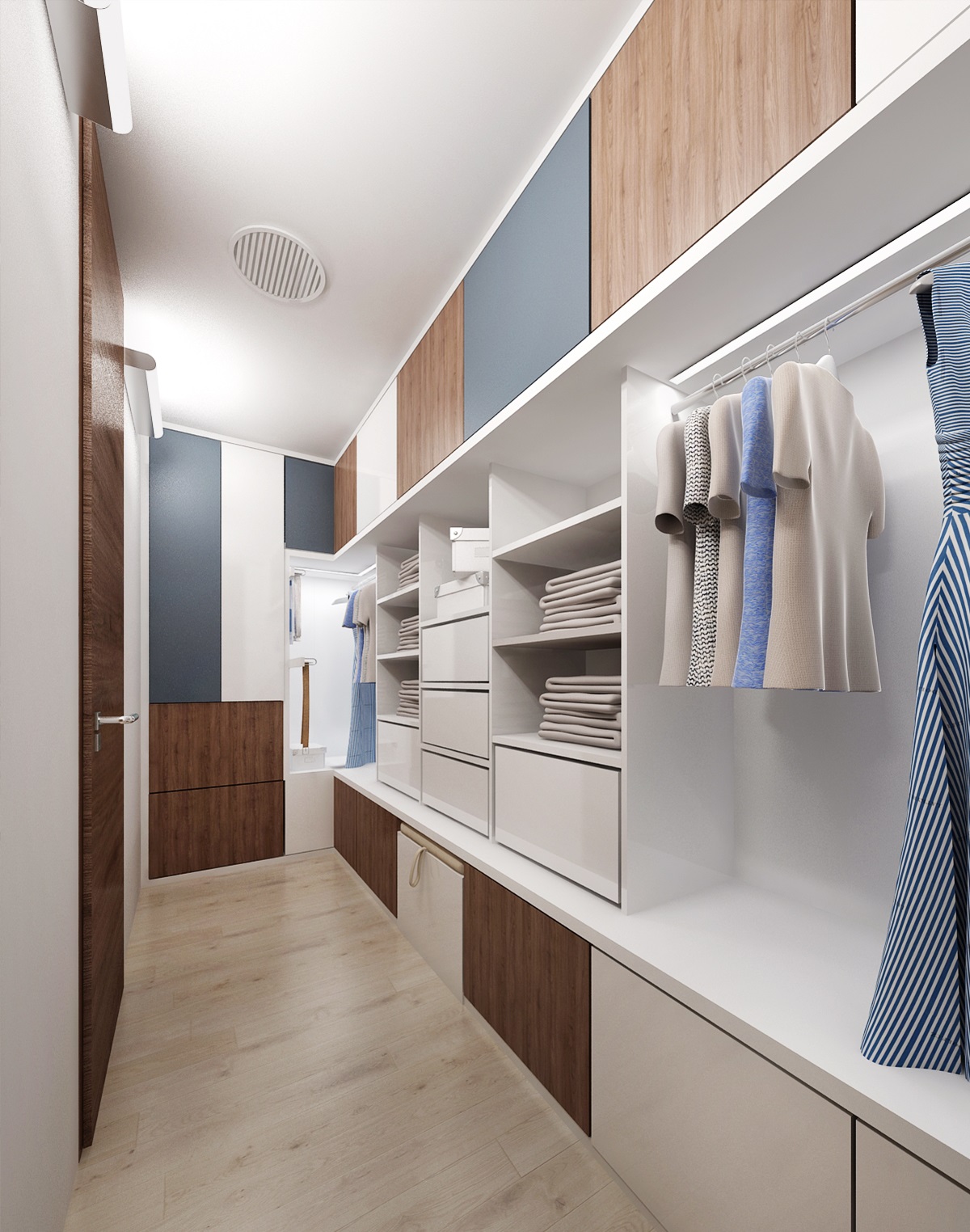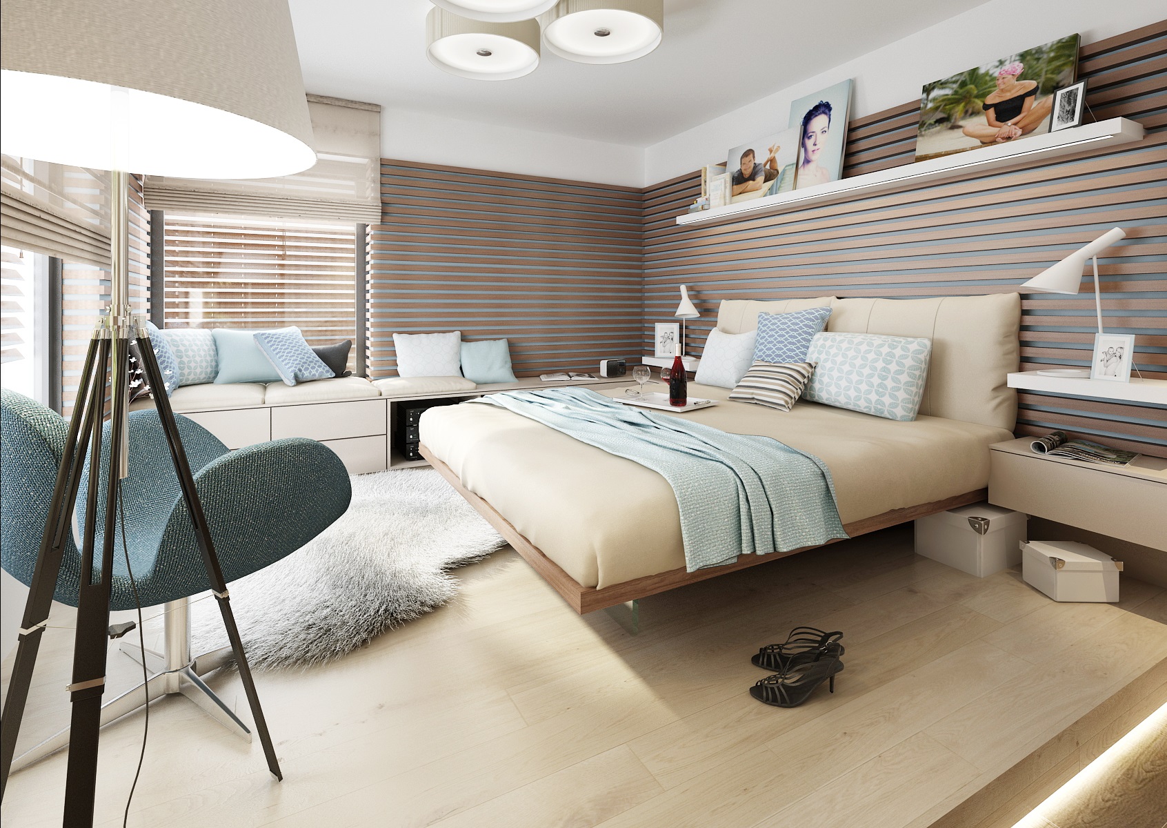 Pastelové barvy v kontrastu tmavším dubovým dřevodekorem jsou použity v návrhu této ložnice se šatnou. Postel je subtilní konstrukce, kotvena ke stěně a podepřena skleněnou nohou.