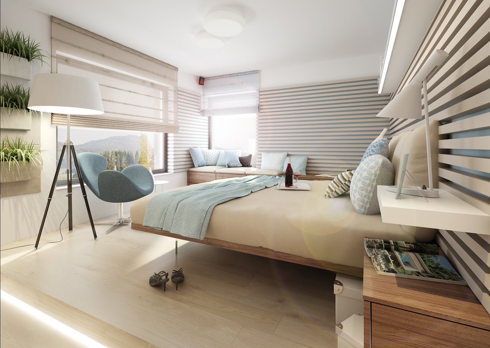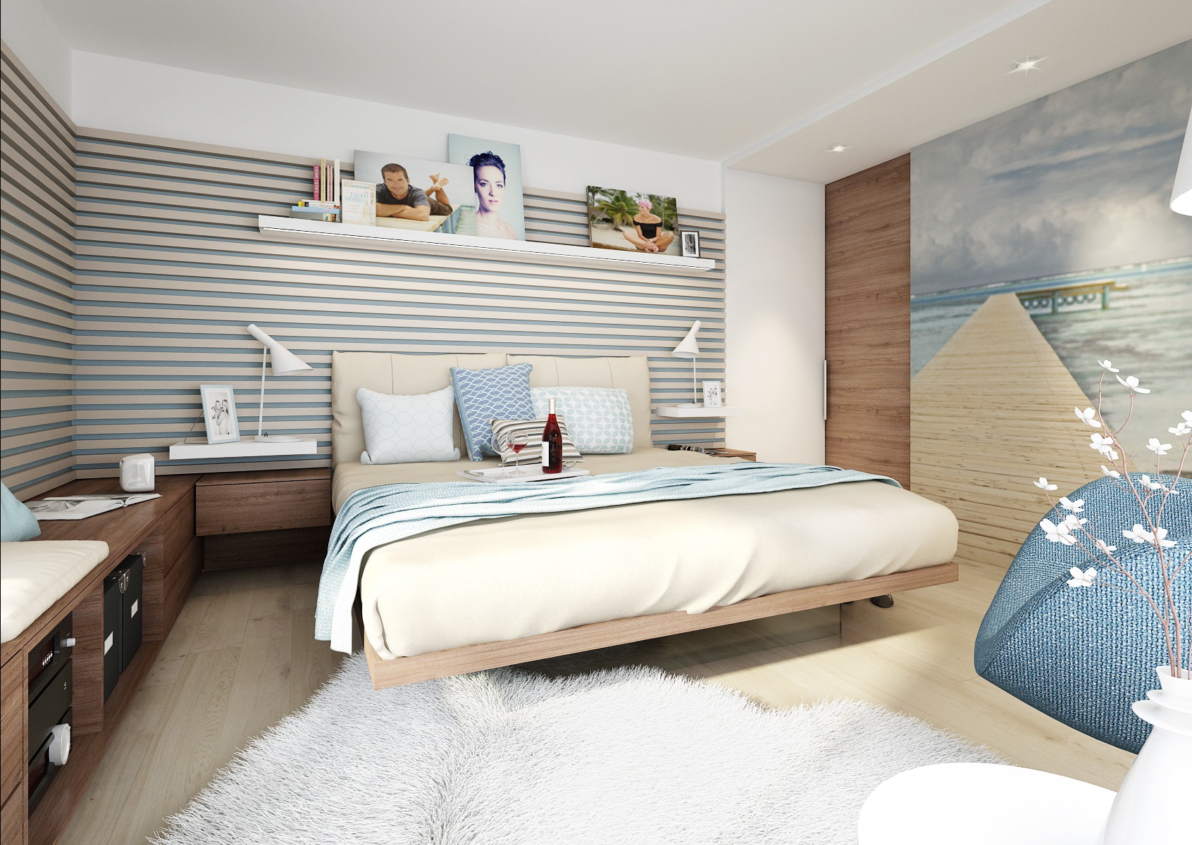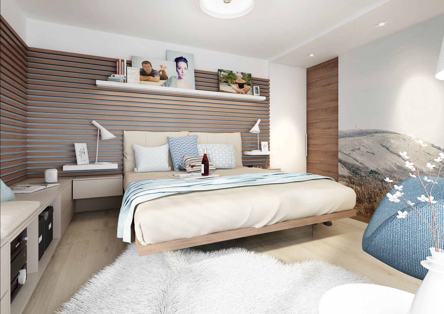 Dřevěné obložení hranolky na stěnách mají jak dekorační tak i praktickou funkci. Lze do mezer vkládat police a pohybovat s nimi. Dalším charakteristickým prvkem ložnice je velkoformátová fototapeta s vlastním vzorem od klienta.
